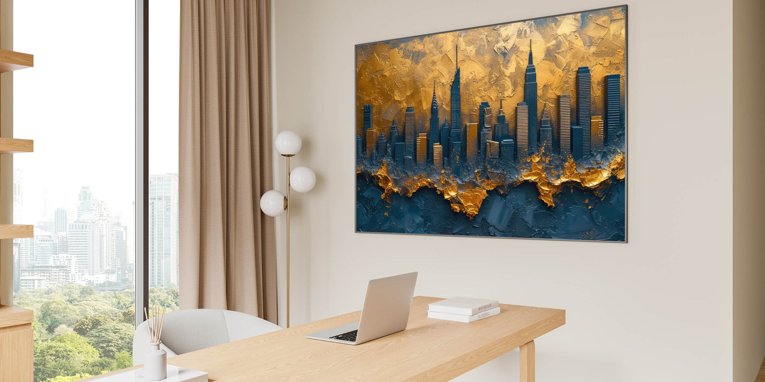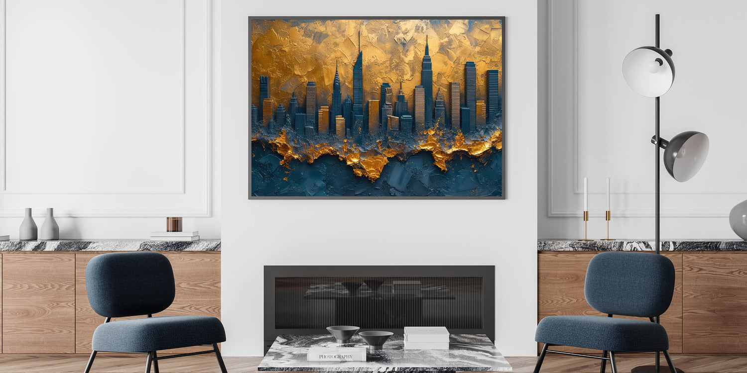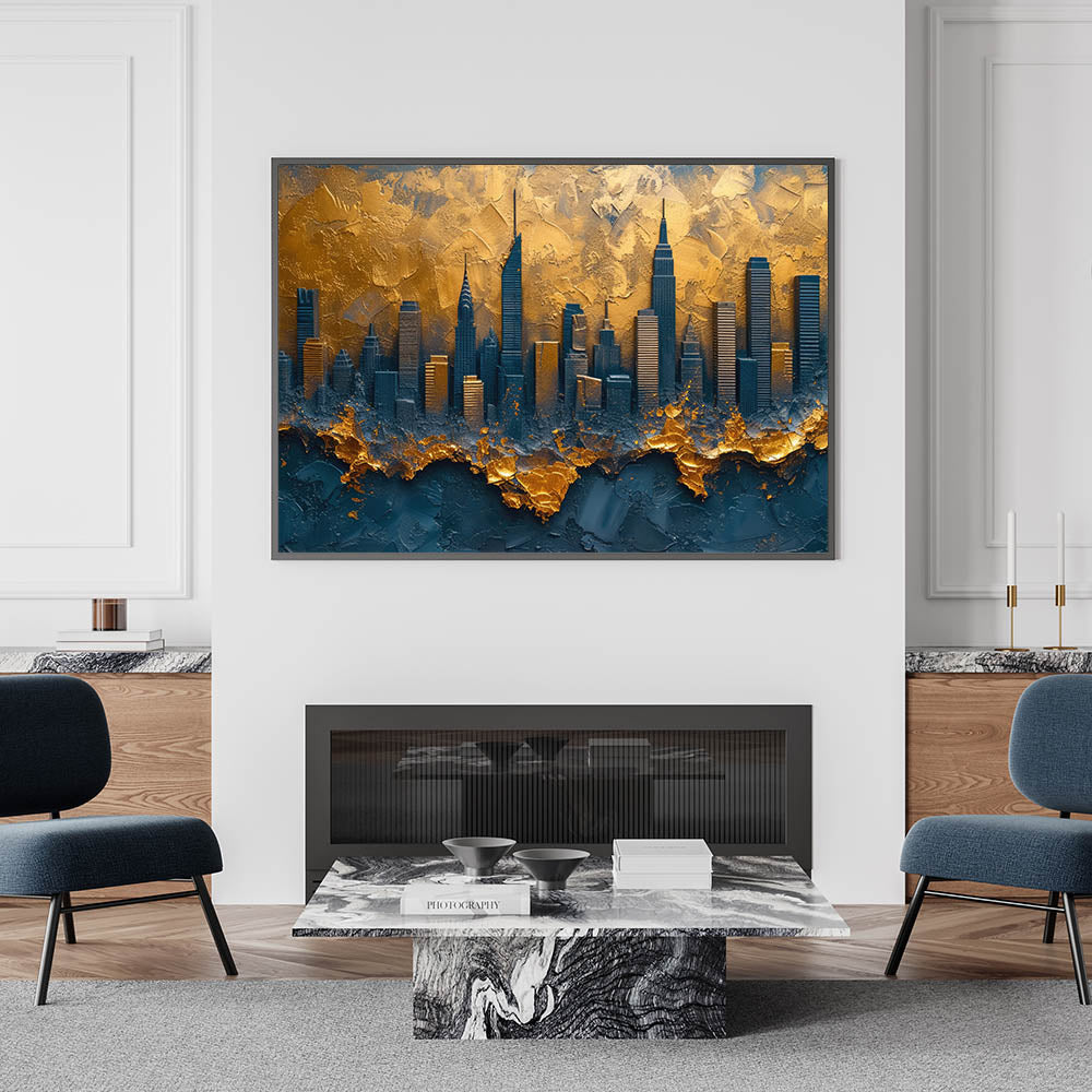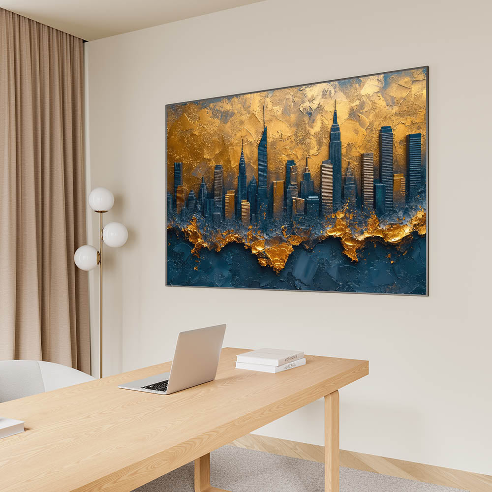 Enhance your workspace with this striking Office Wall Art, featuring a bold gold and navy blue city skyline in a textured, abstract style. This Modern Office Art is designed to elevate Corporate Wall Decor, making it a perfect centerpiece for executive offices, boardrooms, and luxury business settings. The deep navy hues contrast beautifully with radiant gold accents, creating an artistic representation of metropolitan elegance.