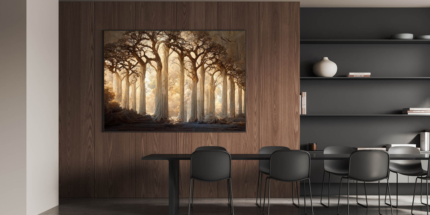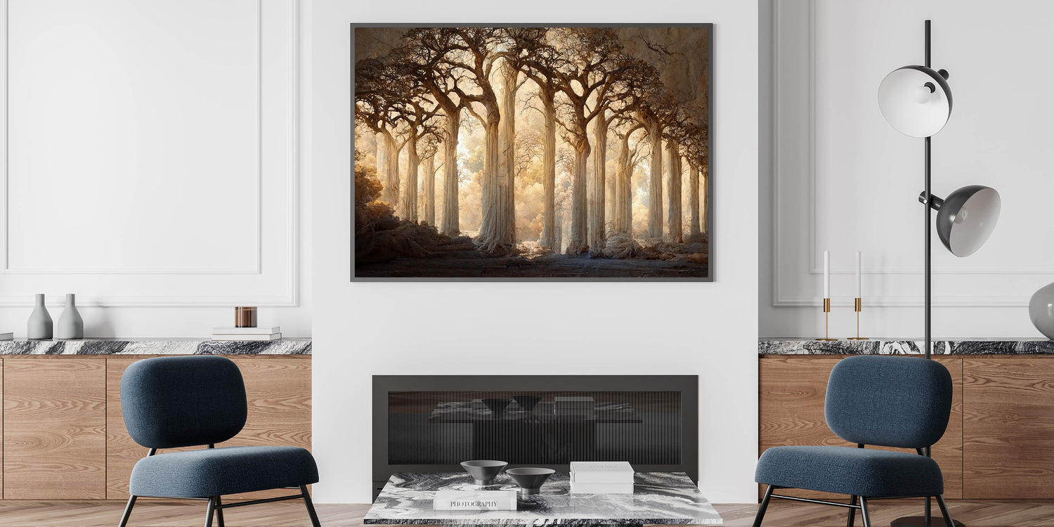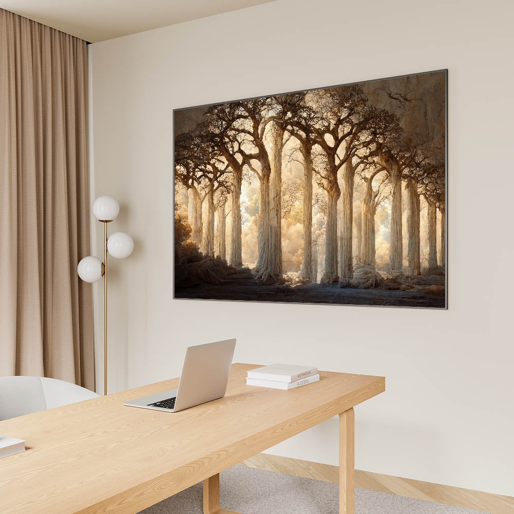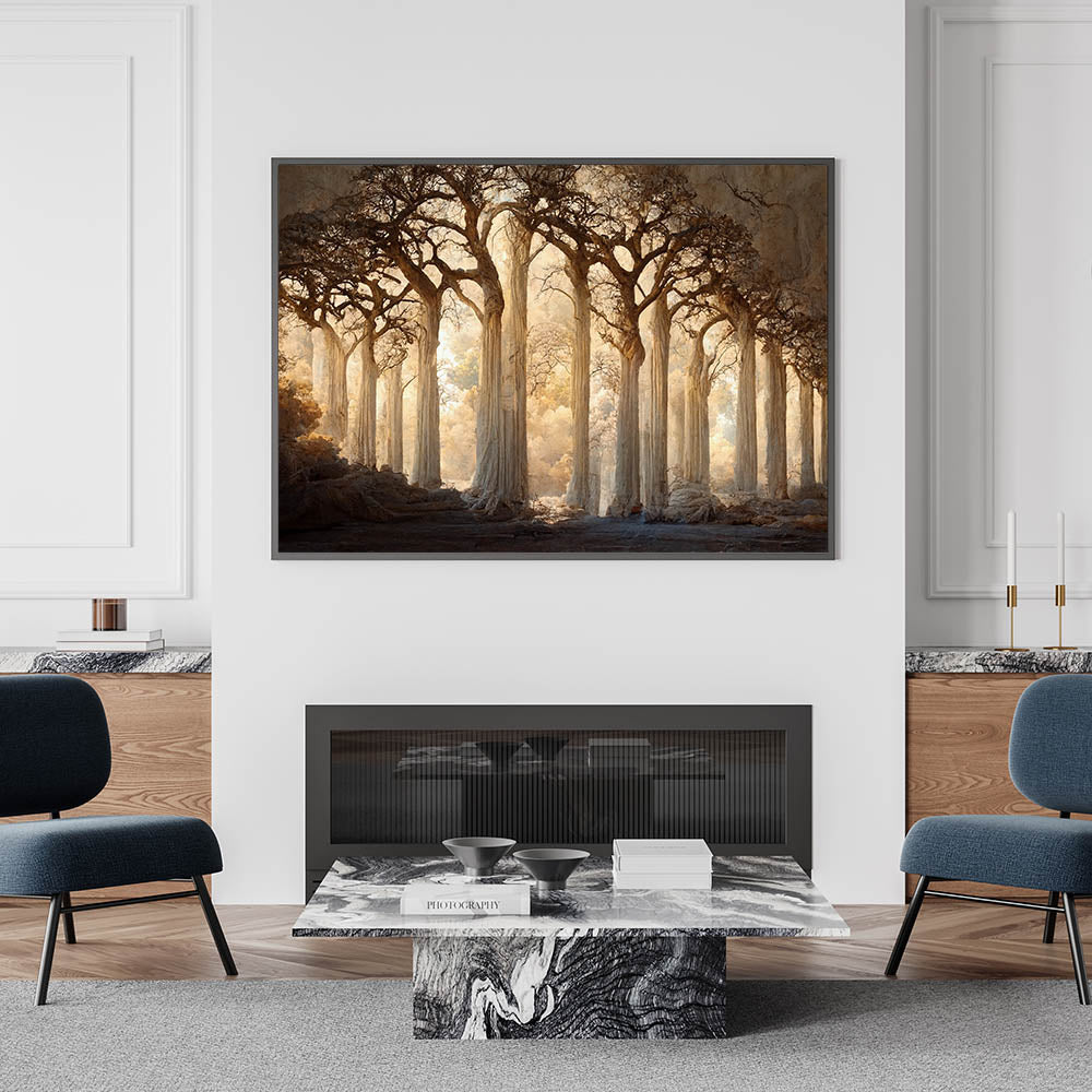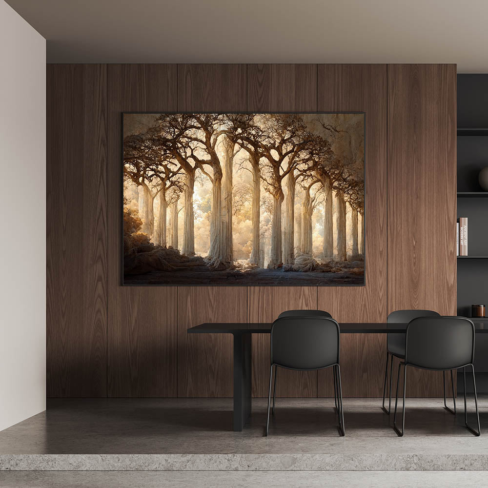 Transform your workspace with this breathtaking Office Wall Art, featuring a surreal forest where towering trees form an elegant archway bathed in golden light. The rich beige, brown, and muted gold tones create a sense of depth and grandeur, making this a perfect choice for Modern Office Art. This unique composition blends nature’s beauty with architectural elegance, making it an ideal piece for Corporate Wall Decor in executive offices, conference rooms, and reception areas.