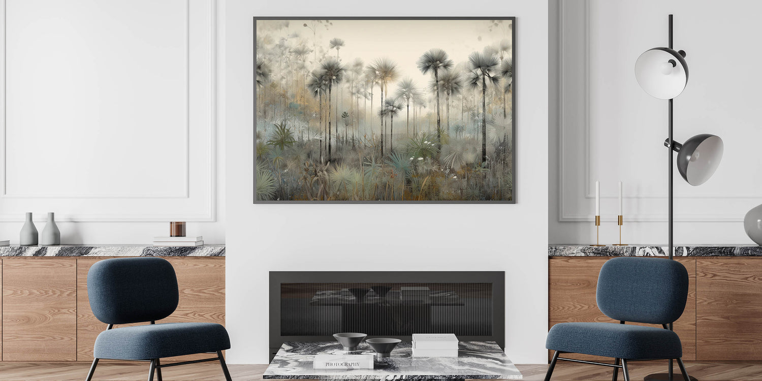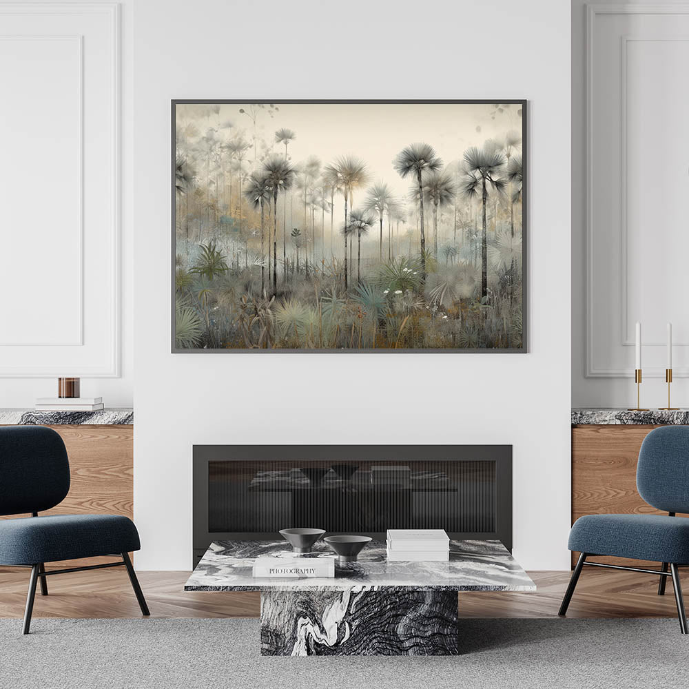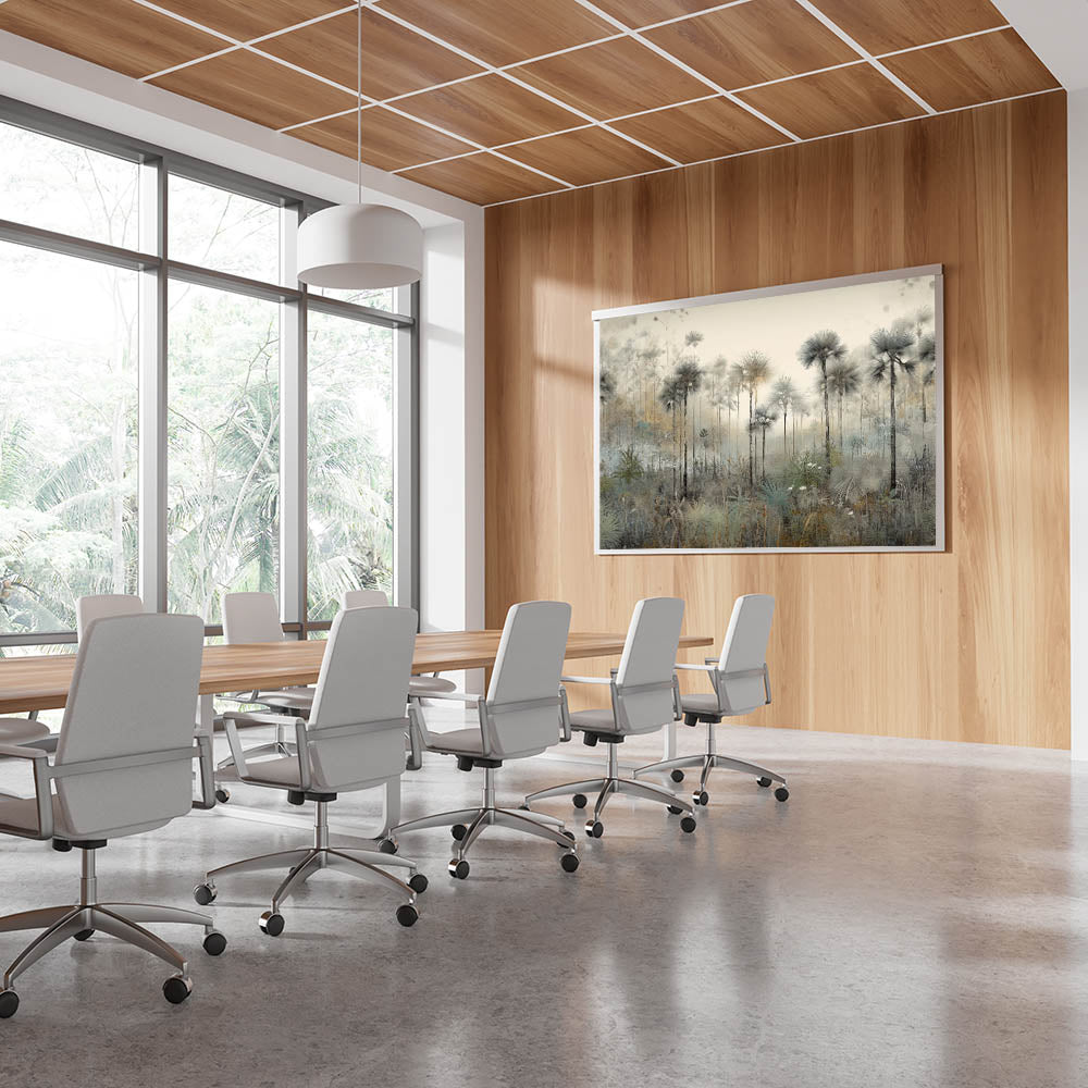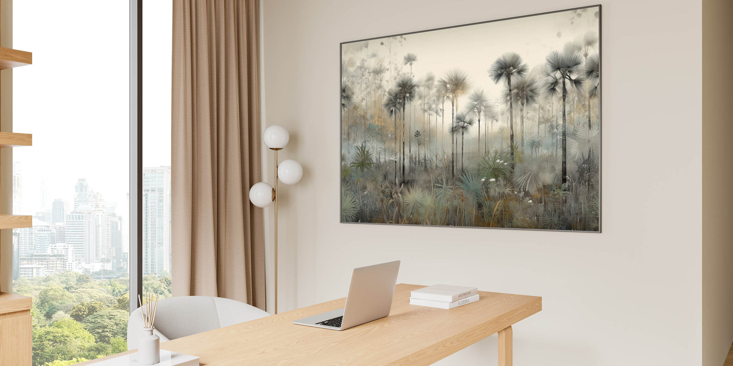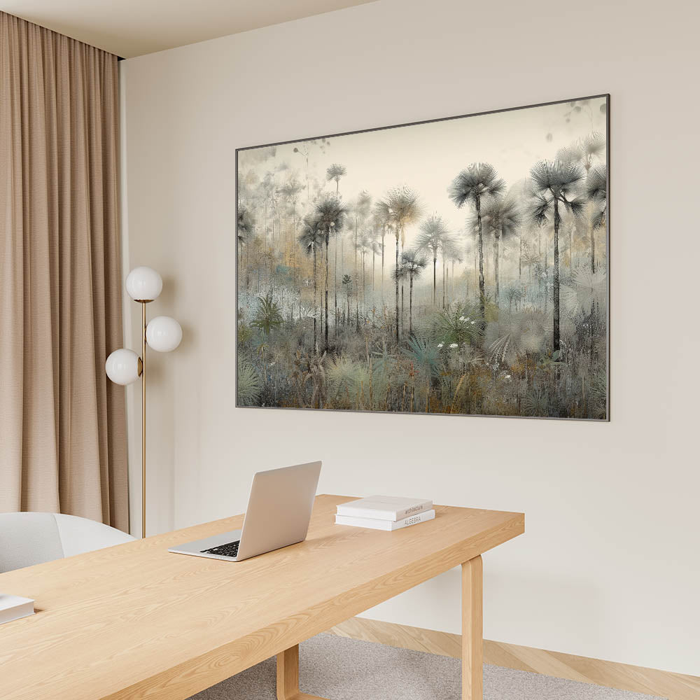 Create a calming and sophisticated office environment with this Office Wall Art, showcasing a serene misty palm forest. This Modern Office Art piece features soft neutral tones of gray, beige, and green, evoking a tranquil and refreshing ambiance. The delicate, detailed artwork makes it a perfect choice for Corporate Wall Decor, adding a refined aesthetic to meeting rooms, executive offices, or professional workspaces.