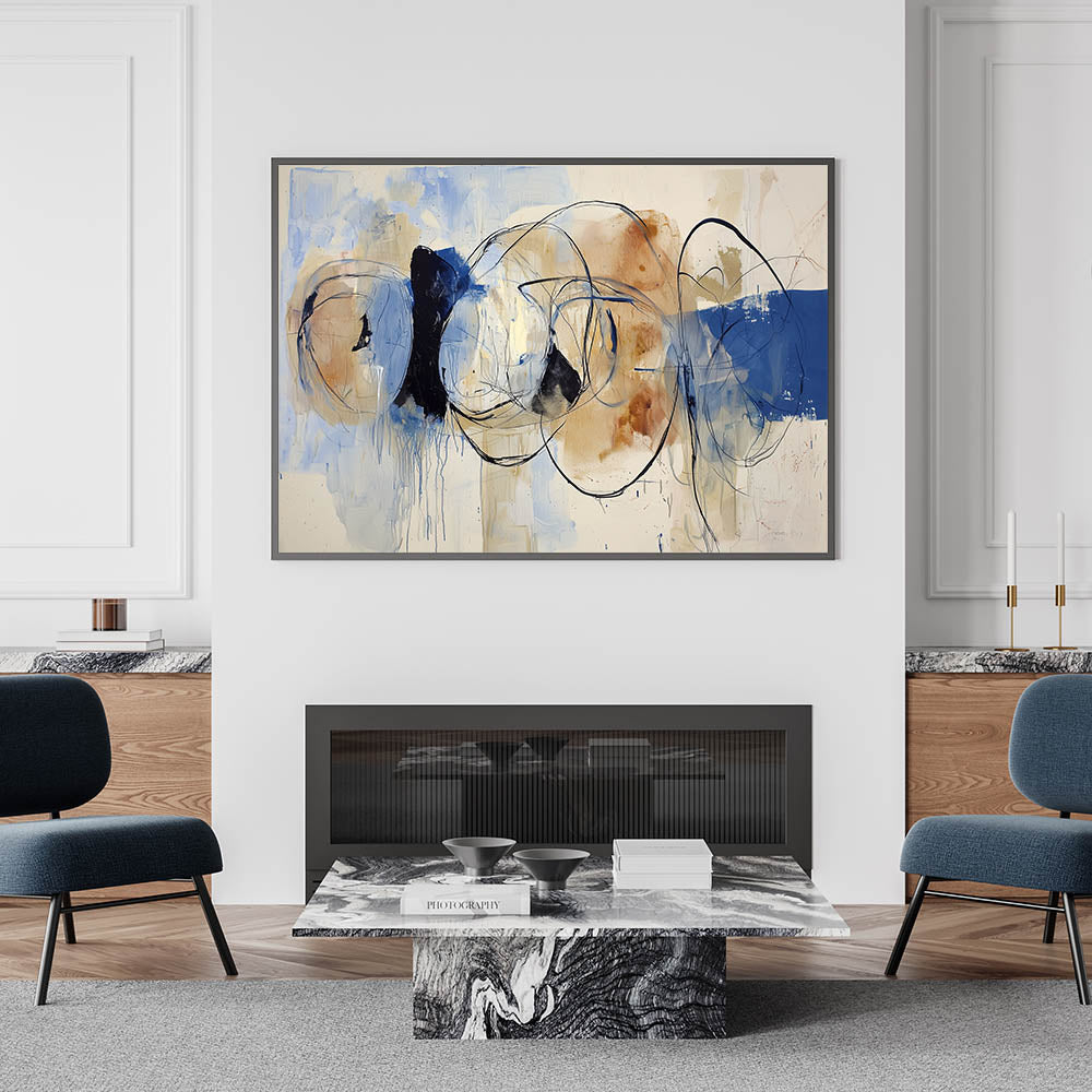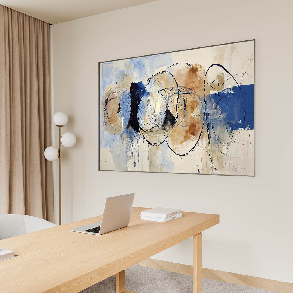 Bring a refined artistic touch to your workspace with this modern office art piece, a sophisticated blend of soft blue, beige, and black with fluid, expressive lines. This corporate wall decor piece embodies movement and balance, making it an ideal statement piece for offices, boardrooms, and contemporary workspaces. The abstract design offers a perfect blend of creativity and professionalism, enhancing business wall art aesthetics.