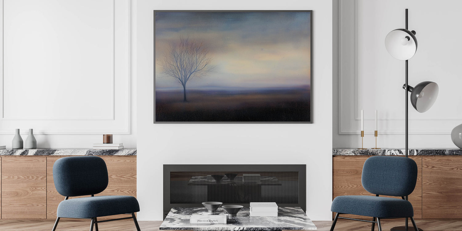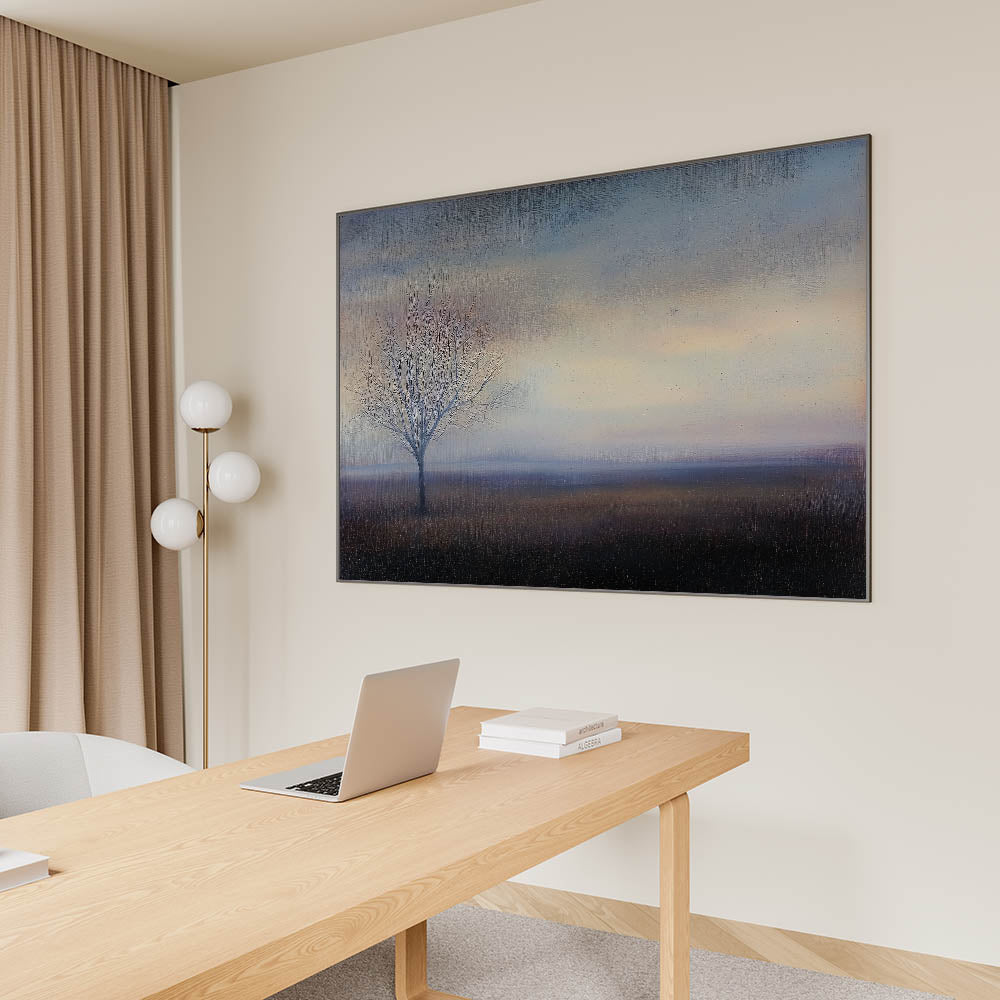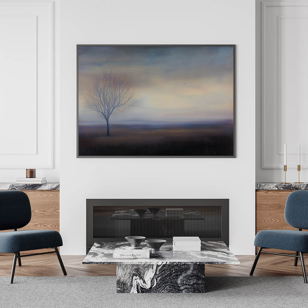 Add a touch of calm and sophistication to your workspace with this office art print, featuring a minimalist and serene lone tree in a misty landscape. The muted blend of gray-blue, beige, and deep brown tones creates a soothing and professional aesthetic, perfect for corporate wall decor. This artwork’s peaceful composition makes it ideal for business wall art, enhancing conference rooms, executive suites, and workspaces with a refined artistic touch.
