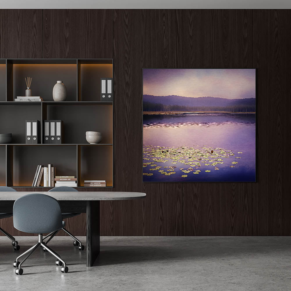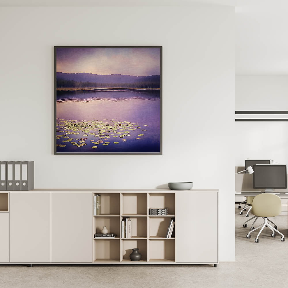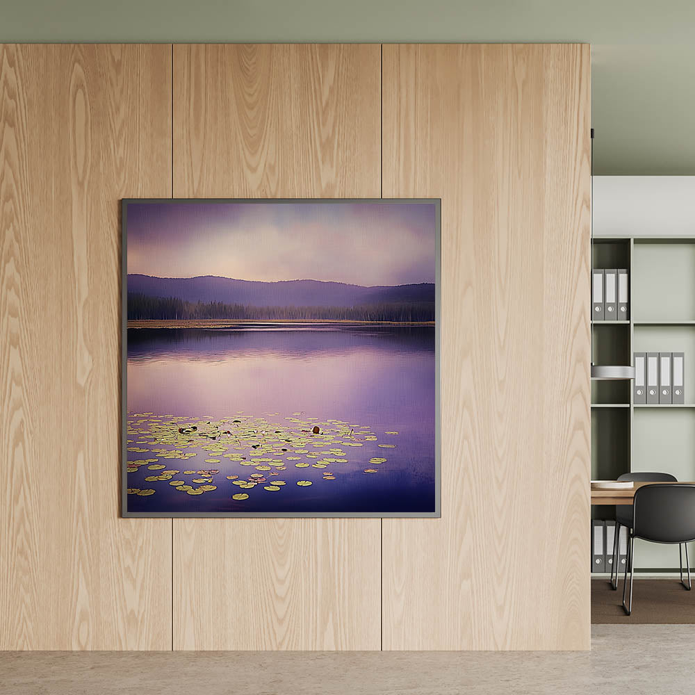 Bring a serene and sophisticated ambiance to your workspace with this office art print, featuring a stunning purple-hued lake landscape. The soft reflections on the water, combined with floating lily pads and distant mountain silhouettes, create a peaceful and inspiring setting for corporate wall decor. The blend of lavender, muted blue, and soft green makes this artwork a perfect choice for business wall art, ideal for boardrooms, executive offices, and reception areas.