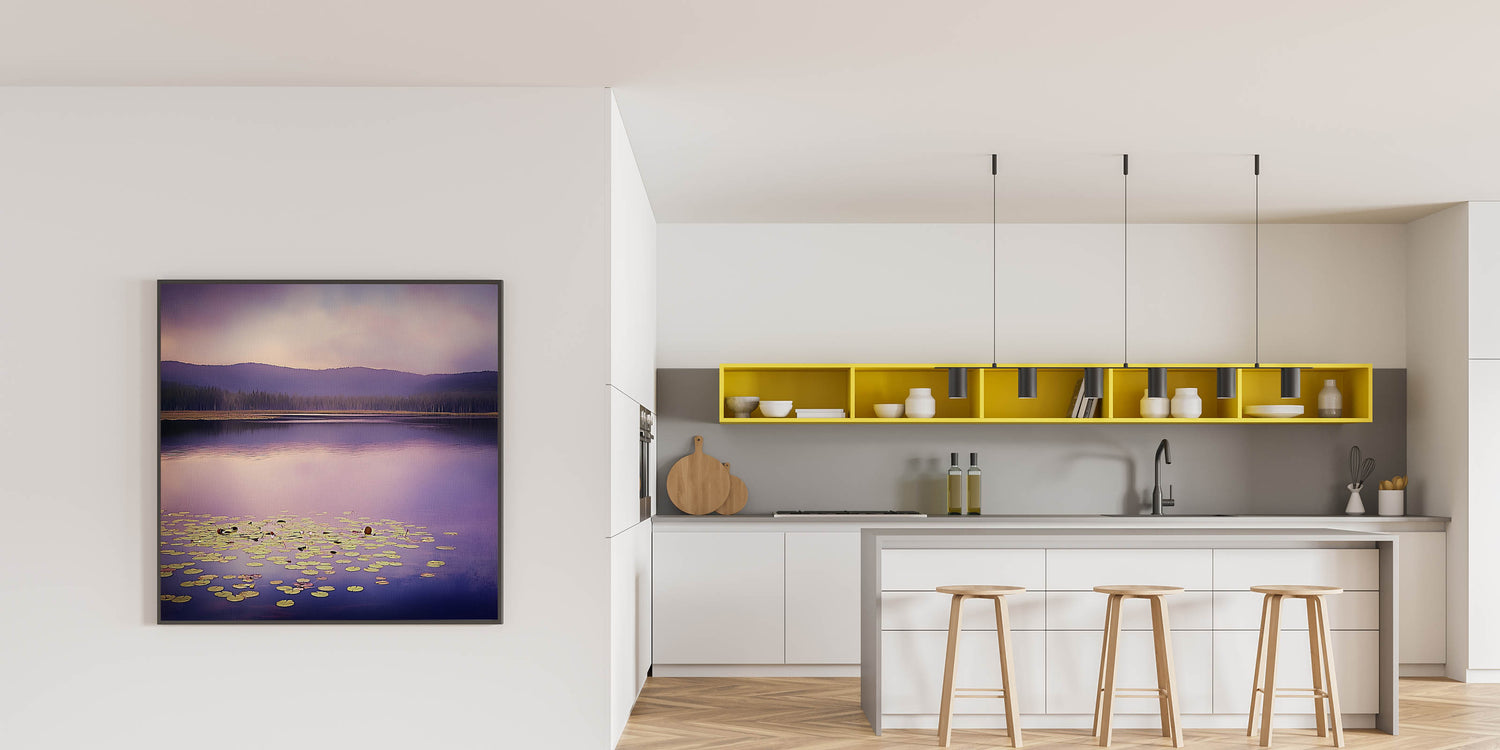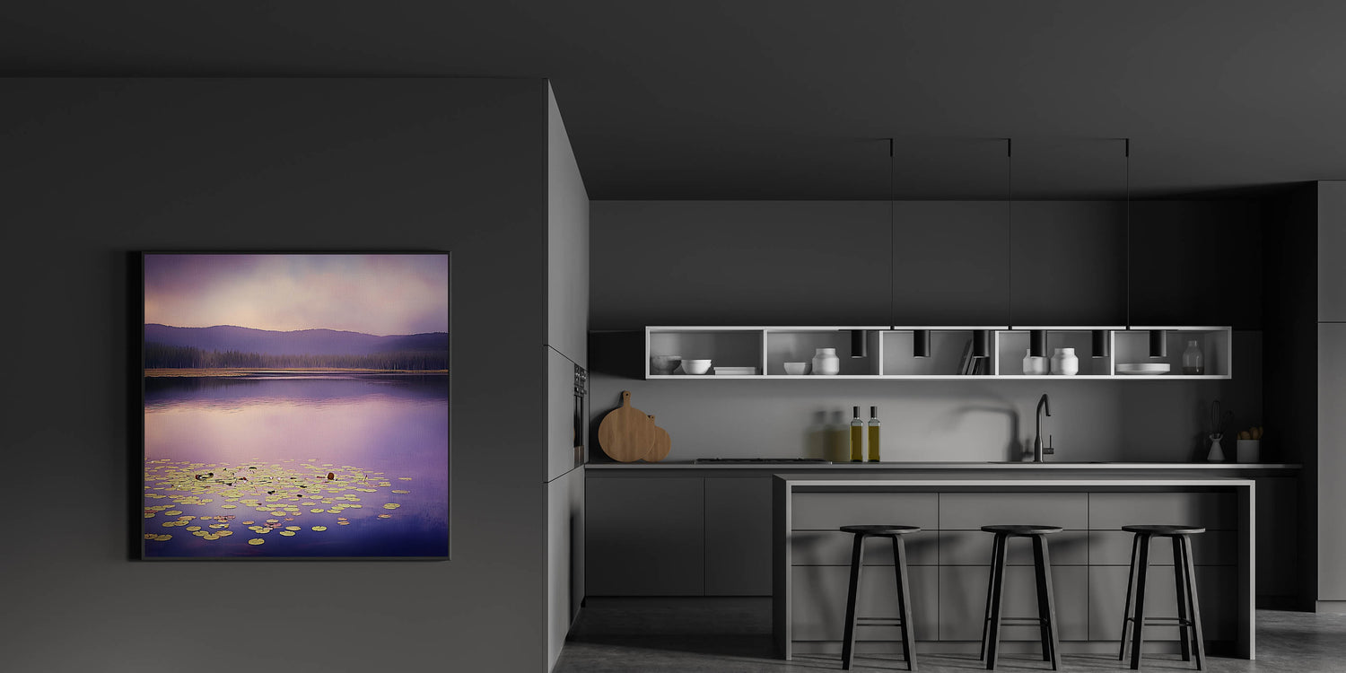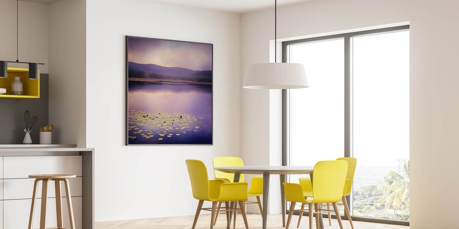 Bring a serene and sophisticated ambiance to your workspace with this office art print, featuring a stunning purple-hued lake landscape. The soft reflections on the water, combined with floating lily pads and distant mountain silhouettes, create a peaceful and inspiring setting for corporate wall decor. The blend of lavender, muted blue, and soft green makes this artwork a perfect choice for business wall art, ideal for boardrooms, executive offices, and reception areas.