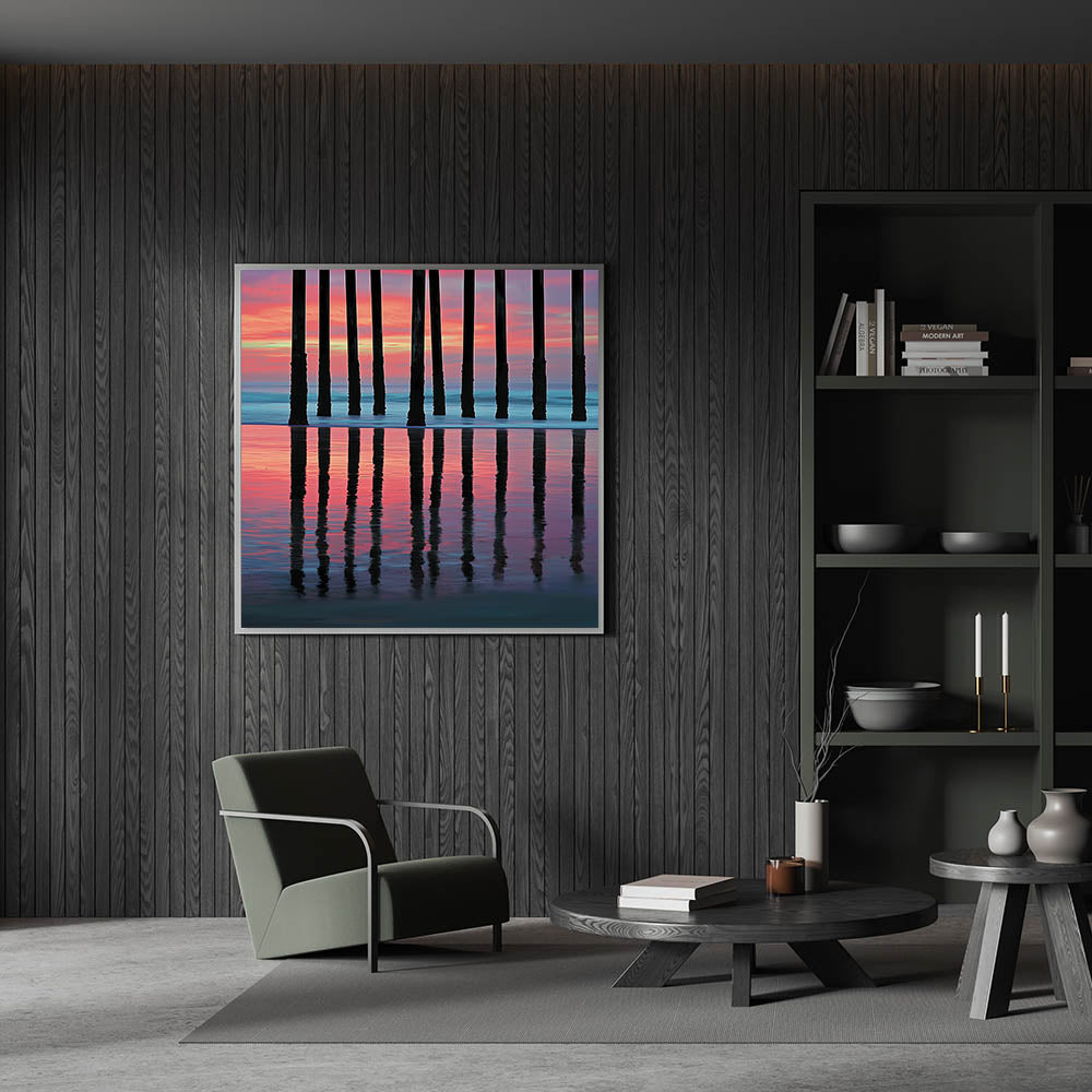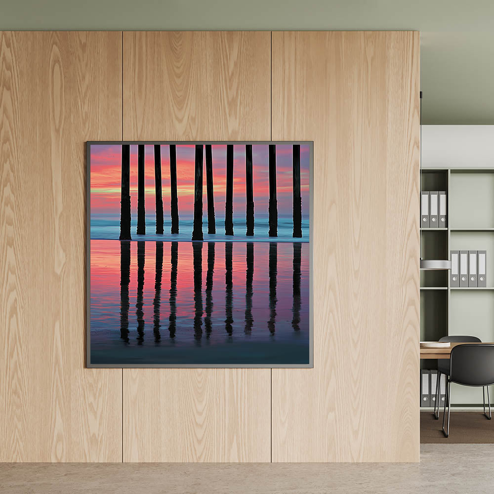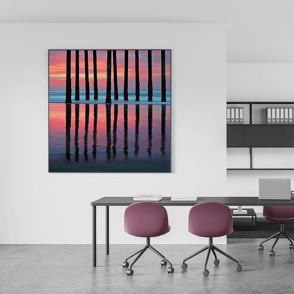 Add a captivating and modern touch to your workspace with this office canvas print, showcasing a breathtaking sunset pier reflection. The vibrant blend of deep pink, soft coral, and tranquil blue hues creates a dynamic and inspiring visual, making it an ideal addition to corporate wall decor. The dramatic contrast between the silhouetted pier posts and the colorful water reflections adds depth and movement, perfect for business wall art in executive offices, conference rooms, and creative workspaces.