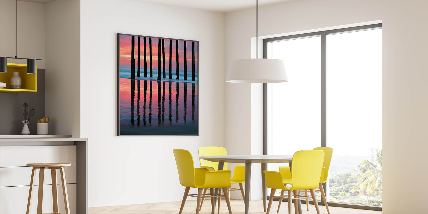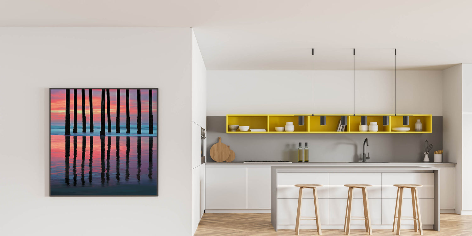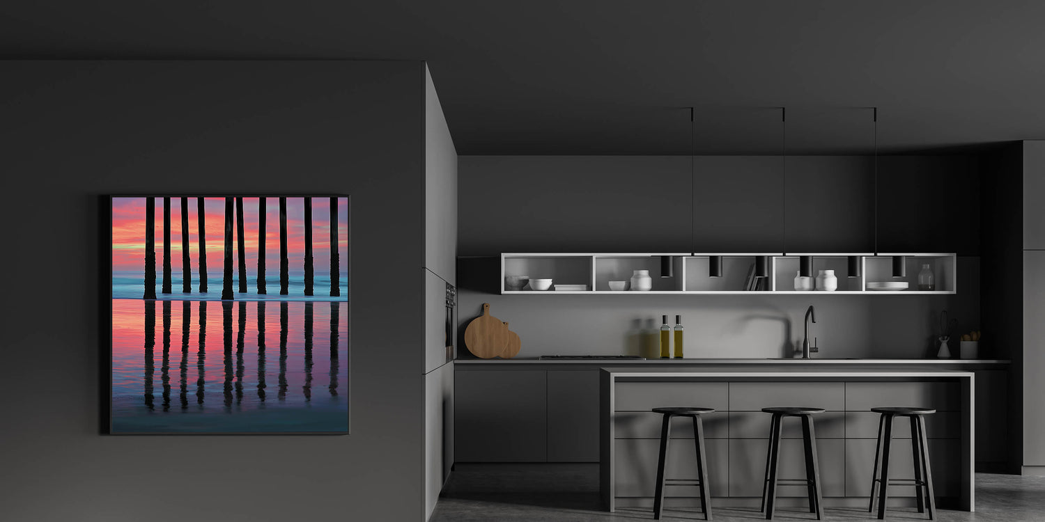 Add a captivating and modern touch to your workspace with this office canvas print, showcasing a breathtaking sunset pier reflection. The vibrant blend of deep pink, soft coral, and tranquil blue hues creates a dynamic and inspiring visual, making it an ideal addition to corporate wall decor. The dramatic contrast between the silhouetted pier posts and the colorful water reflections adds depth and movement, perfect for business wall art in executive offices, conference rooms, and creative workspaces.