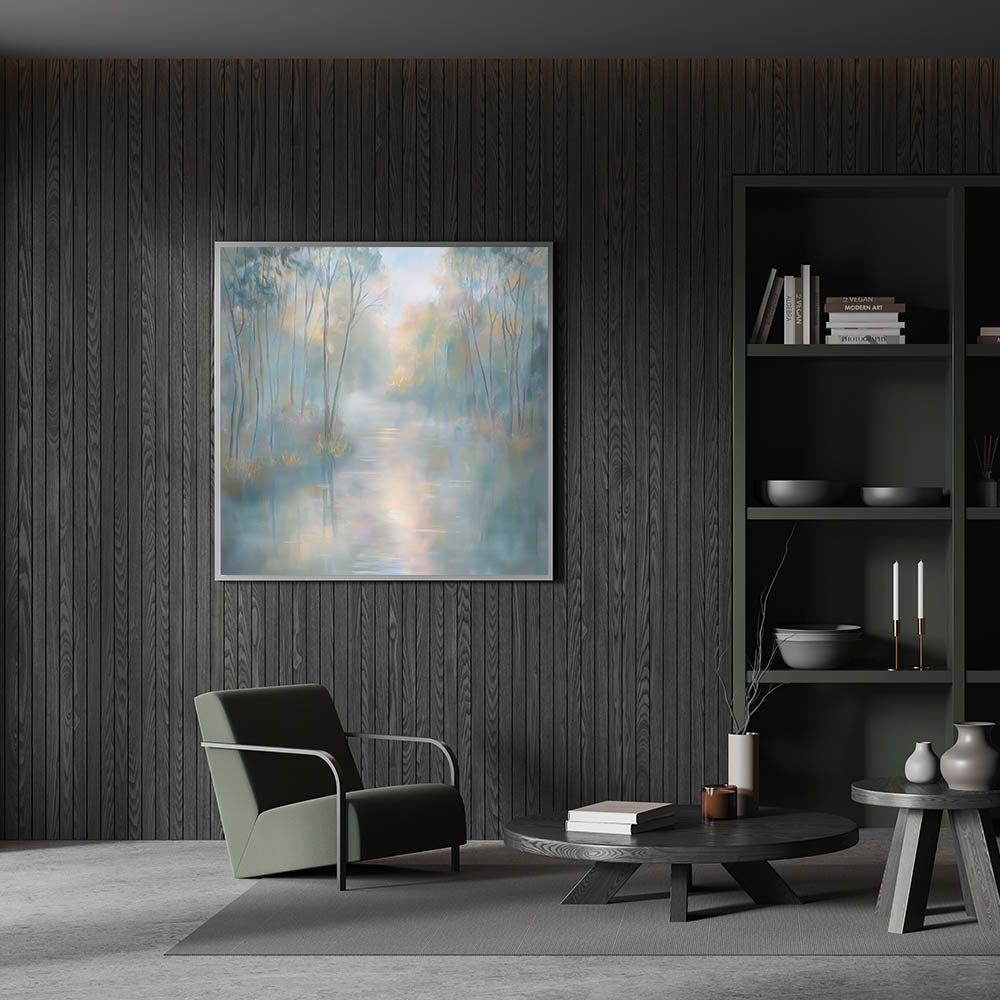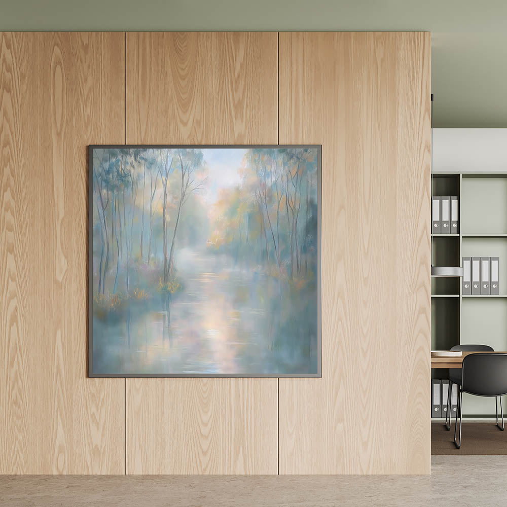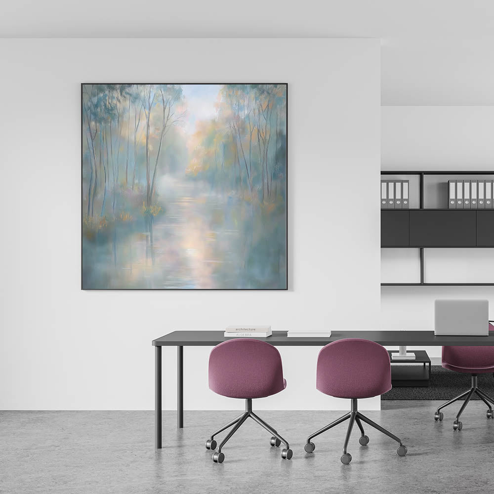 Enhance your workspace with this office interior art, a beautifully serene nature-inspired painting that brings a touch of tranquility to professional settings. Featuring a soft blend of misty blue, pastel greens, and warm beige accents, this artwork exudes calmness, making it an excellent addition to corporate wall decor. The delicate brushstrokes and reflective water elements create an immersive and soothing atmosphere, ideal for business wall art in boardrooms, executive offices, and waiting areas.