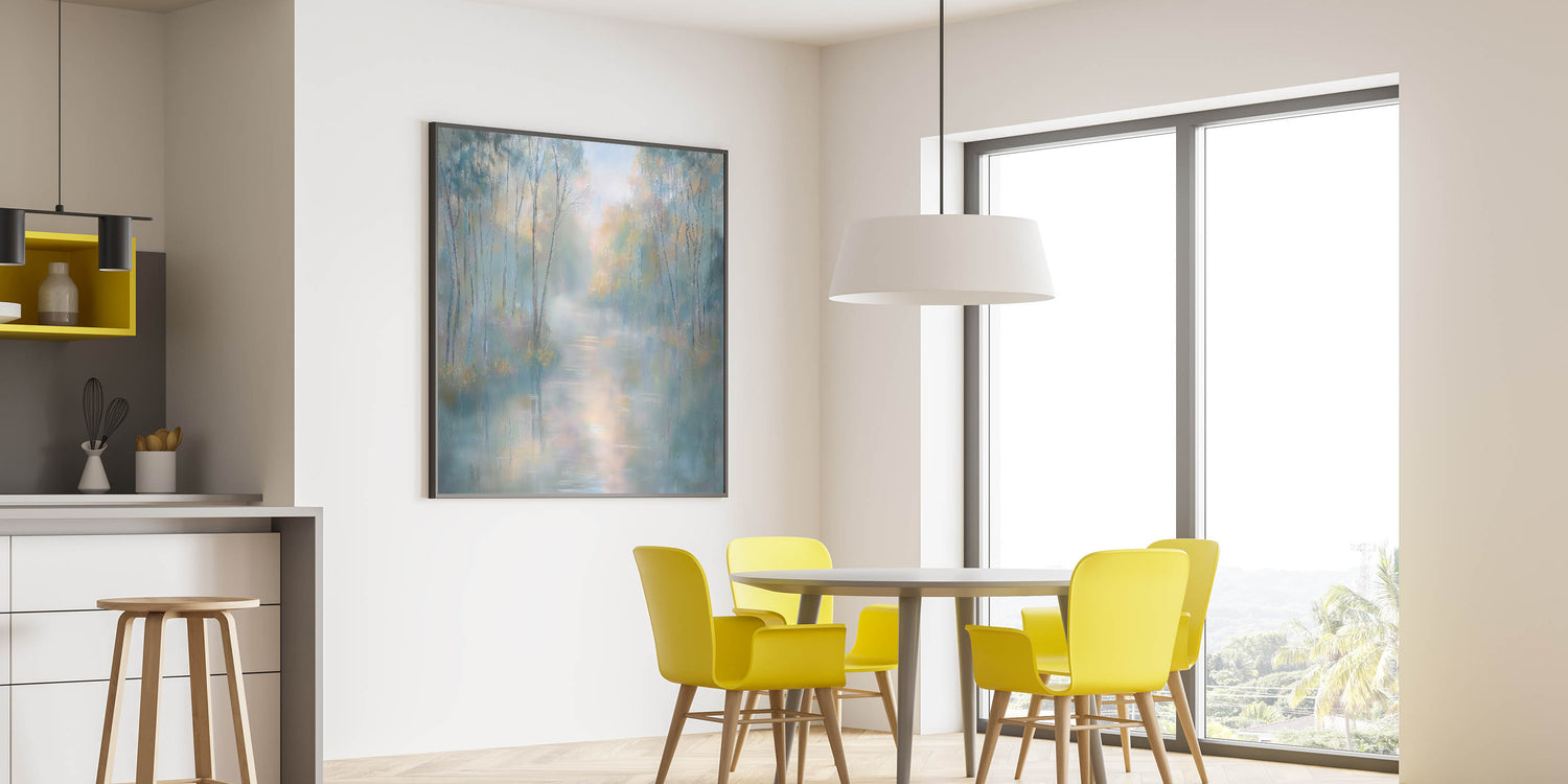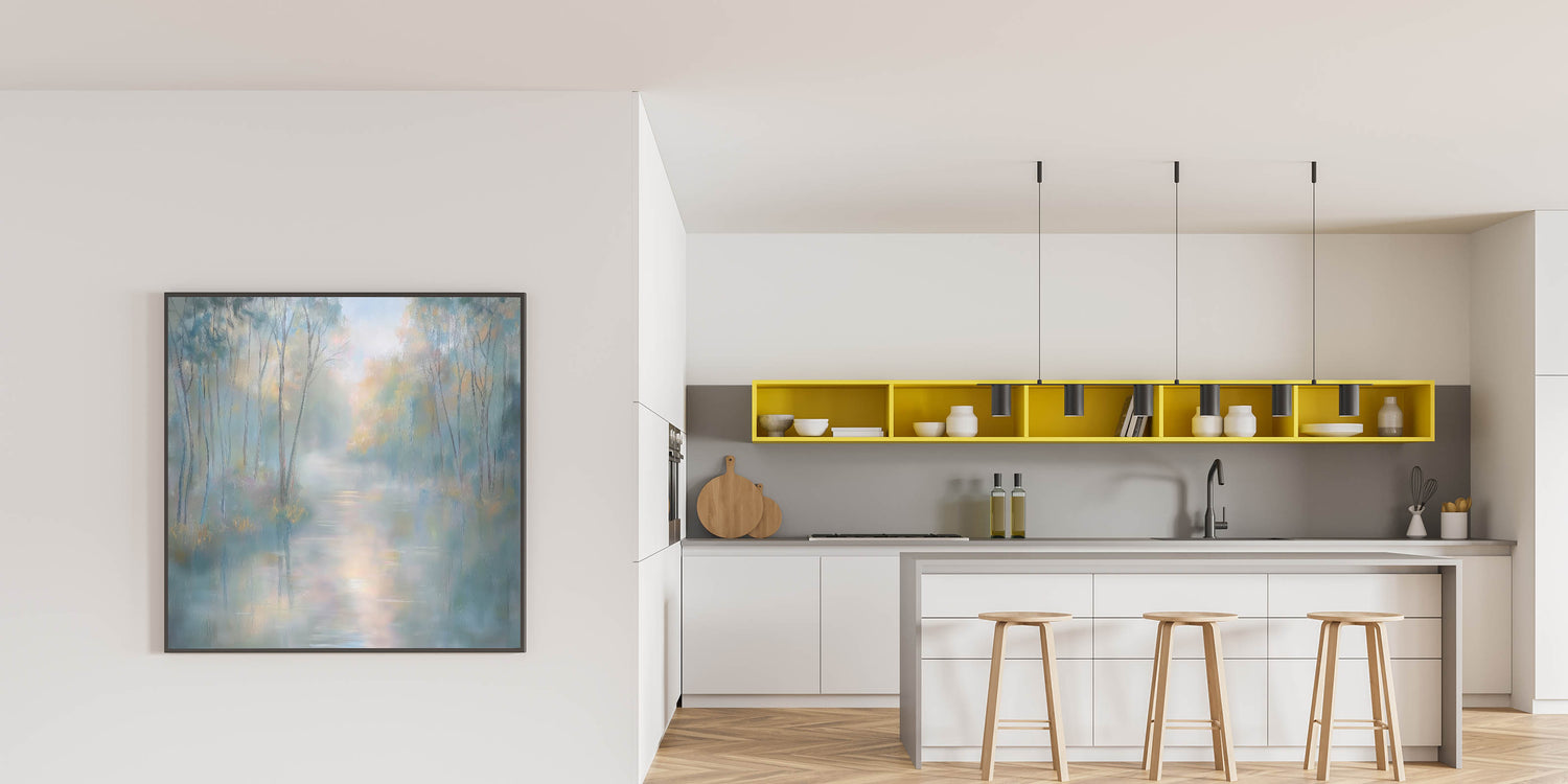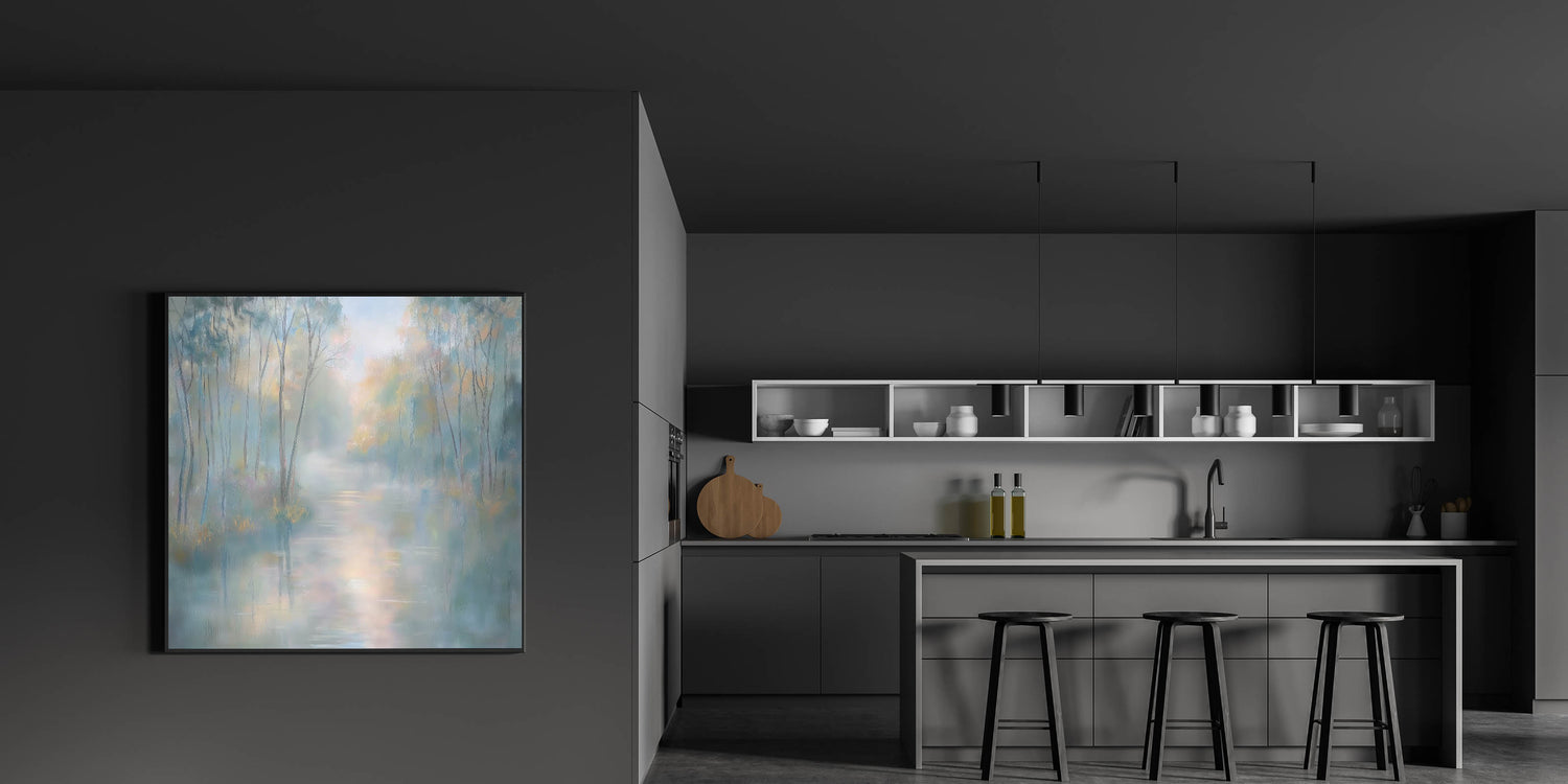 Enhance your workspace with this office interior art, a beautifully serene nature-inspired painting that brings a touch of tranquility to professional settings. Featuring a soft blend of misty blue, pastel greens, and warm beige accents, this artwork exudes calmness, making it an excellent addition to corporate wall decor. The delicate brushstrokes and reflective water elements create an immersive and soothing atmosphere, ideal for business wall art in boardrooms, executive offices, and waiting areas.