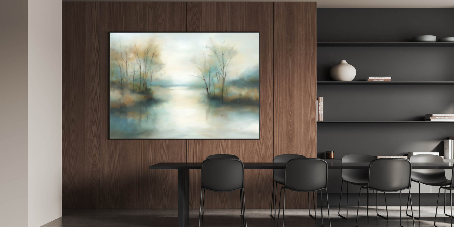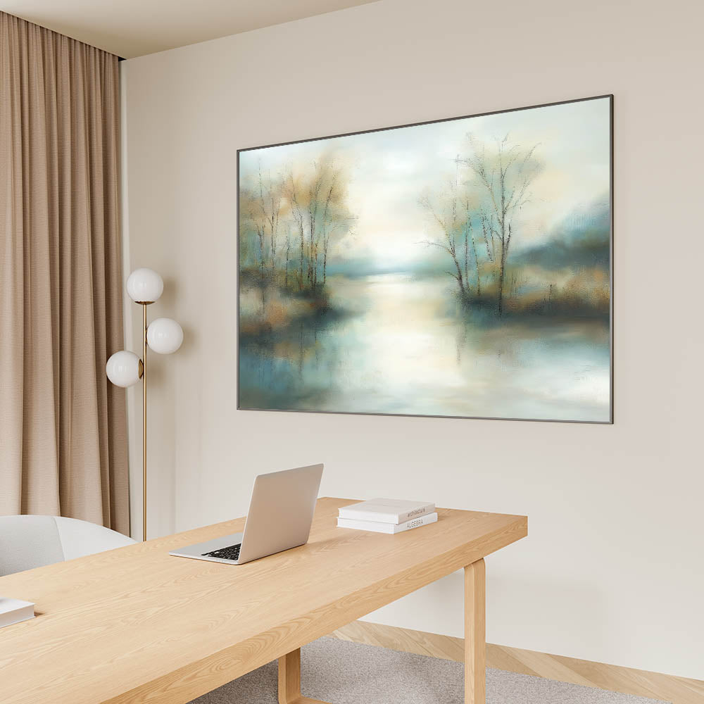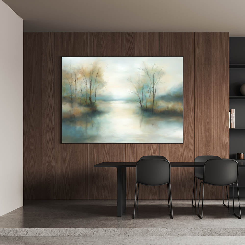 Bring a sense of peace and natural beauty into your workspace with this office wall art, a stunning nature-inspired painting that complements modern office art. Featuring soft hues of muted blue, beige, and subtle green, this artwork evokes a tranquil lakeside setting, perfect for corporate wall decor. The delicate trees and reflective water add a soothing and professional touch, making it ideal for business wall art in executive offices, conference rooms, and reception areas.