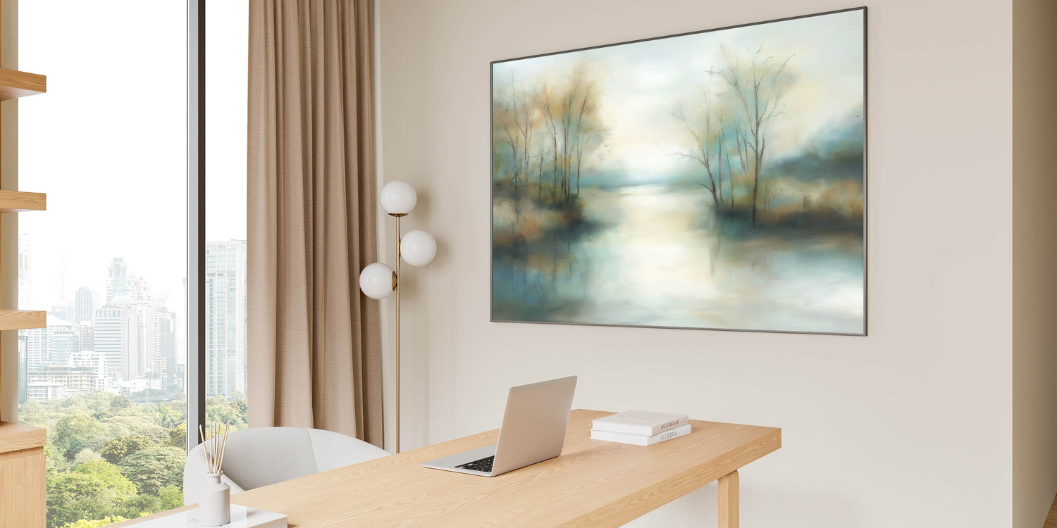 - Serene & Elegant Design – A calming lakeside landscape that enhances office interior art.