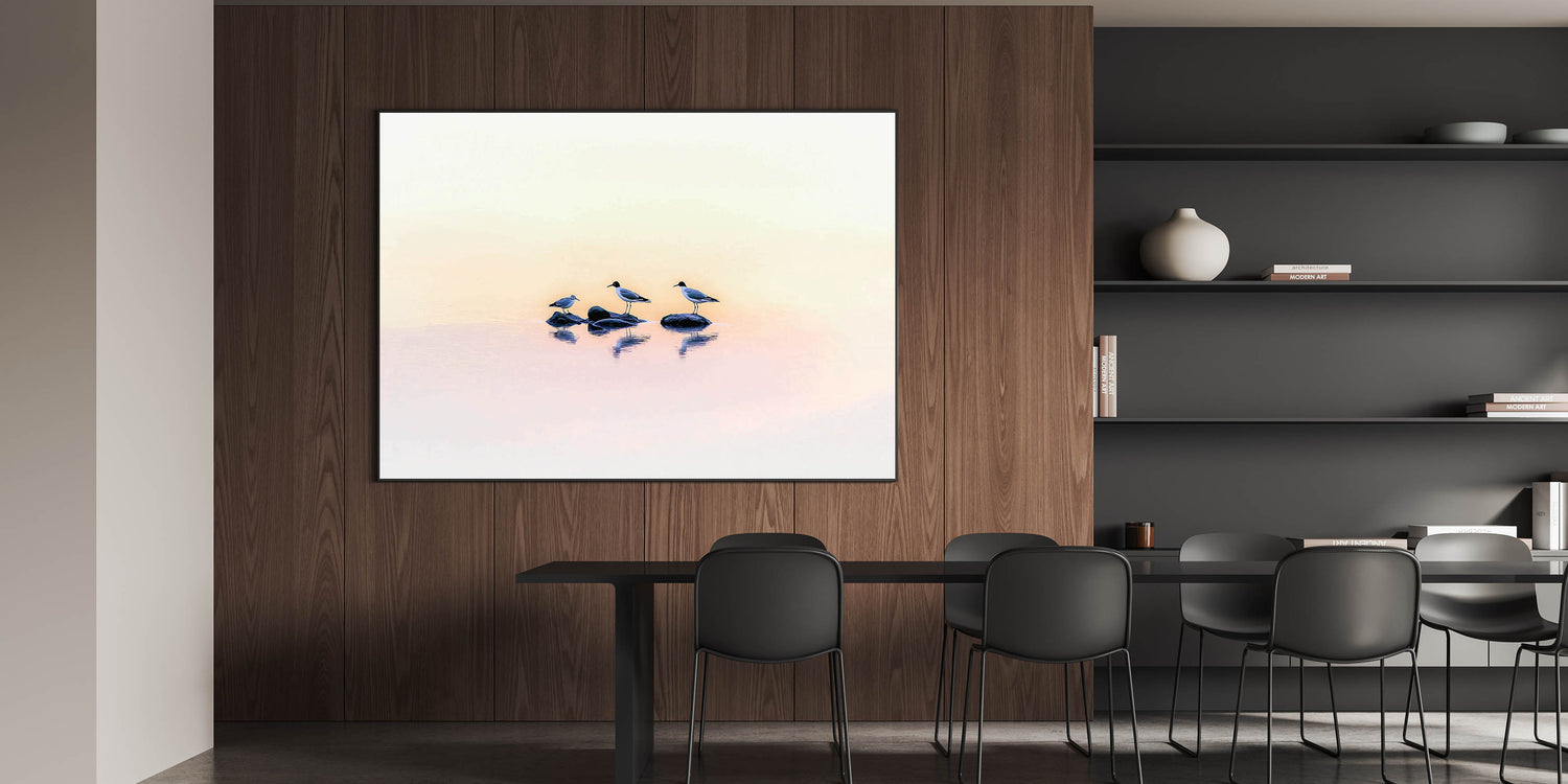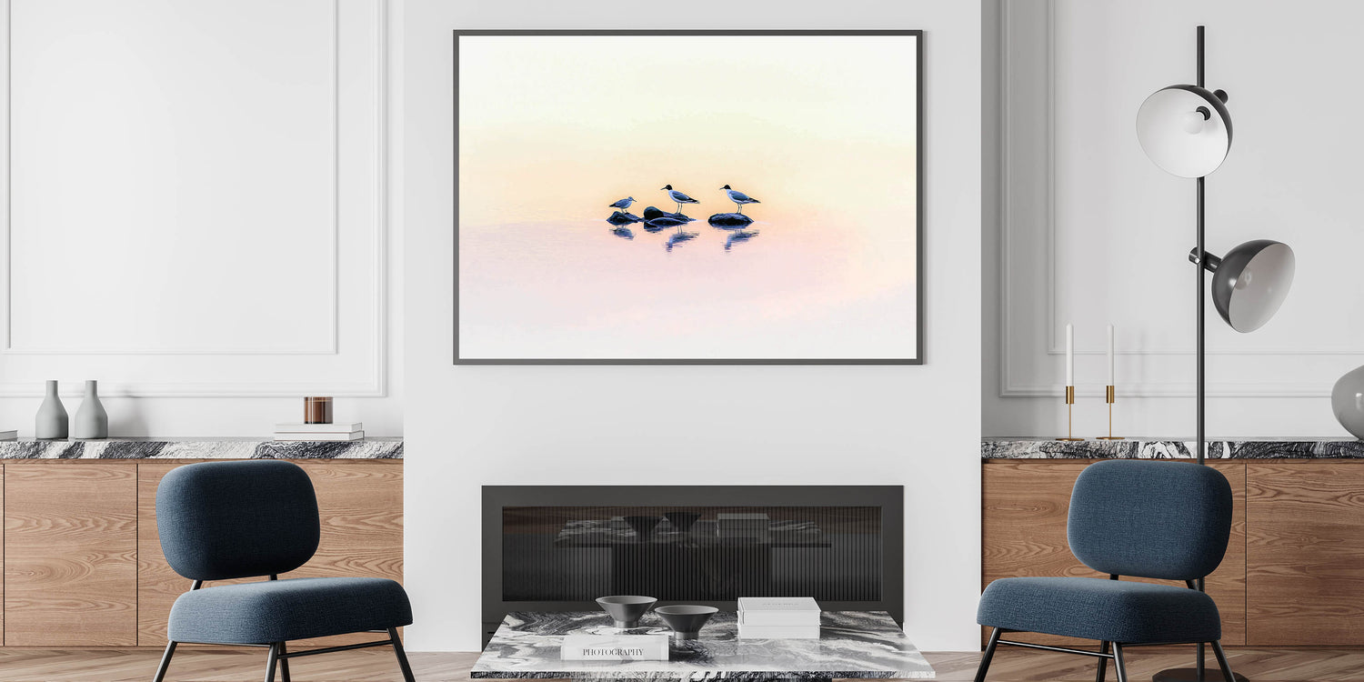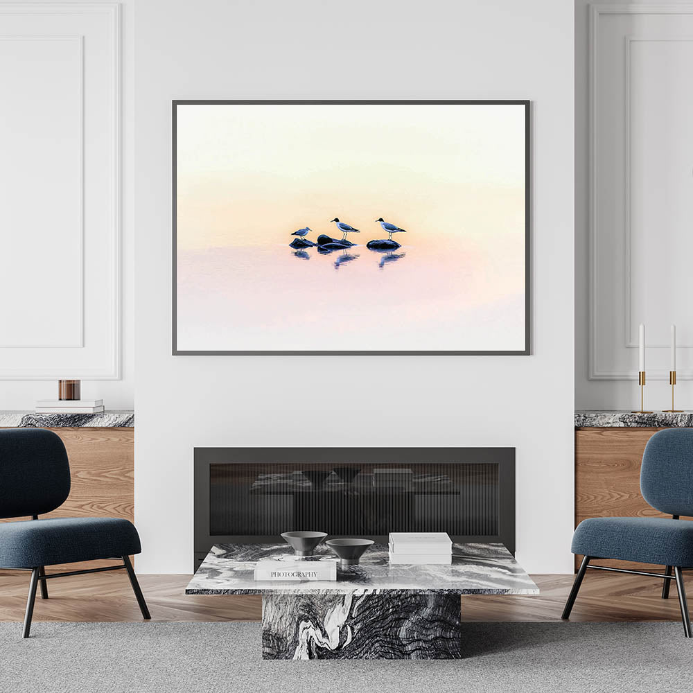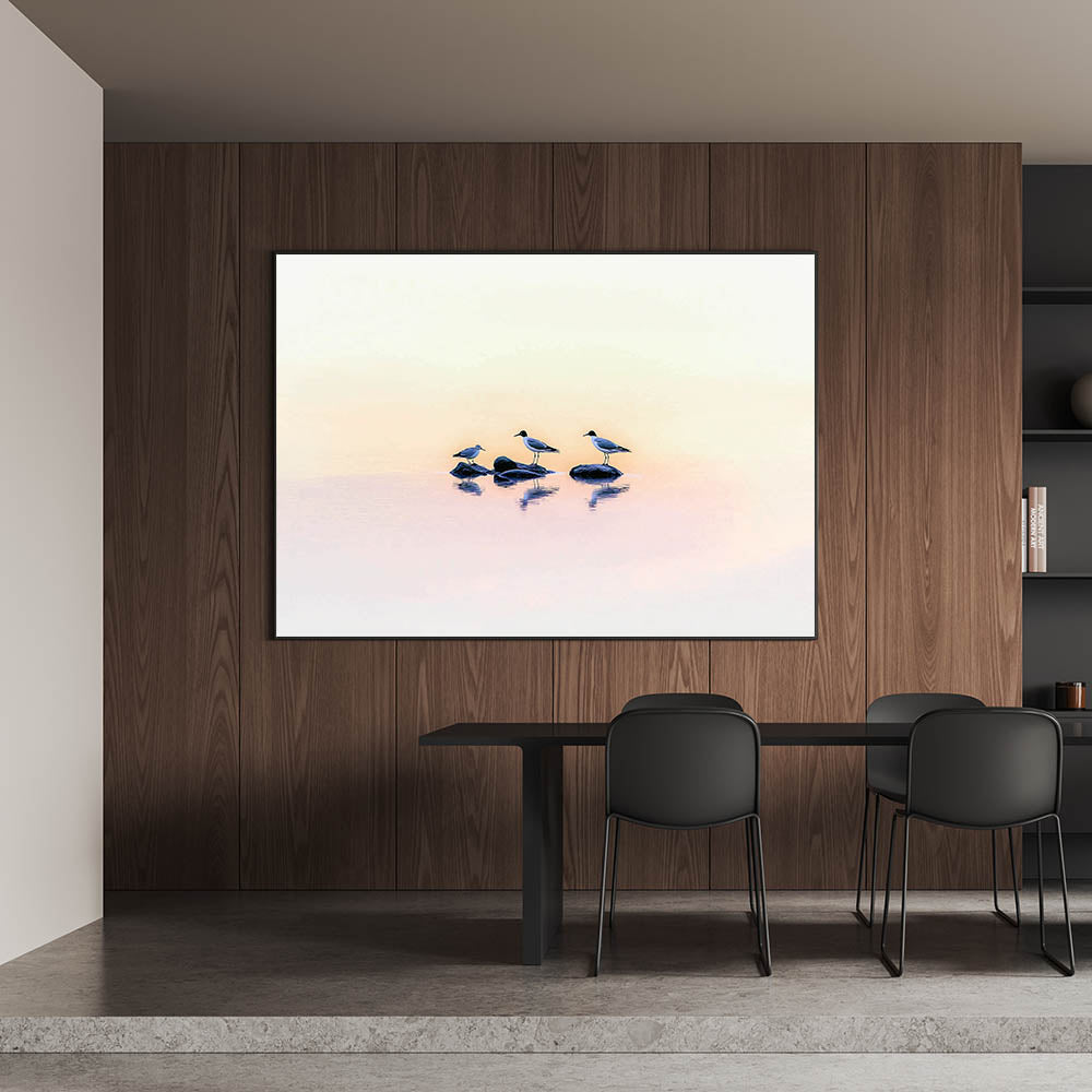 Bring tranquility and elegance into your workspace with this professional office art, featuring a minimalist seascape with serene seagulls on reflective water. The soft pastel tones of peach, pale yellow, and muted blue create a peaceful and professional aesthetic, making it an excellent choice for corporate wall decor. This calming yet modern design adds a sophisticated touch to business wall art, perfect for executive offices, meeting rooms, and reception areas.