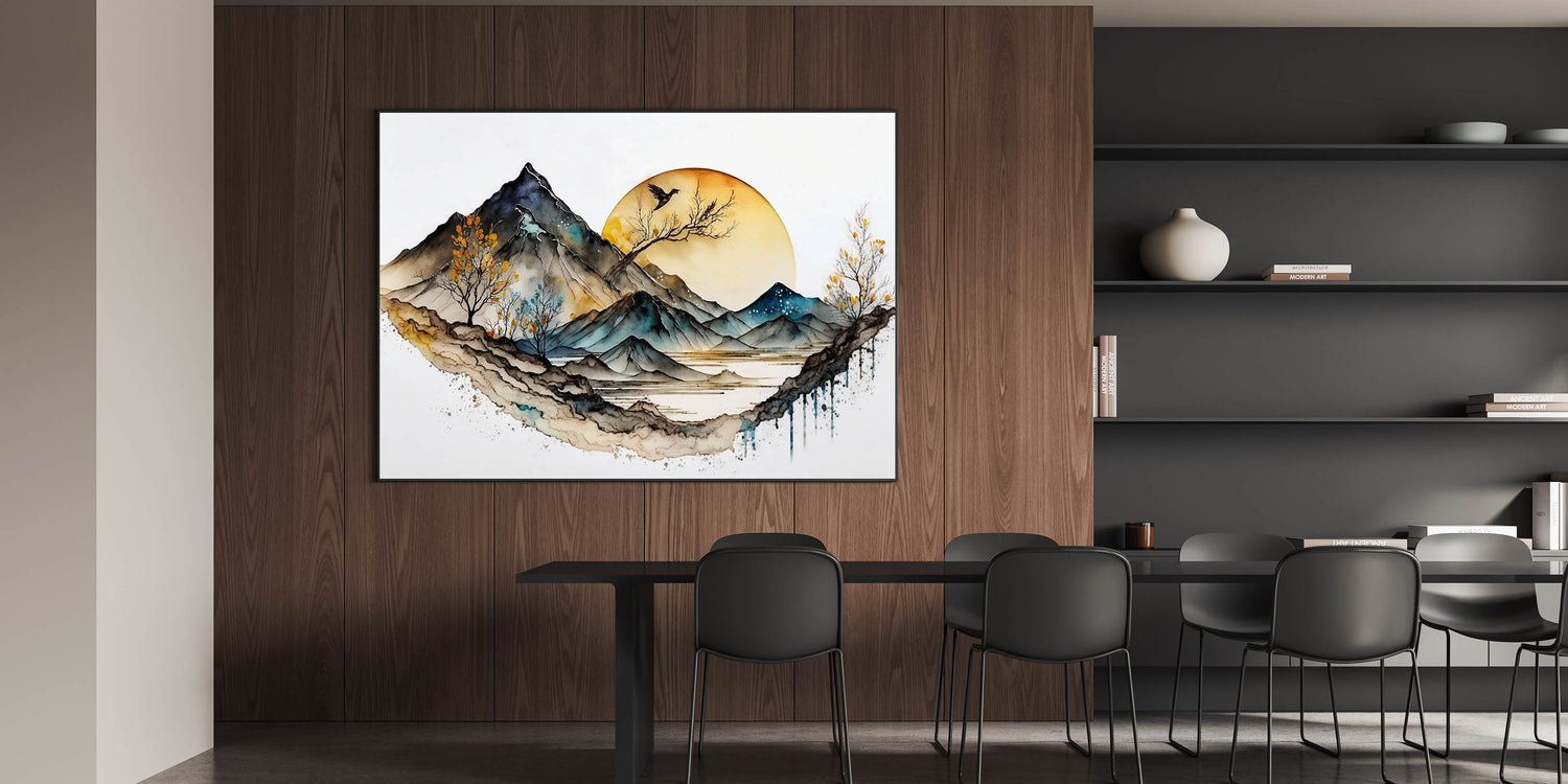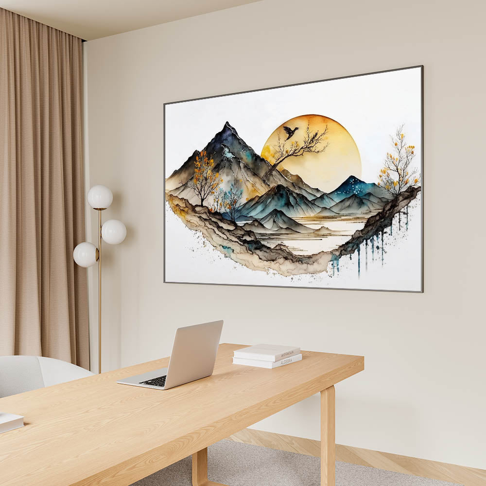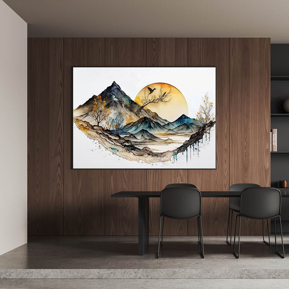 Enhance your workspace with this breathtaking Office Wall Art featuring a serene mountain landscape bathed in warm golden hues. This Modern Office Art blends elegance and tranquility, making it a perfect addition to any corporate or professional setting. The intricate details, from the majestic mountains to the delicate bird in flight, evoke a sense of harmony and inspiration—ideal for Contemporary Office Decor.