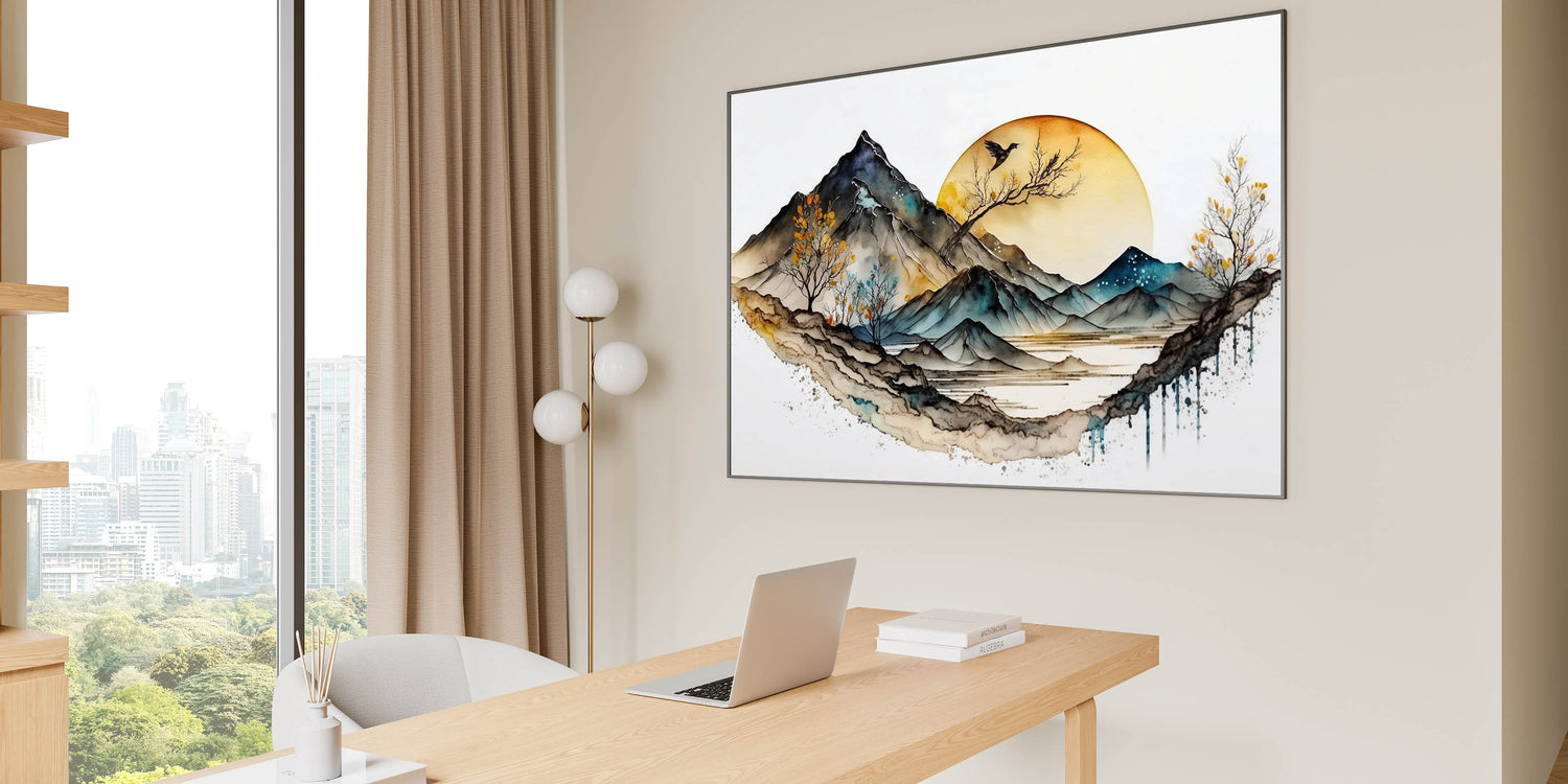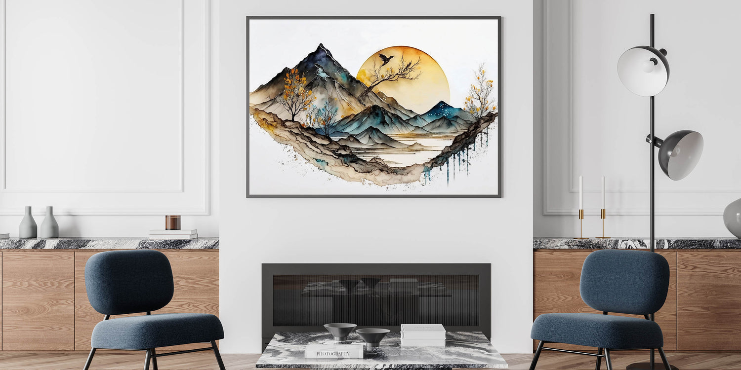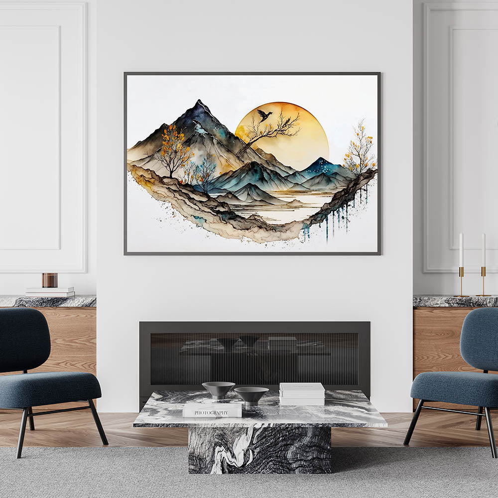 Enhance your workspace with this breathtaking Office Wall Art featuring a serene mountain landscape bathed in warm golden hues. This Modern Office Art blends elegance and tranquility, making it a perfect addition to any corporate or professional setting. The intricate details, from the majestic mountains to the delicate bird in flight, evoke a sense of harmony and inspiration—ideal for Contemporary Office Decor.