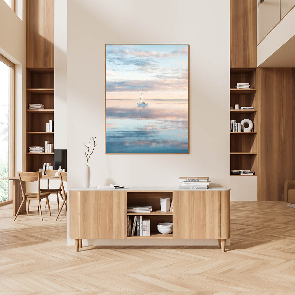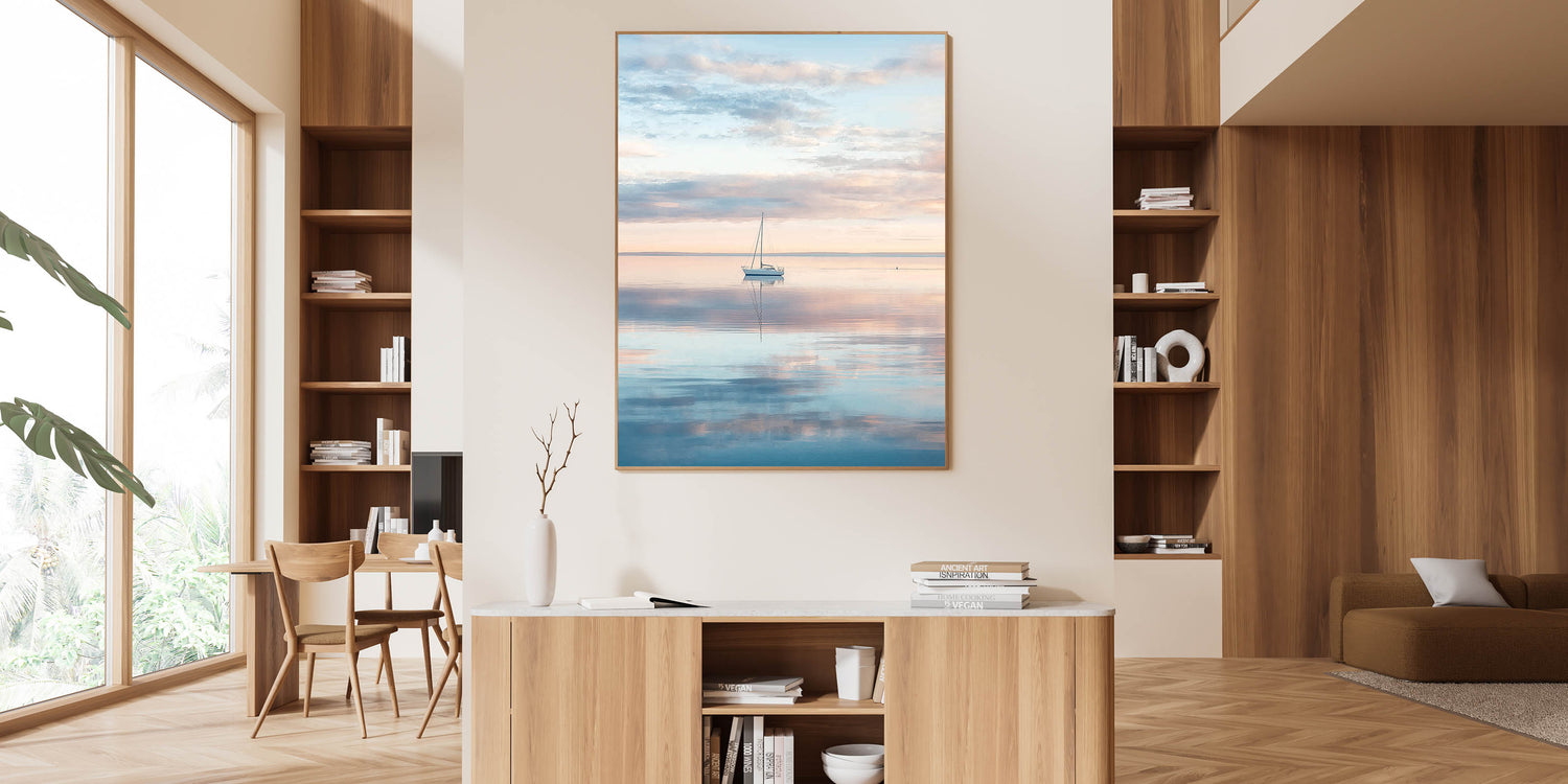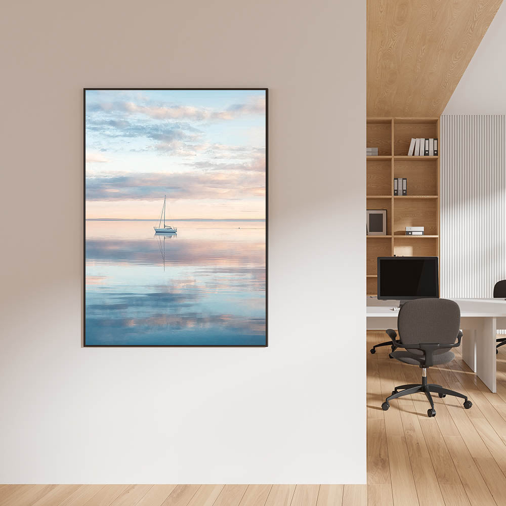 Bring a sense of calm and inspiration to your workspace with this stunning office wall art featuring a sailboat drifting on still waters. The soft hues of sky blue, pastel peach, and muted pink create a contemporary office décor piece that exudes tranquility and focus. Designed to enhance corporate spaces, this business wall art is perfect for boardrooms, executive offices, and coworking environments.