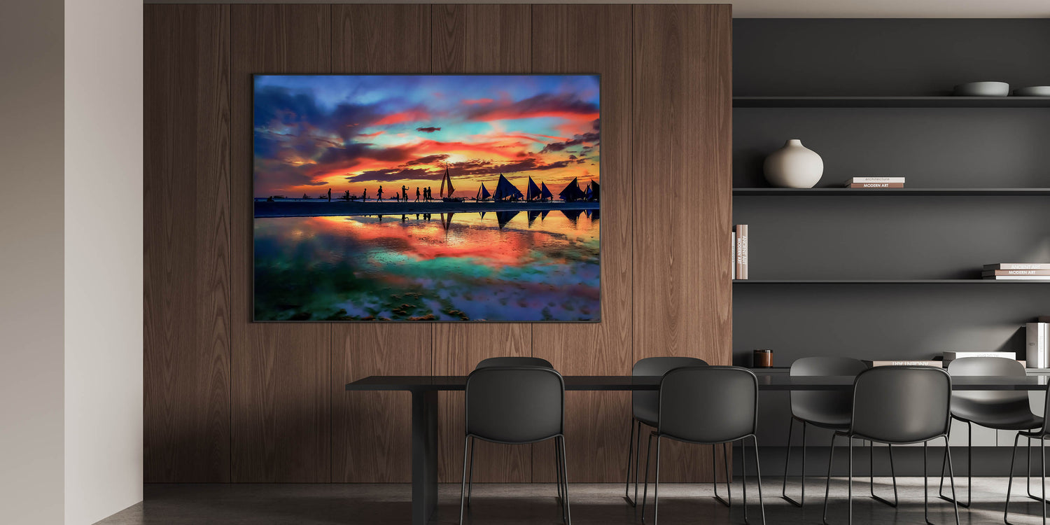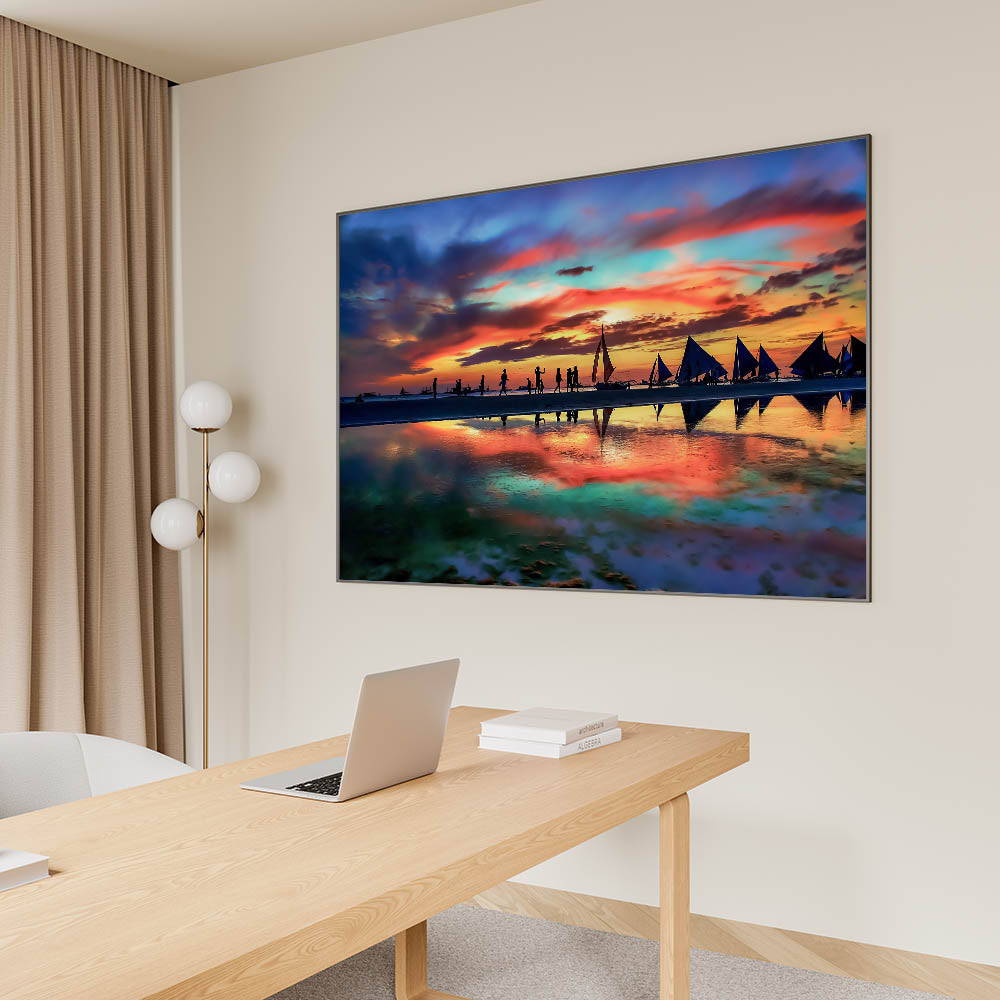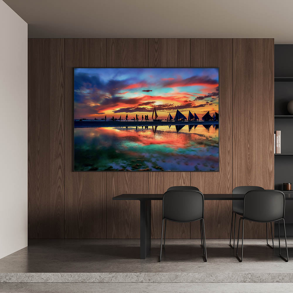 Transform your workspace with this Office Wall Art, featuring a breathtaking beach sunset with vivid hues of orange, blue, and pink reflecting on the water. The silhouettes of people and sailboats against the dramatic sky create a captivating and modern aesthetic, making this a perfect choice for Modern Office Art. This lively piece enhances Corporate Wall Decor, adding an inspiring and dynamic touch to executive offices, conference rooms, or reception areas.