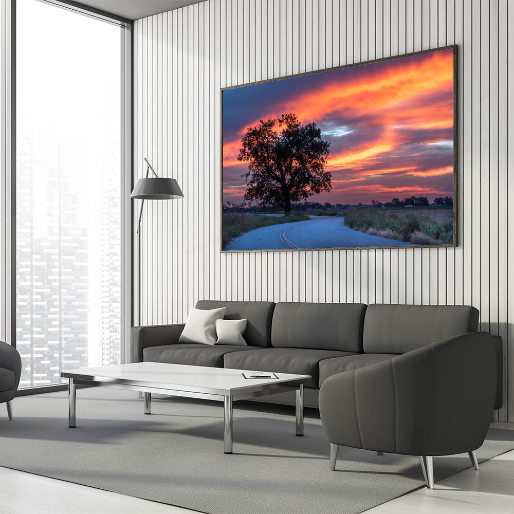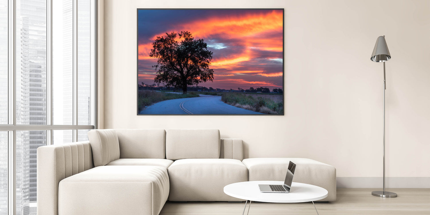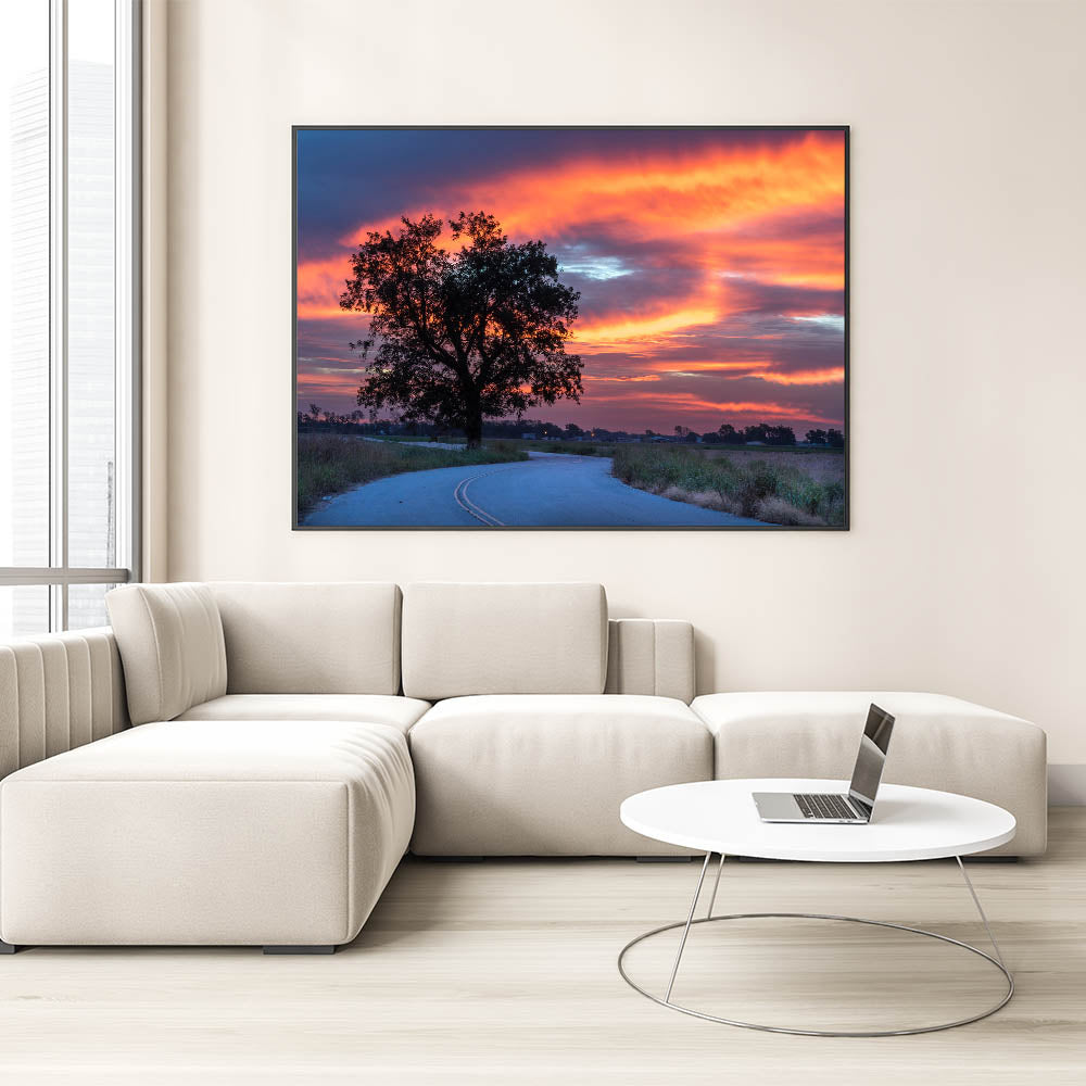 Bring the beauty of Oklahoma's captivating landscapes into your home with this stunning wall art, featuring a scenic sunset over a quiet rural road. This breathtaking piece highlights the rich, warm hues of a glowing sky behind a majestic tree, embodying the peaceful yet vibrant nature of Oklahoma. Available in various formats, including stretched canvas, framed canvas, acrylic glass, and more, this artwork is perfect for those who appreciate the natural beauty of the state.