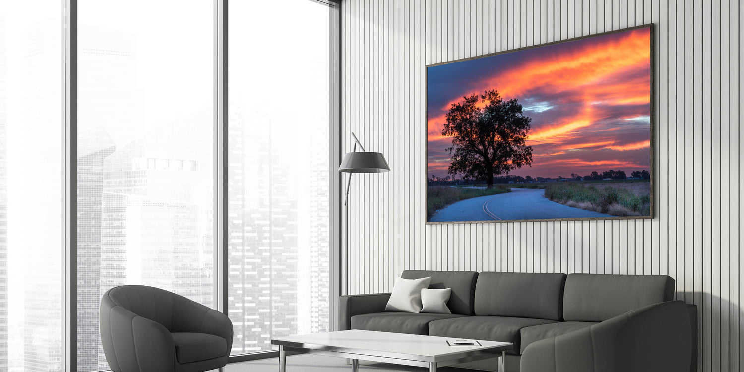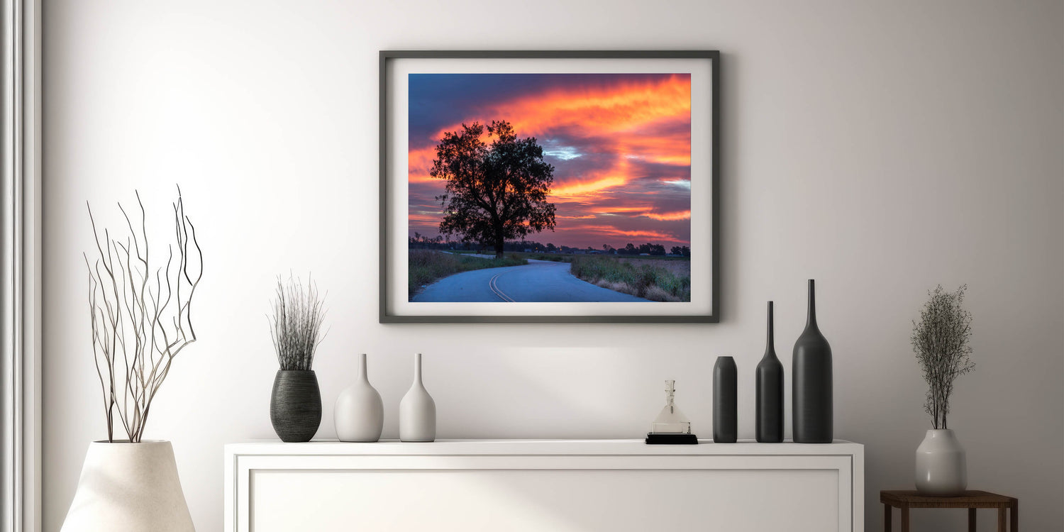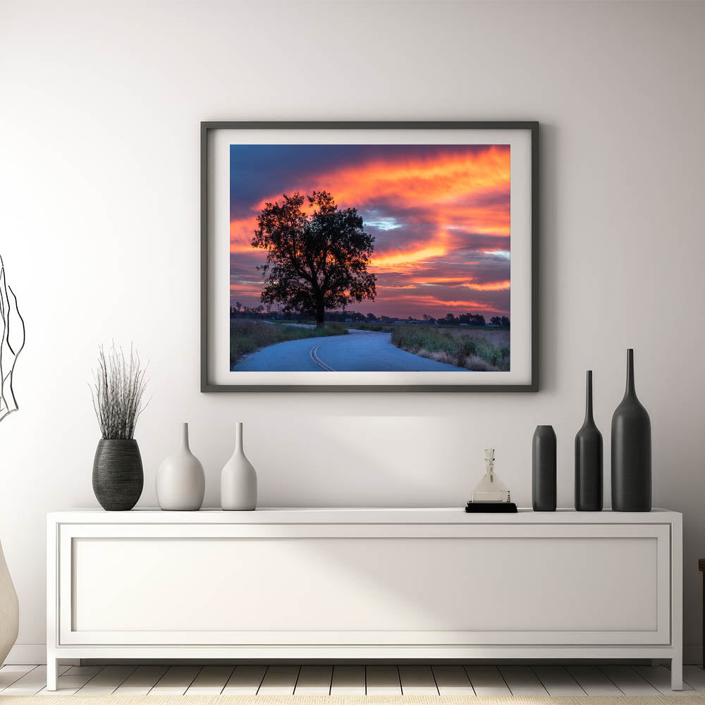 Bring the beauty of Oklahoma's captivating landscapes into your home with this stunning wall art, featuring a scenic sunset over a quiet rural road. This breathtaking piece highlights the rich, warm hues of a glowing sky behind a majestic tree, embodying the peaceful yet vibrant nature of Oklahoma. Available in various formats, including stretched canvas, framed canvas, acrylic glass, and more, this artwork is perfect for those who appreciate the natural beauty of the state.