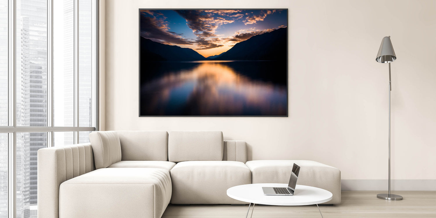 Capture the breathtaking beauty of Olympic National Park with this stunning sunset wall art. The peaceful lake reflects the warm colors of the setting sun, framed by majestic mountains and illuminated clouds. This artwork offers a calming and serene vibe, making it the perfect addition to any space, whether in your home or office.