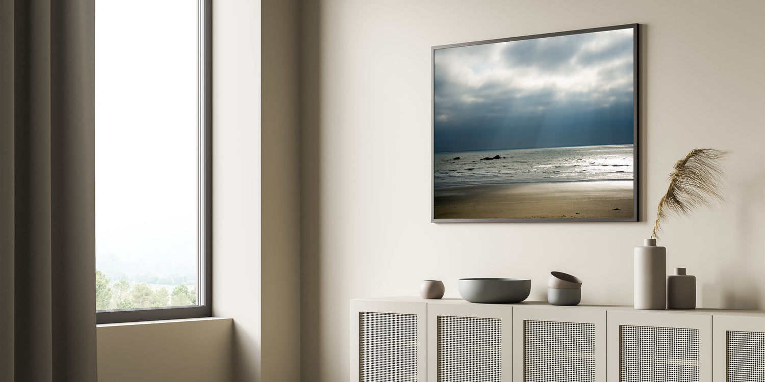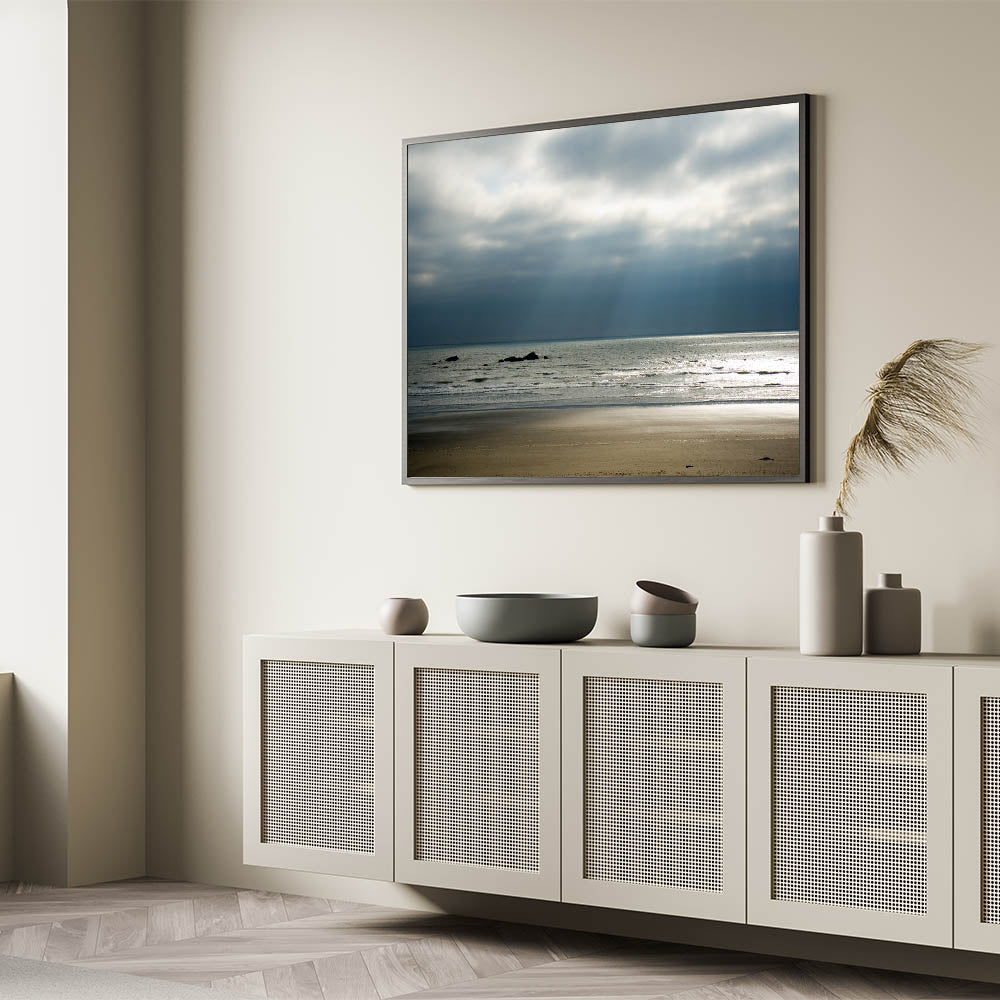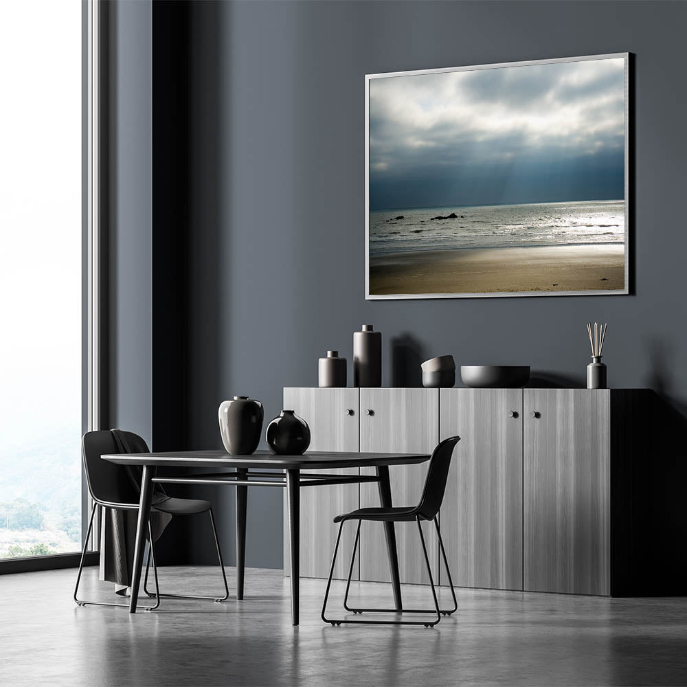 Experience the peaceful beauty of the Pacific coastline with this tranquil ocean beach wall art from Olympic National Park. This serene scene captures the soft light breaking through moody clouds as it illuminates the sandy shore and calm ocean waters. Perfect for creating a calming and reflective atmosphere, this artwork brings the quiet beauty of nature into your home.