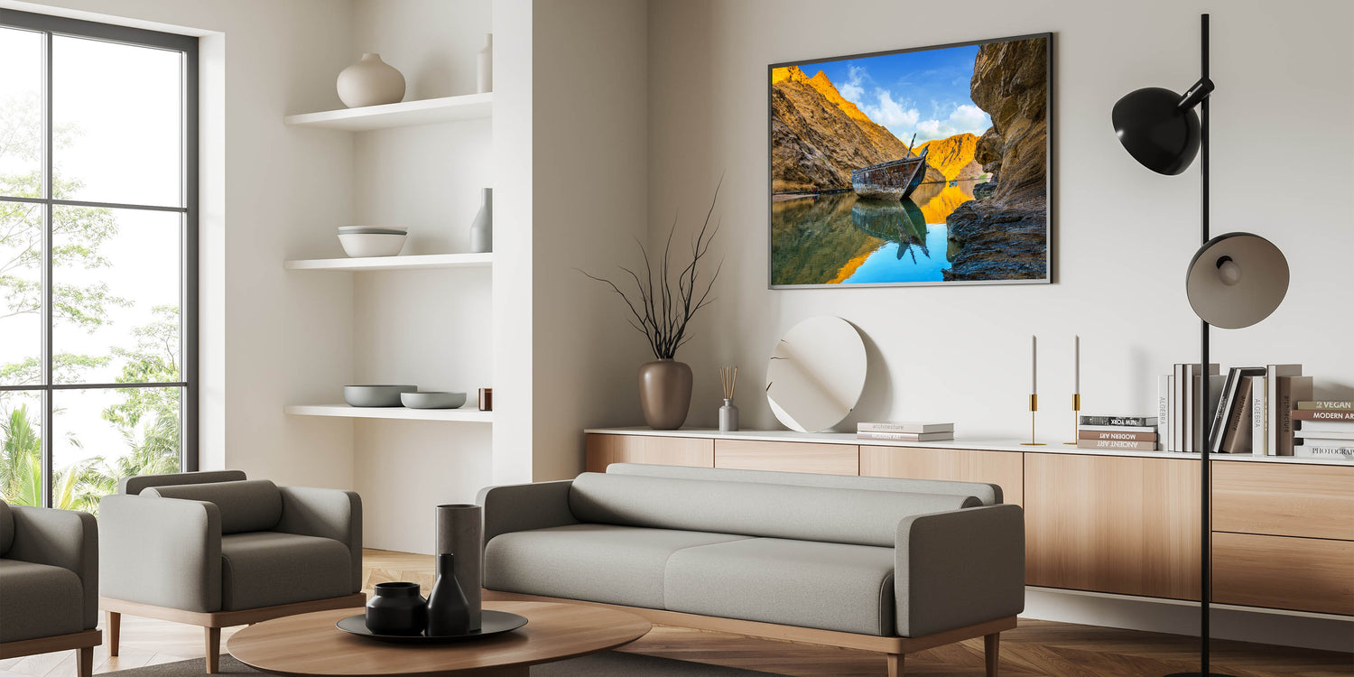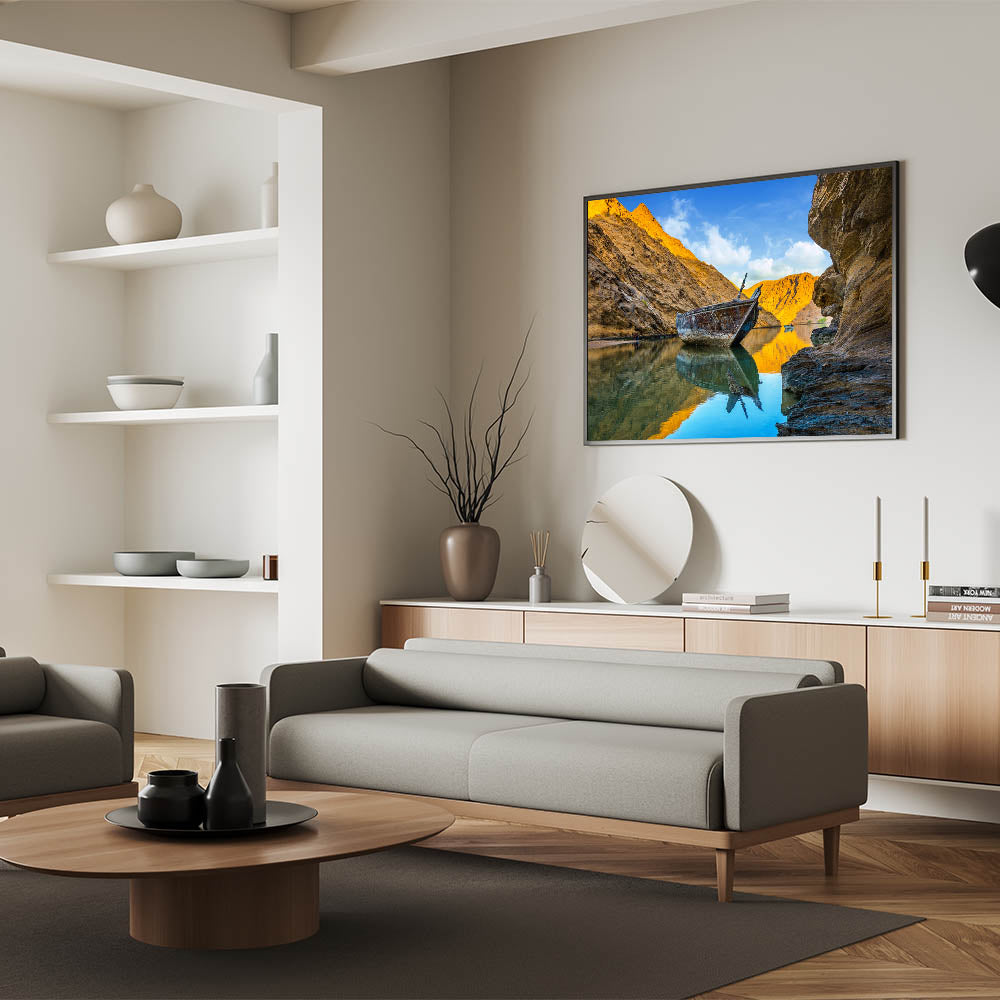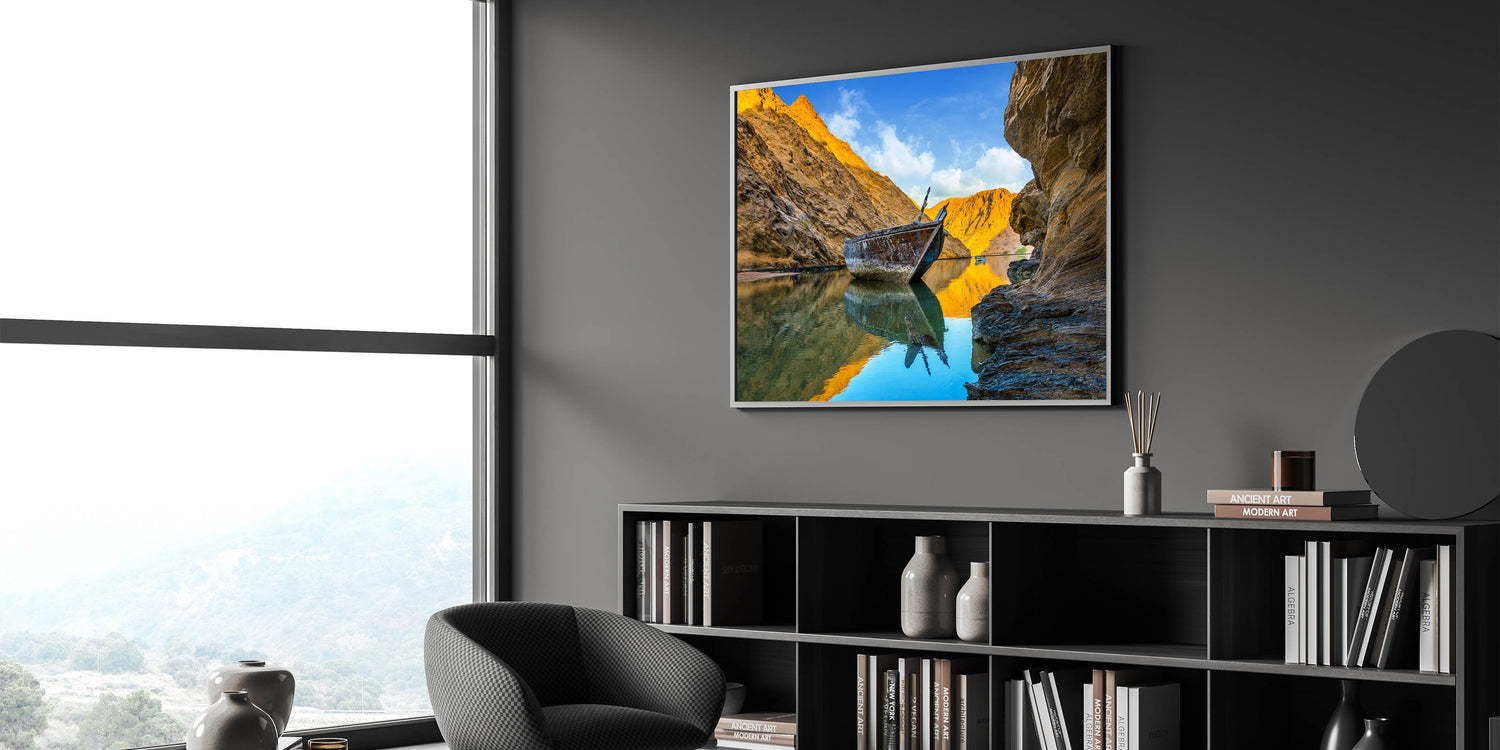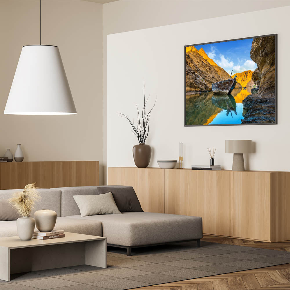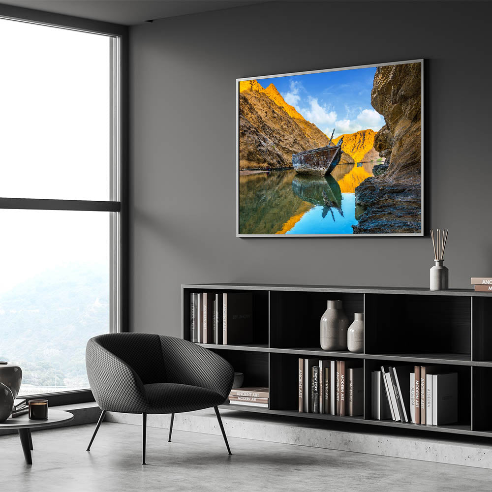 Capture the rugged beauty of Oman’s hidden fjords with this stunning wall art, featuring an abandoned boat peacefully resting in the calm waters beneath towering cliffs. This high-quality Oman wall art combines the serenity of the natural landscape with the weathered charm of the old boat, creating a captivating scene that draws viewers in. Perfect for lovers of both adventure and tranquility, this artwork brings the beauty of the Arabian Peninsula’s coastal wilderness into your home.