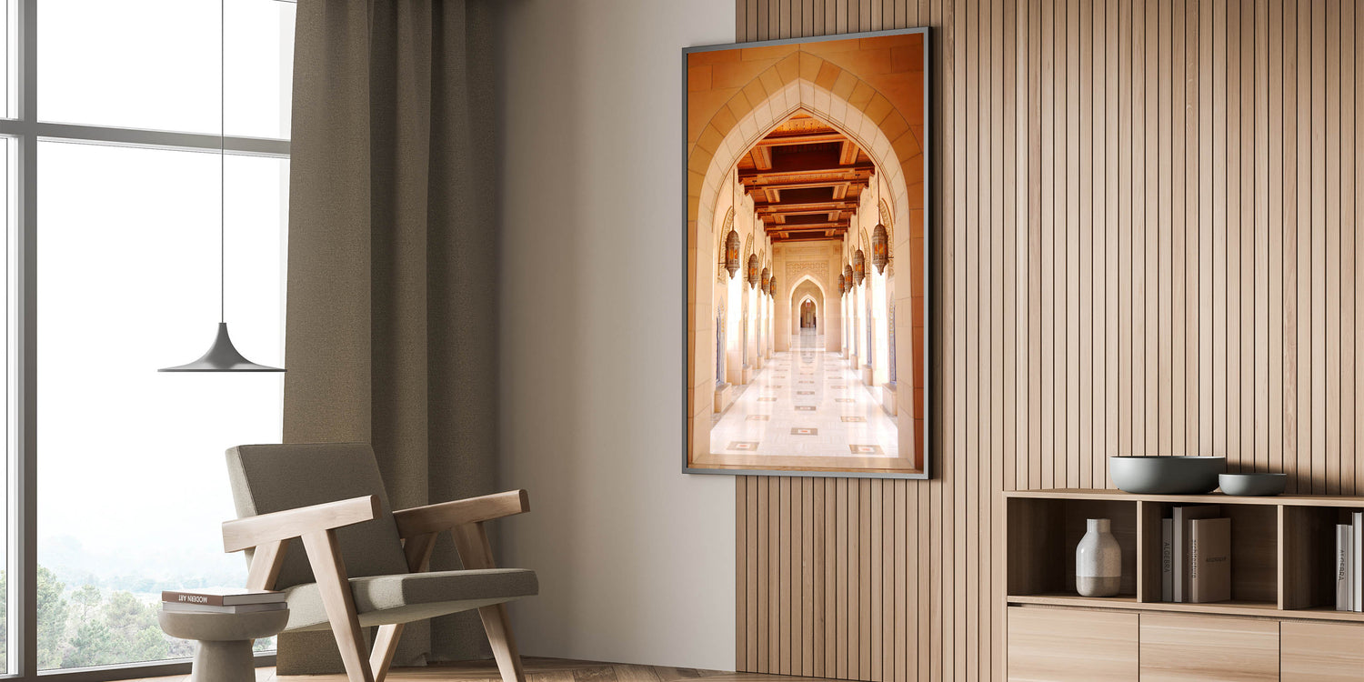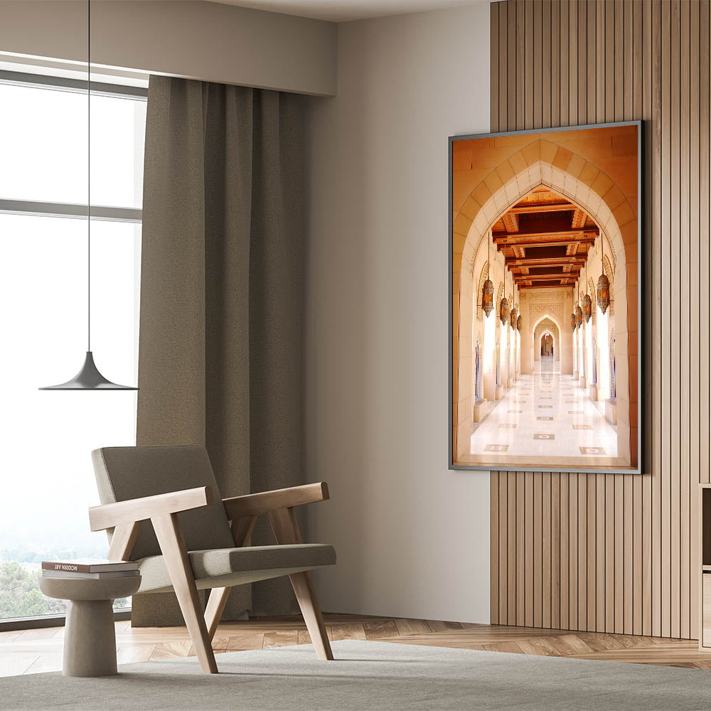 Step into the elegance of Omani architecture with this stunning wall art, showcasing a grand mosque corridor adorned with intricate arches, lanterns, and marble flooring. This high-quality Oman wall art captures the timeless beauty of Islamic design, making it the perfect addition for anyone looking to incorporate traditional Middle Eastern elements into their home decor.