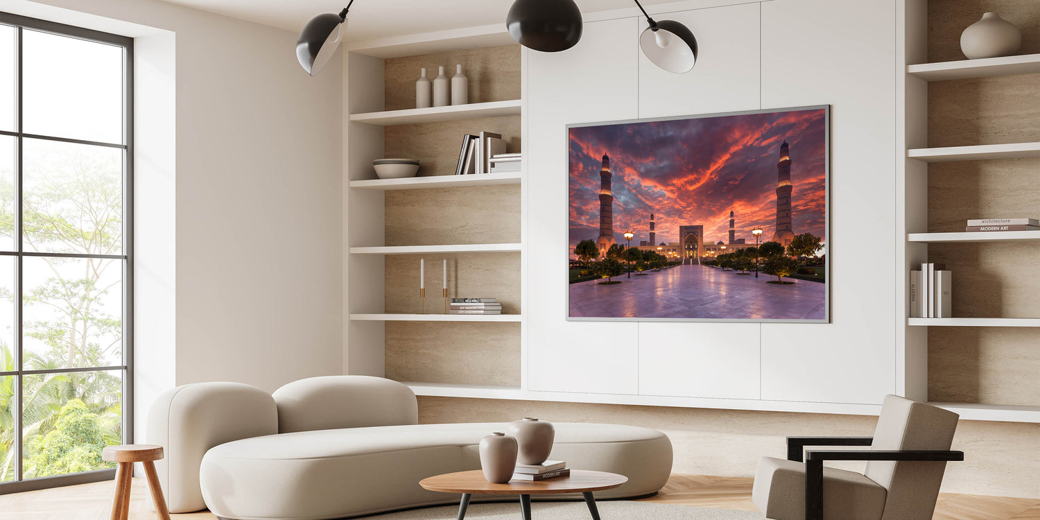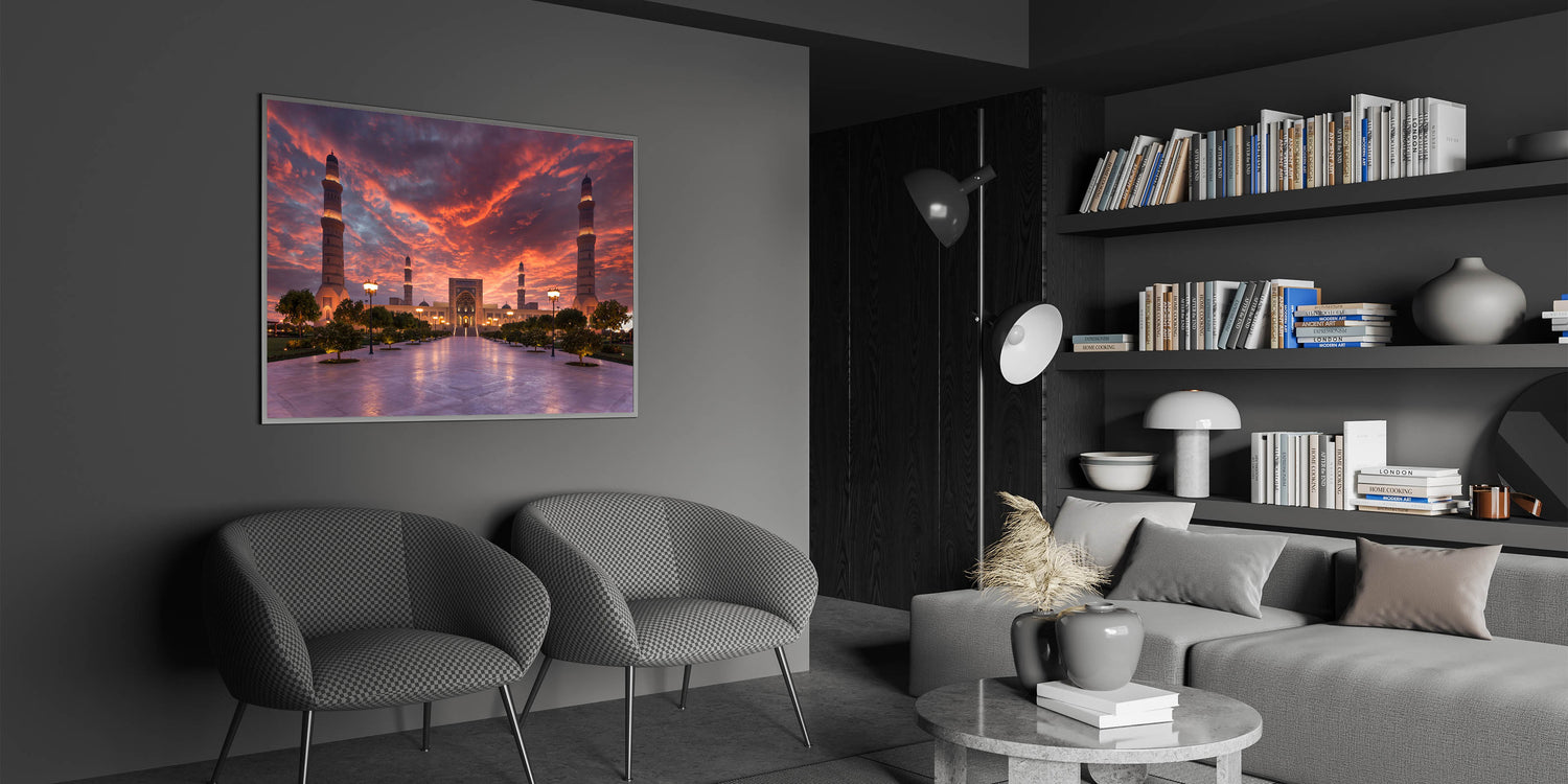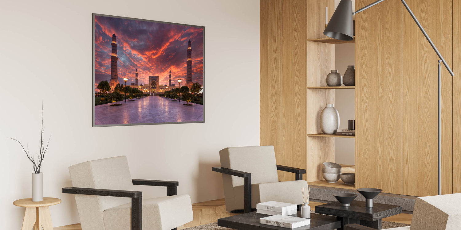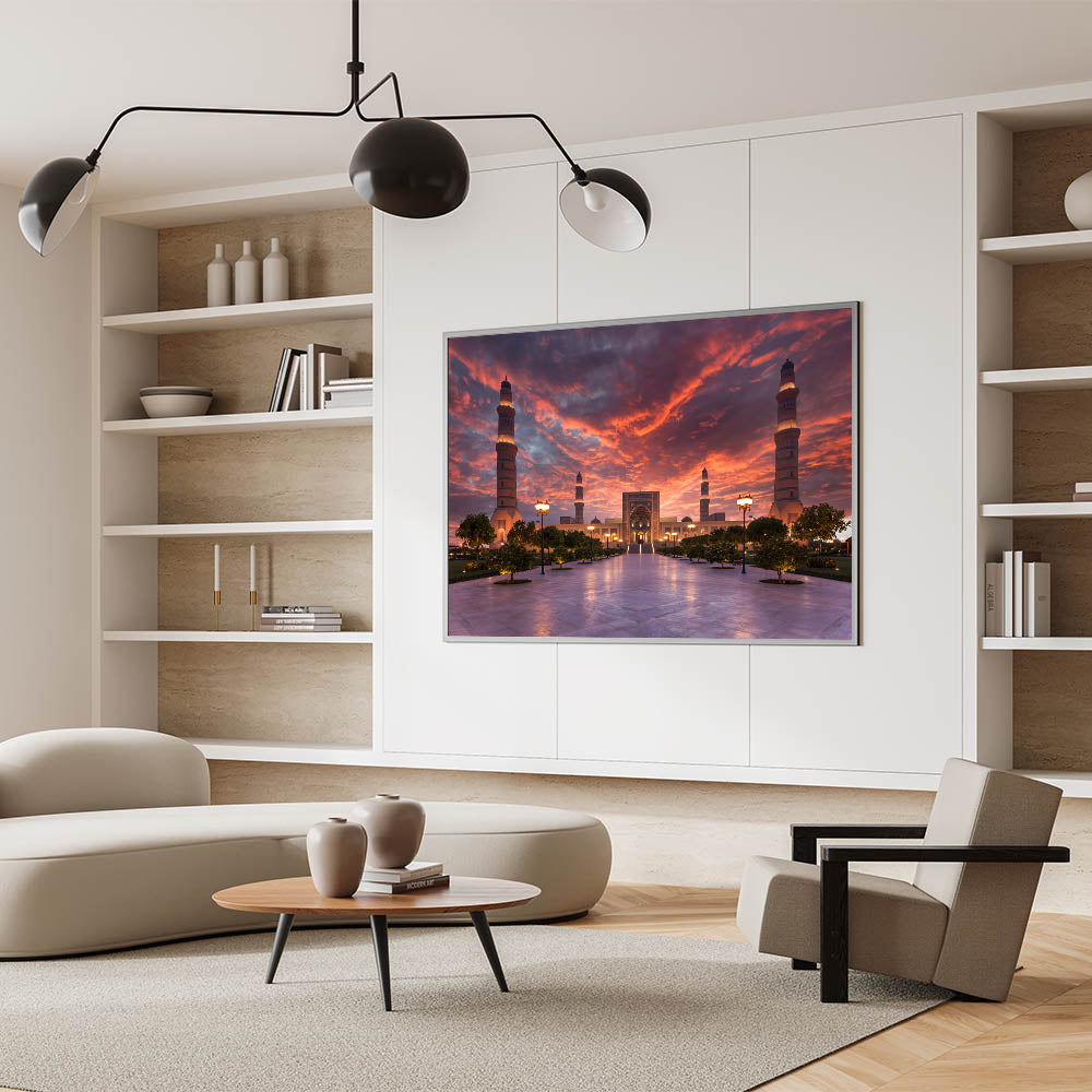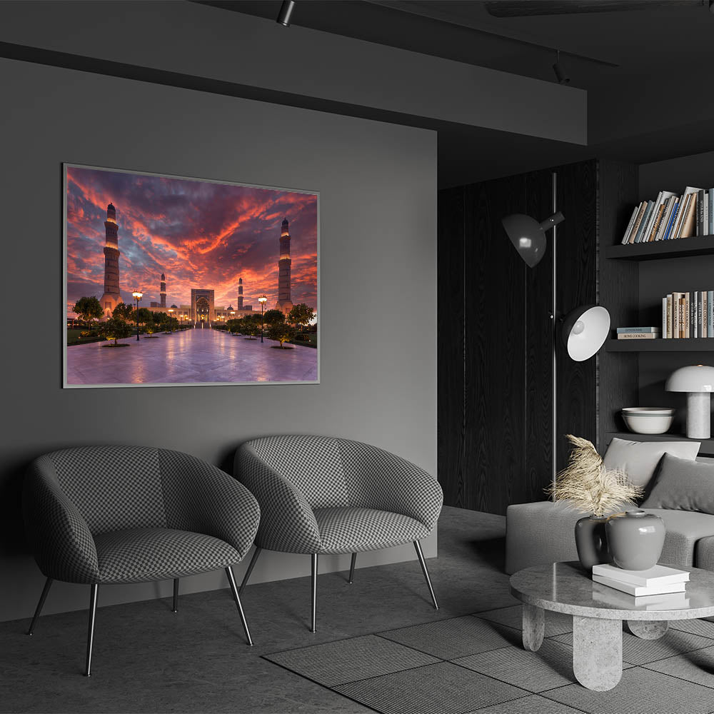 Experience the grandeur of Oman’s architecture with this stunning wall art, featuring the majestic Grand Mosque illuminated against a breathtaking sunset. The fiery skies create a dramatic contrast with the elegant structure, making this high-quality Oman wall art an unforgettable piece for anyone who appreciates the beauty of Islamic architecture and vibrant natural scenery.