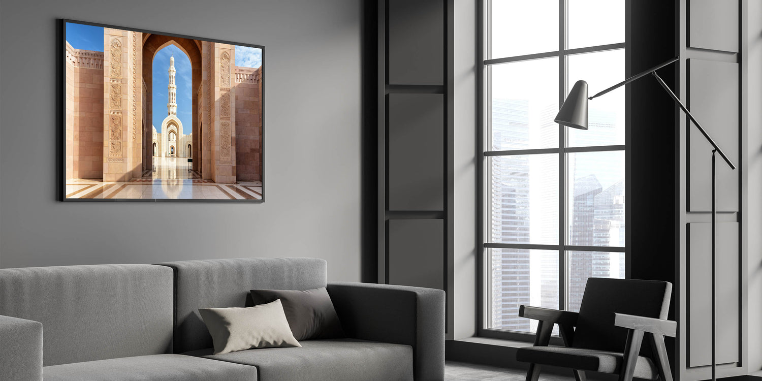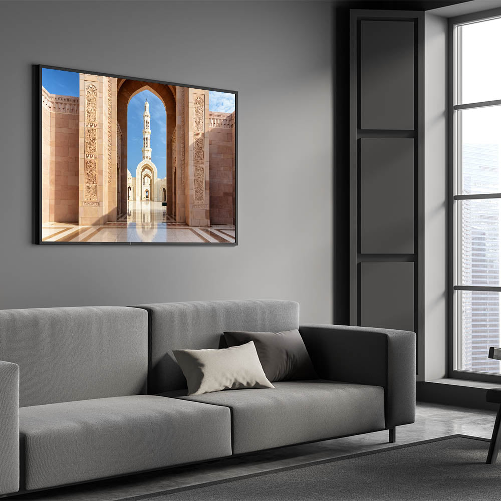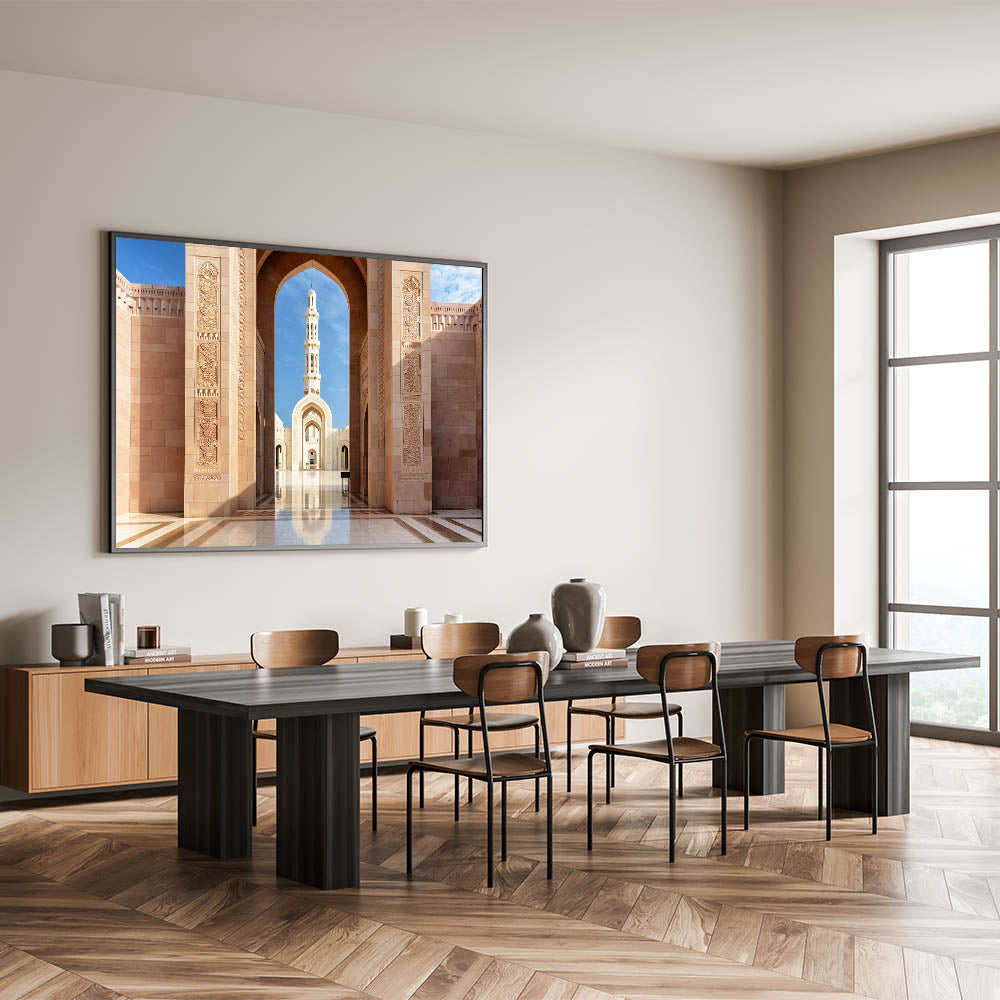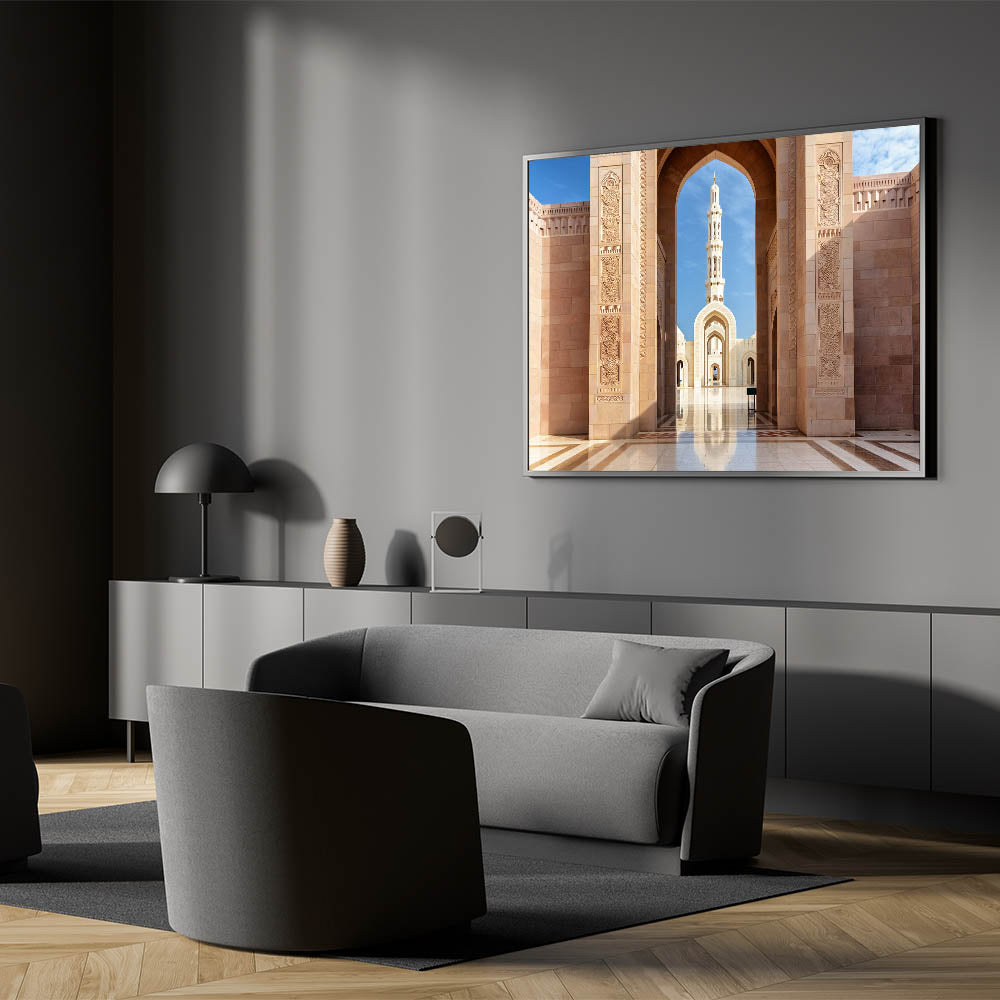 Step into the architectural splendor of Oman with this exquisite wall art, featuring a beautifully detailed view of the Grand Mosque's minaret framed by intricate arches. This high-quality Oman wall art captures the elegance and symmetry of traditional Islamic design, making it the perfect addition to any space seeking to evoke the grandeur and artistry of Middle Eastern architecture.
