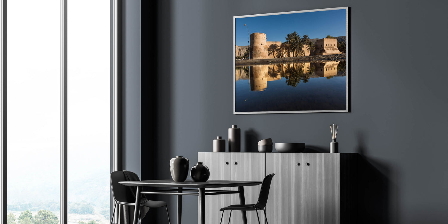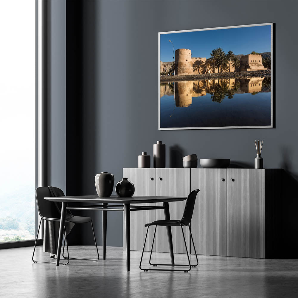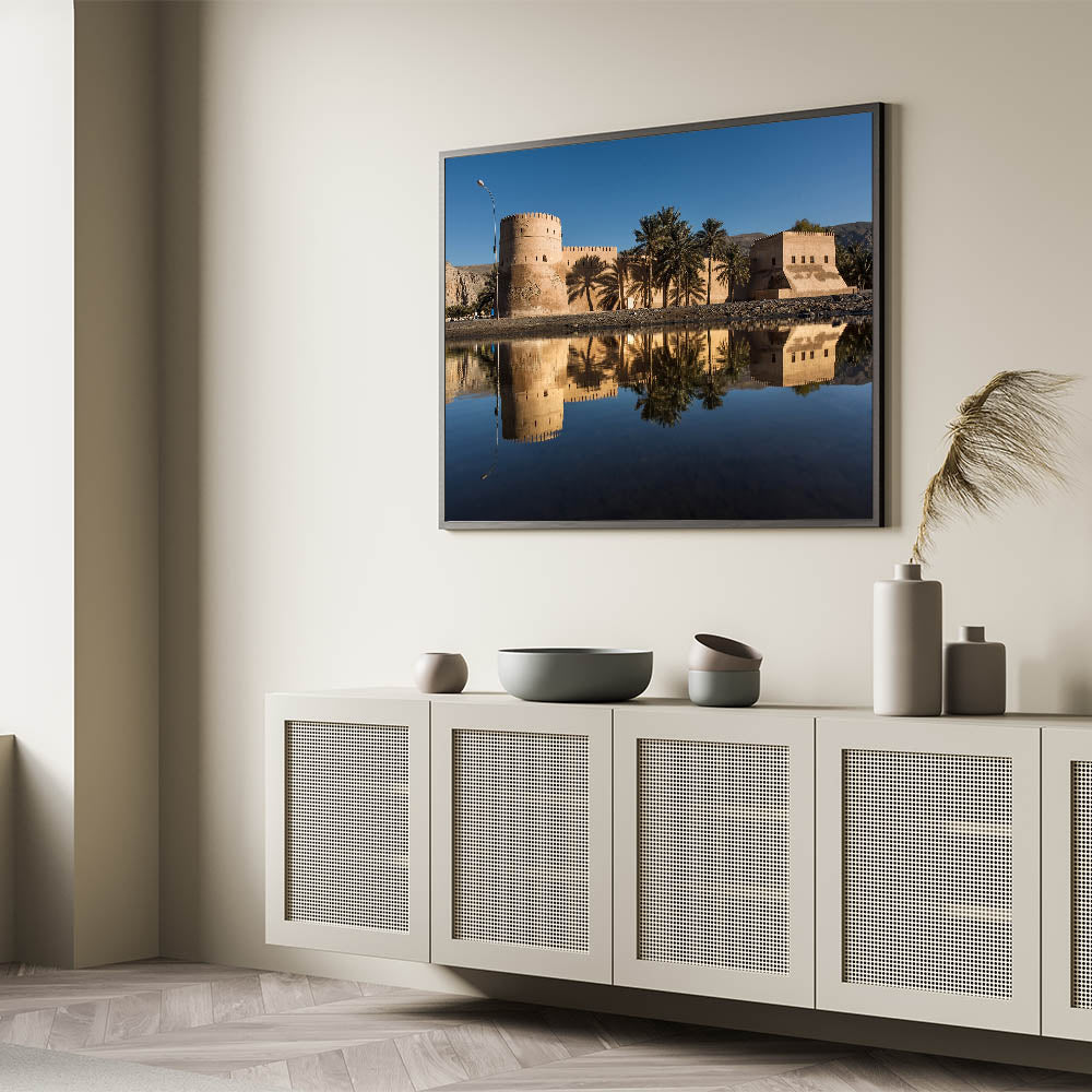 Celebrate the rich history of Oman with this stunning wall art, featuring a beautiful reflection of a historic Omani fort. This high-quality Oman wall art captures the essence of traditional Arabian architecture, making it an ideal addition for anyone seeking to add a touch of history and culture to their decor. The fort’s detailed stonework and the serene reflection in the water create a captivating piece of art that brings the beauty of Oman’s architectural heritage into your home.
