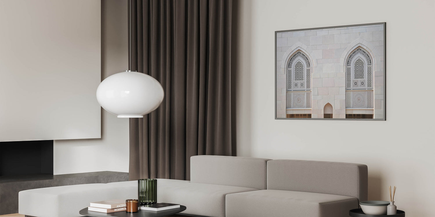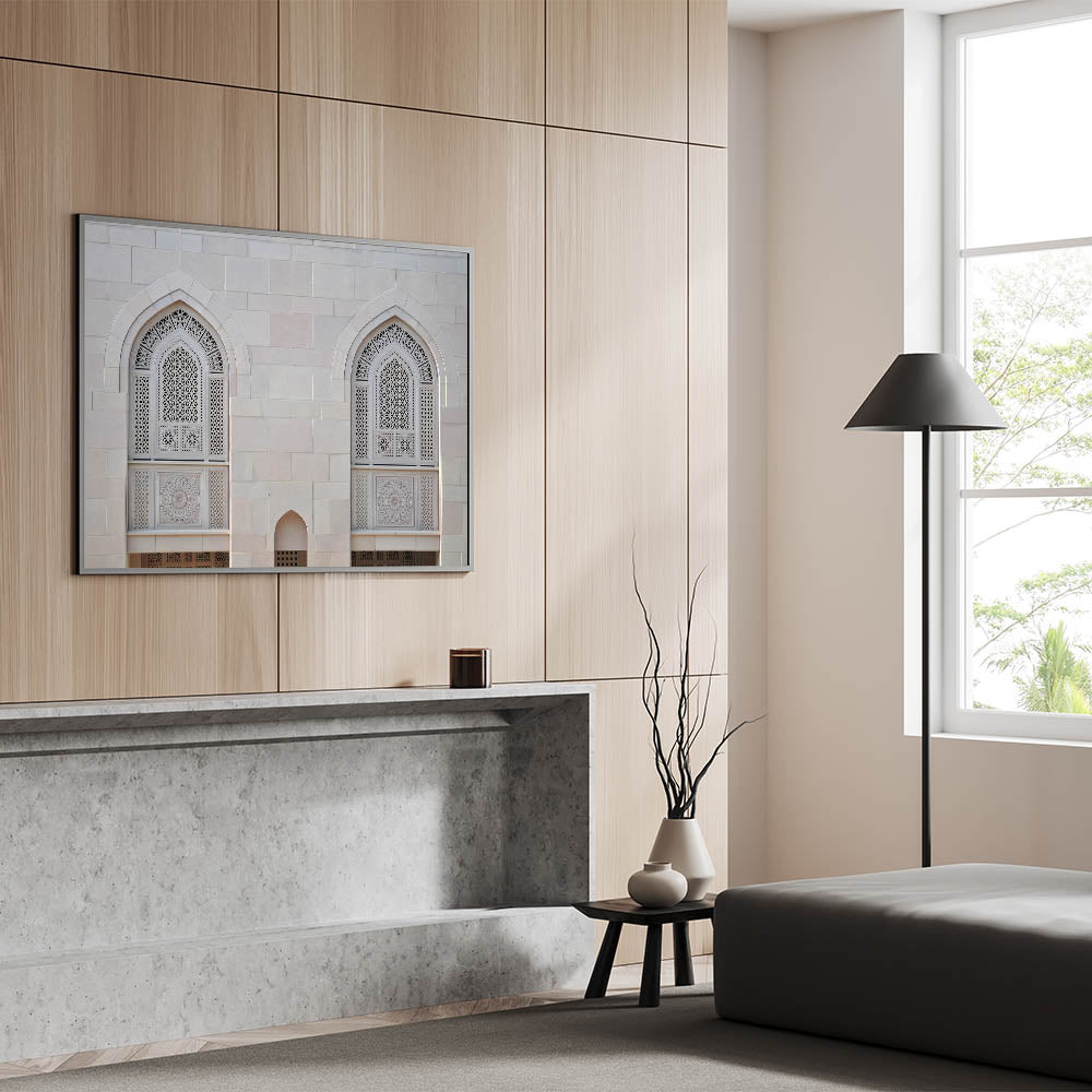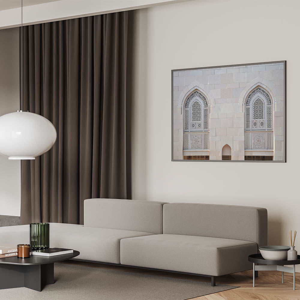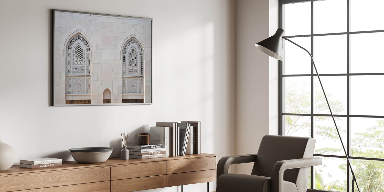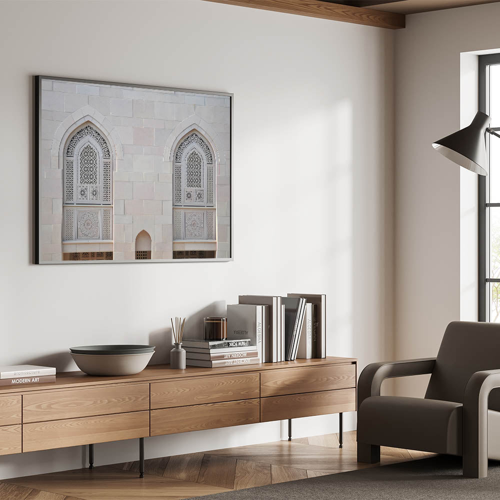Bring the timeless beauty of Islamic architecture into your home with this stunning Oman wall art, featuring the intricate details of mosque windows. This high-quality Oman wall art captures the fine craftsmanship of traditional Omani design, highlighting the detailed latticework and geometric patterns that are a hallmark of Middle Eastern architecture. Perfect for those who appreciate cultural art and elegant decor, this piece adds a touch of sophistication to any space.