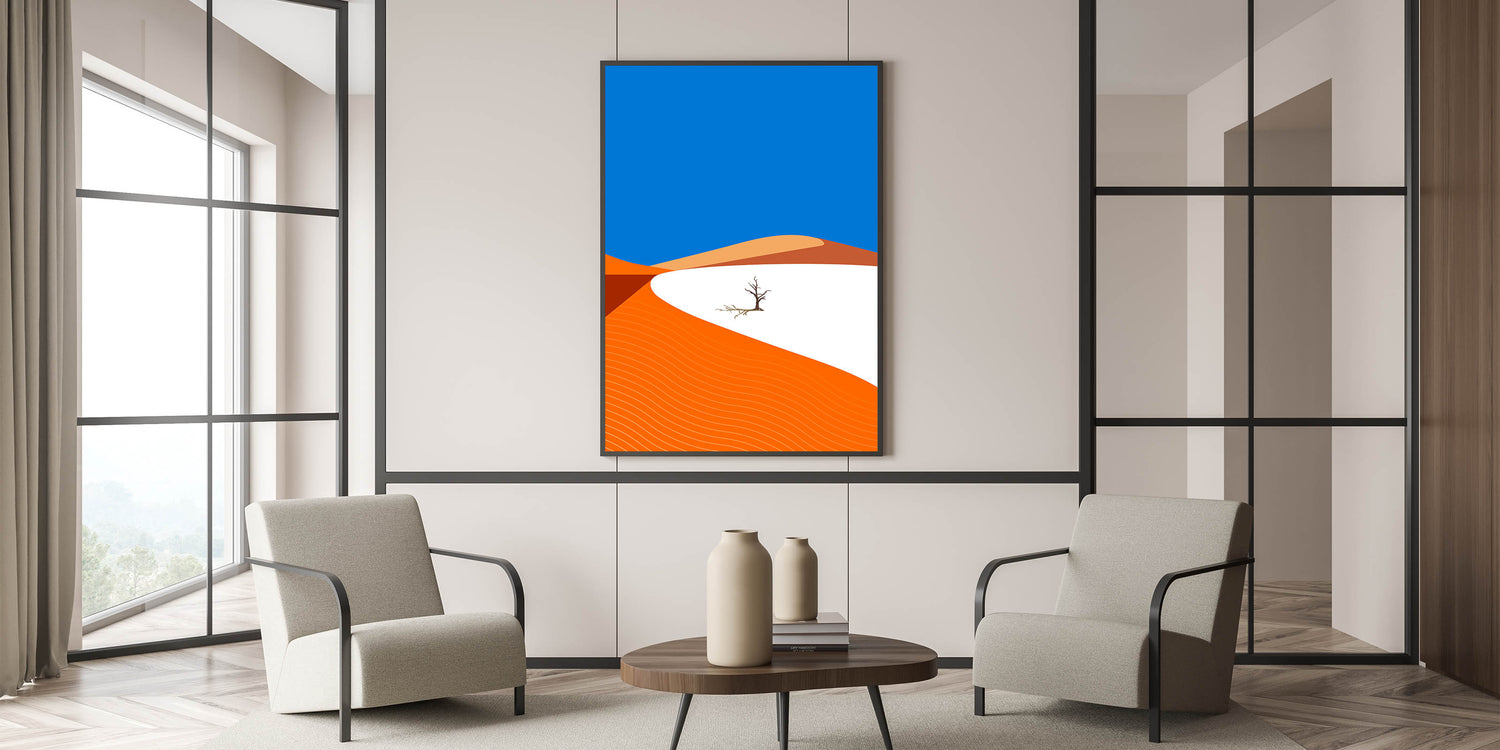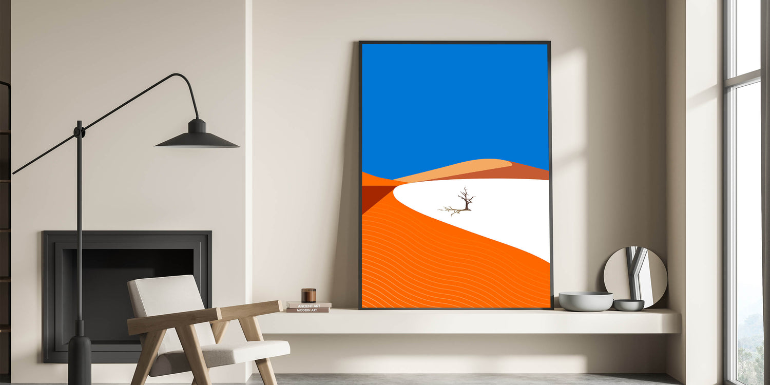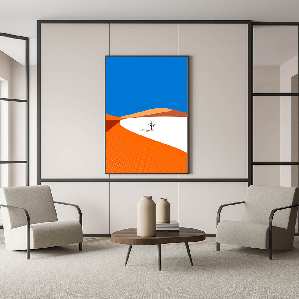 Add a touch of modern style to your home with this vibrant minimalist Oman wall art, featuring a striking desert landscape. With bold orange dunes set against a vivid blue sky, this high-quality Oman wall art captures the essence of the Arabian Peninsula’s natural beauty in a contemporary and abstract style. Perfect for those who appreciate clean lines and bold colors, this artwork brings the warmth of the desert into any room.