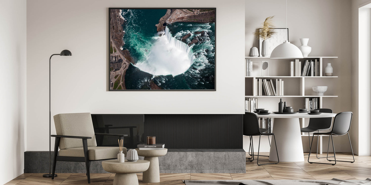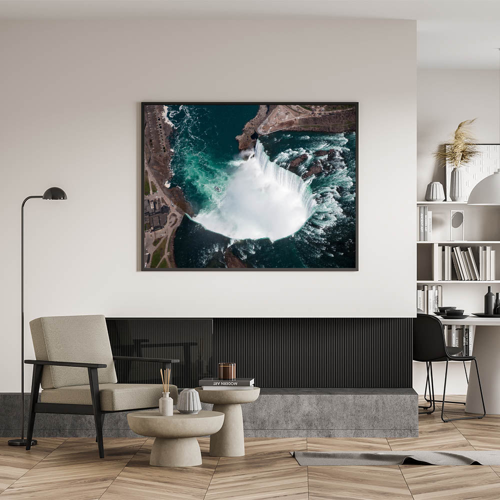Take in the breathtaking beauty of Niagara Falls from a bird’s-eye view with this stunning Aerial View of Niagara Falls wall art. This Ontario Landscape Print captures the powerful waterfall from above, highlighting the swirling emerald waters and the iconic curve of the falls. The image beautifully showcases the natural wonder of Niagara Falls, with the mist rising dramatically as the water cascades down into the basin.