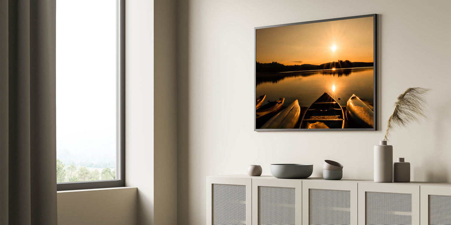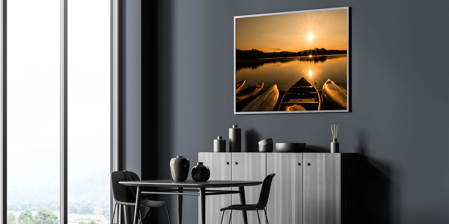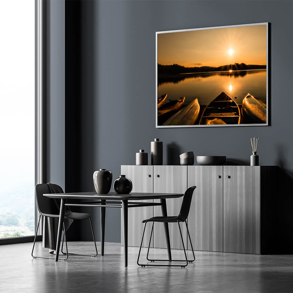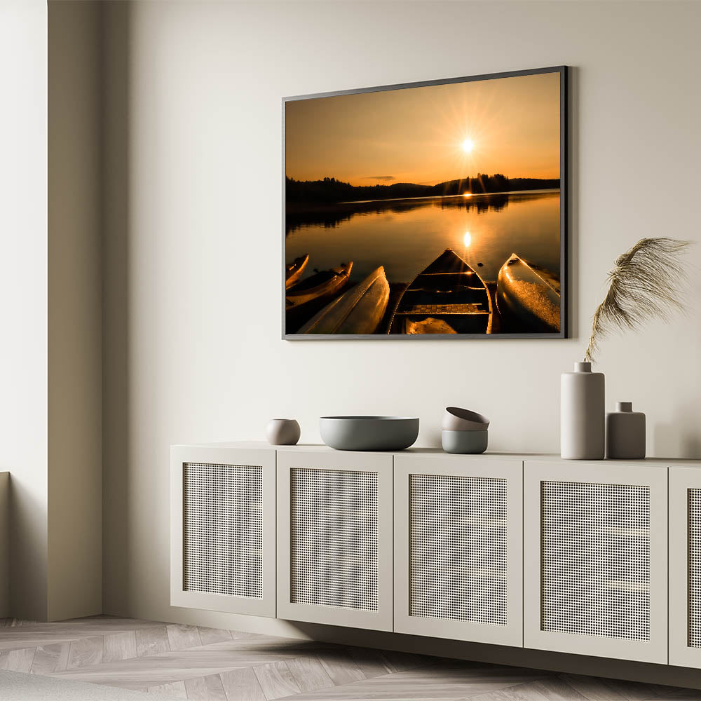 Capture the tranquil beauty of an Ontario sunset with this stunning Canoes at Sunset wall art. Featuring the calm waters of a lake reflecting the golden glow of the setting sun, this Ontario Landscape Print showcases the peaceful stillness of nature. The canoes resting on the shore add a touch of adventure and nostalgia, making this piece perfect for those who love the outdoors.