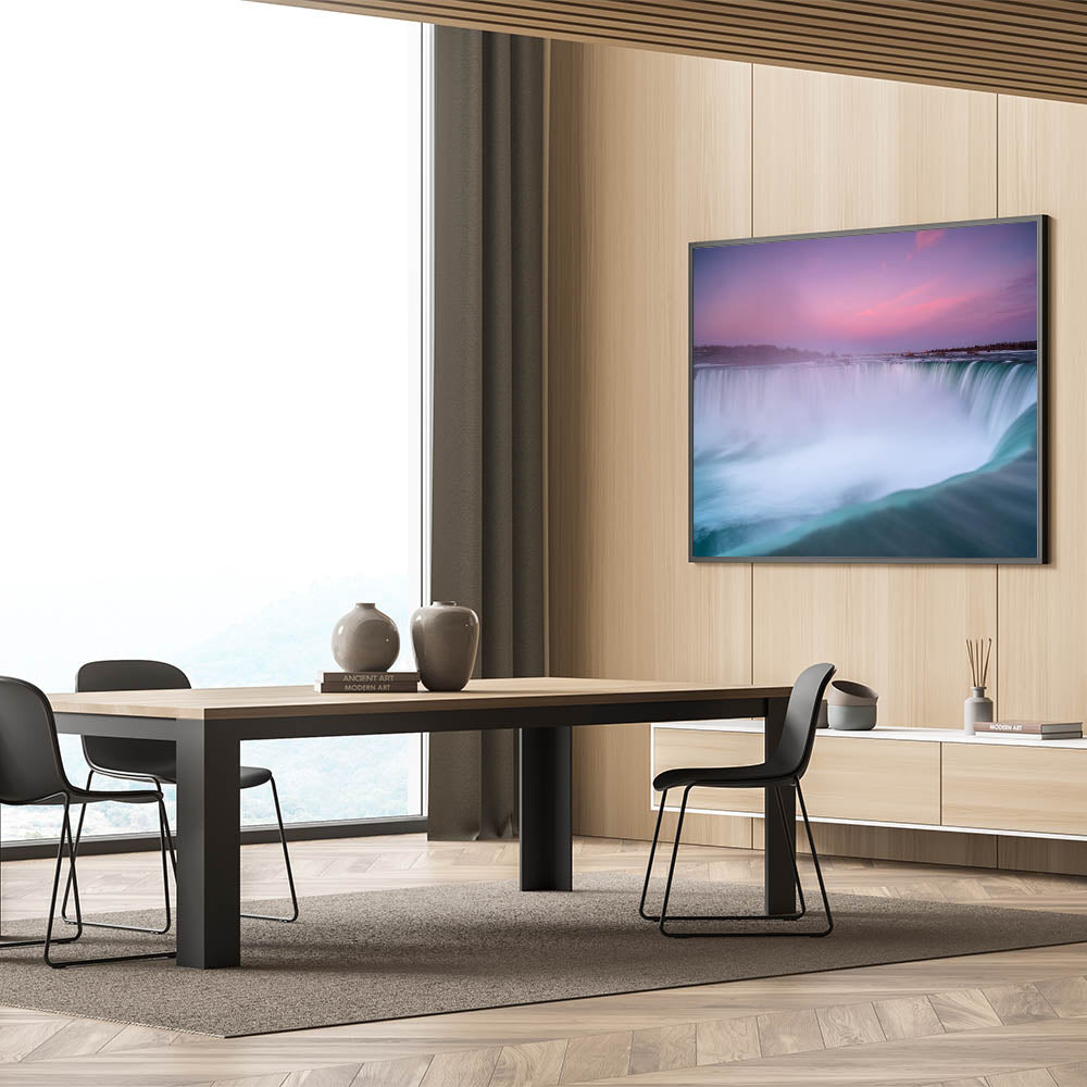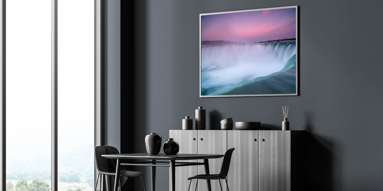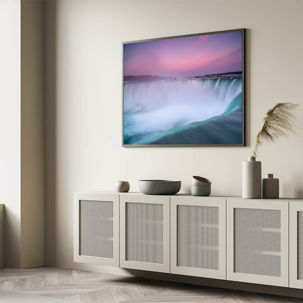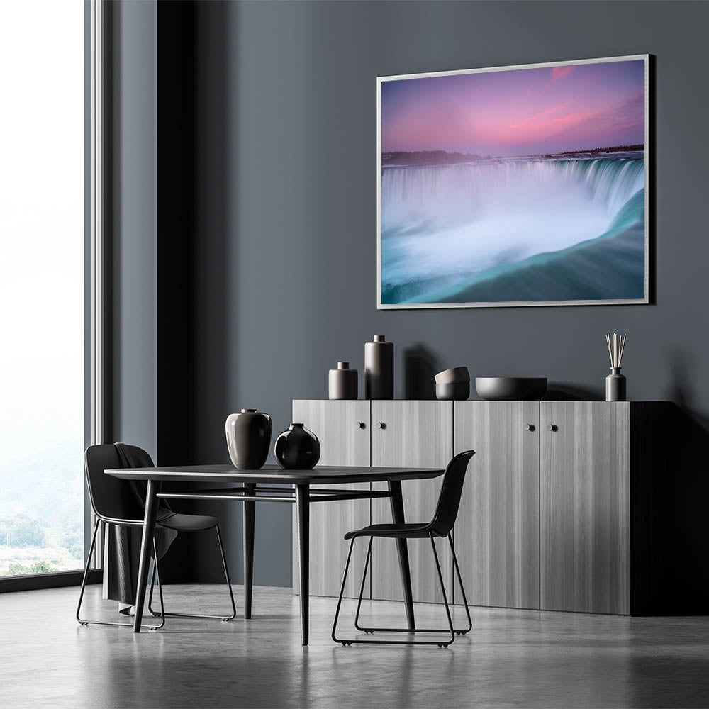 Experience the majestic beauty of one of the world’s most famous natural wonders with this stunning Niagara Falls wall art. Capturing the serene flow of the falls at sunset, this Ontario Landscape Print showcases the misty waters and vibrant hues of pink and purple in the sky. The smooth, misty effect created by the flowing water creates a calm and tranquil atmosphere, making it the perfect addition to any space.