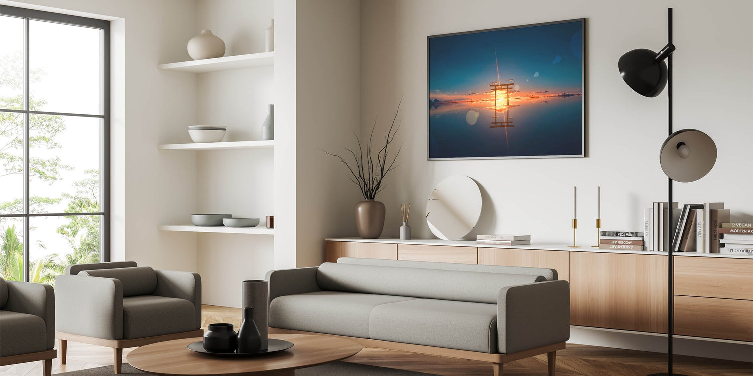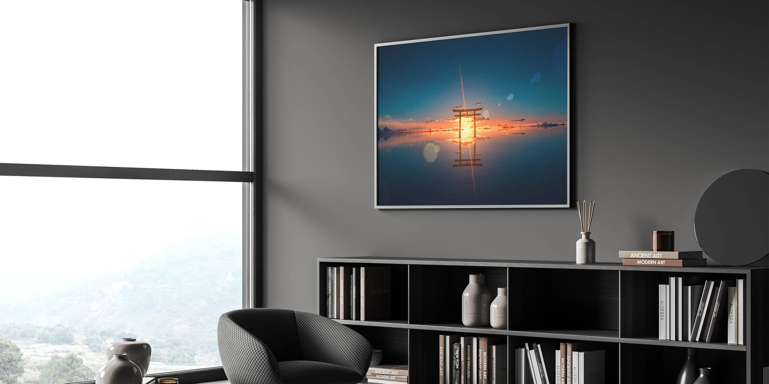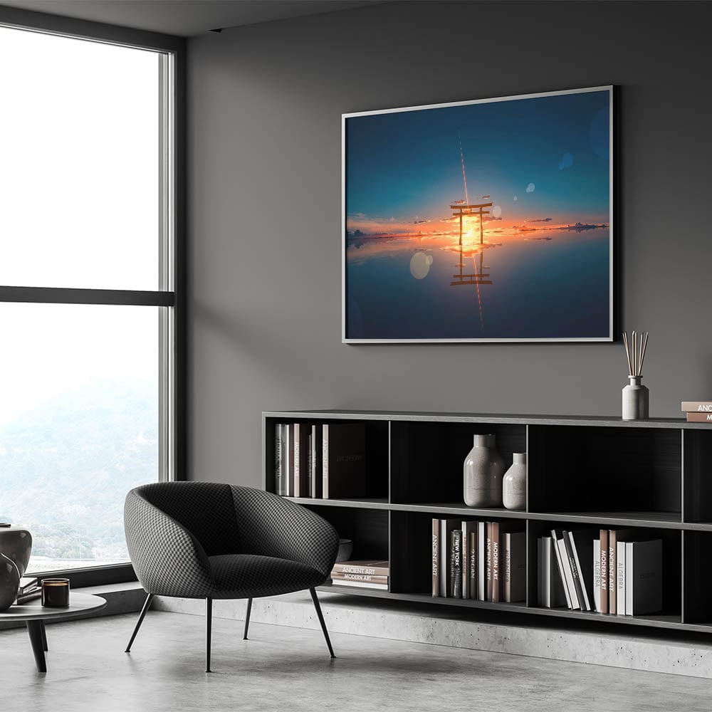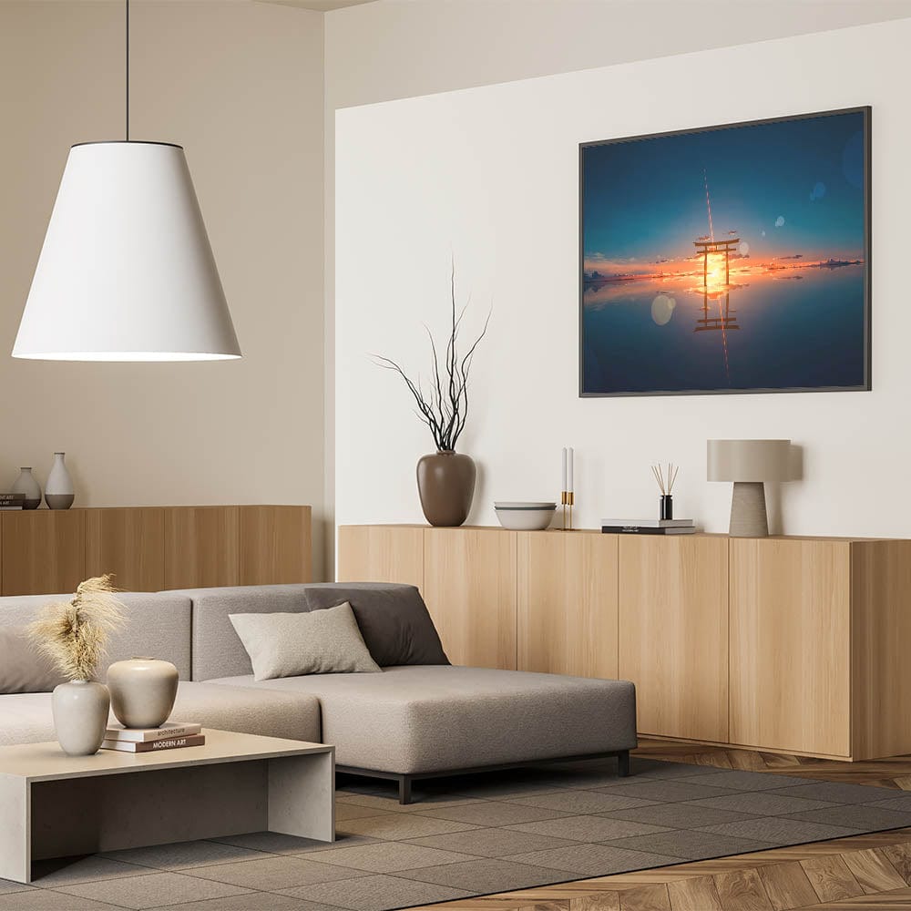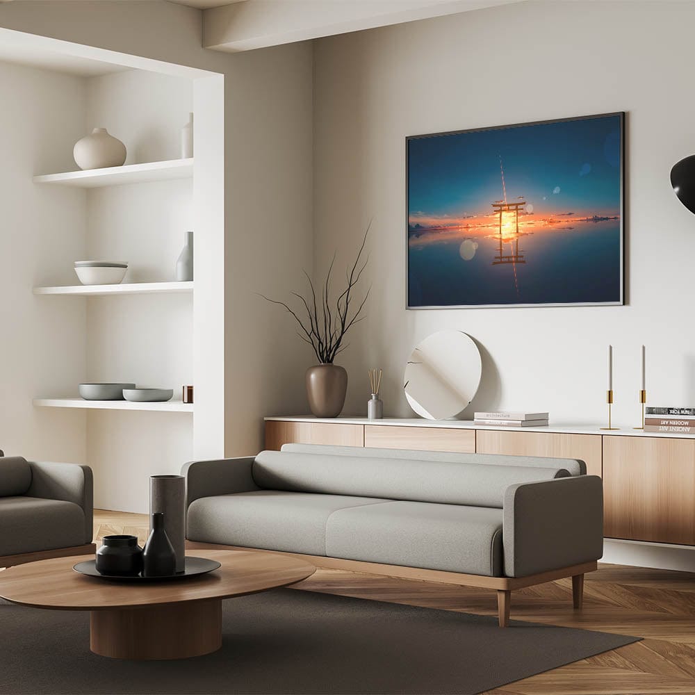 Infuse your space with harmony and light through this Minimalist Coastal Landscape Art, showcasing a Japanese torii gate illuminated by the rising sun. Set against a mirror-like body of water, the warm glow of orange and gold contrasts beautifully with the deep, tranquil blues—offering a moment of stillness and spiritual clarity.