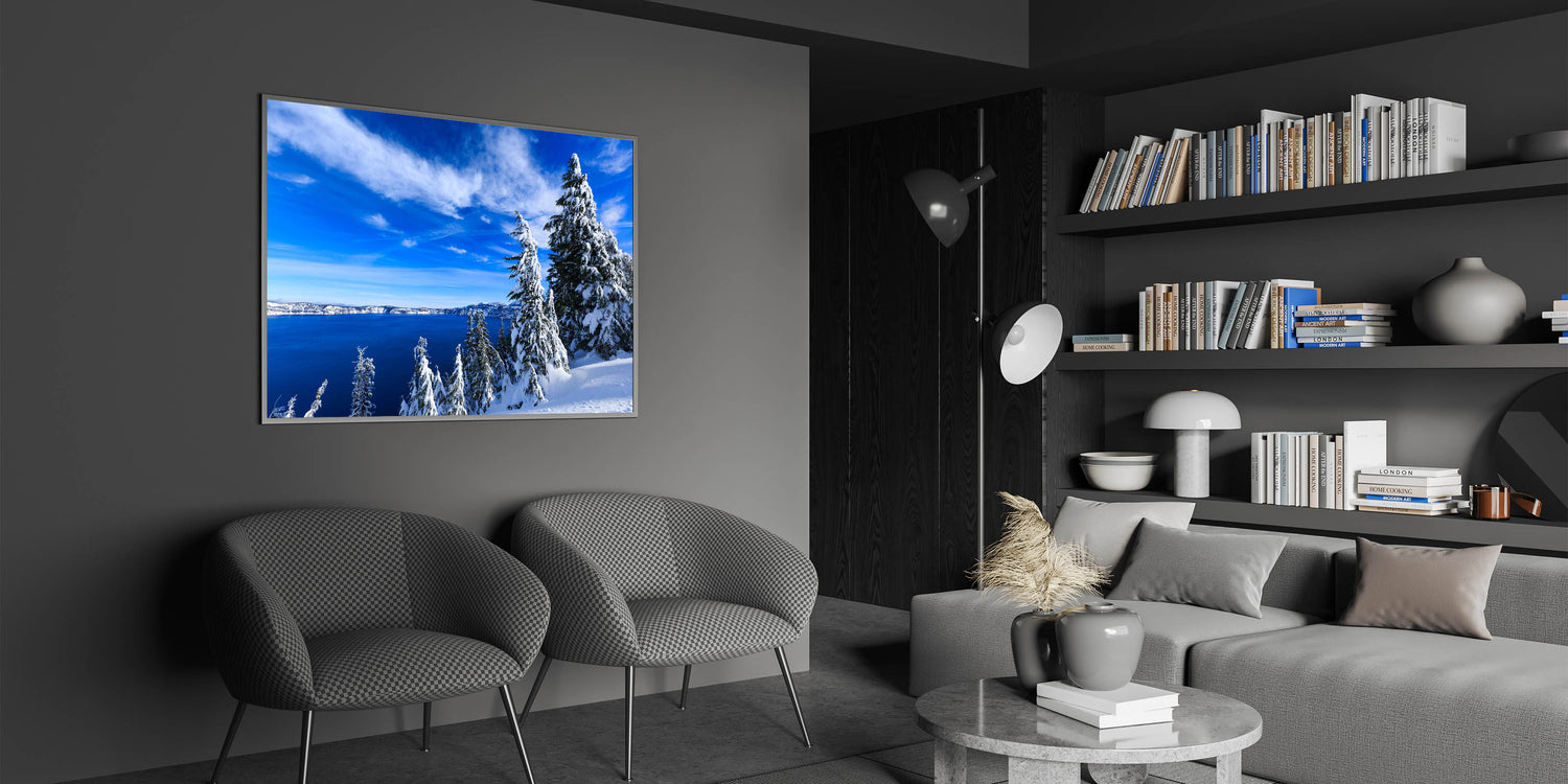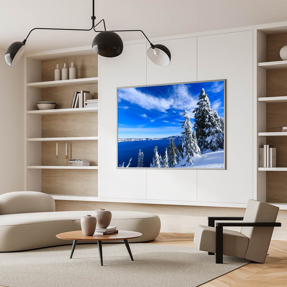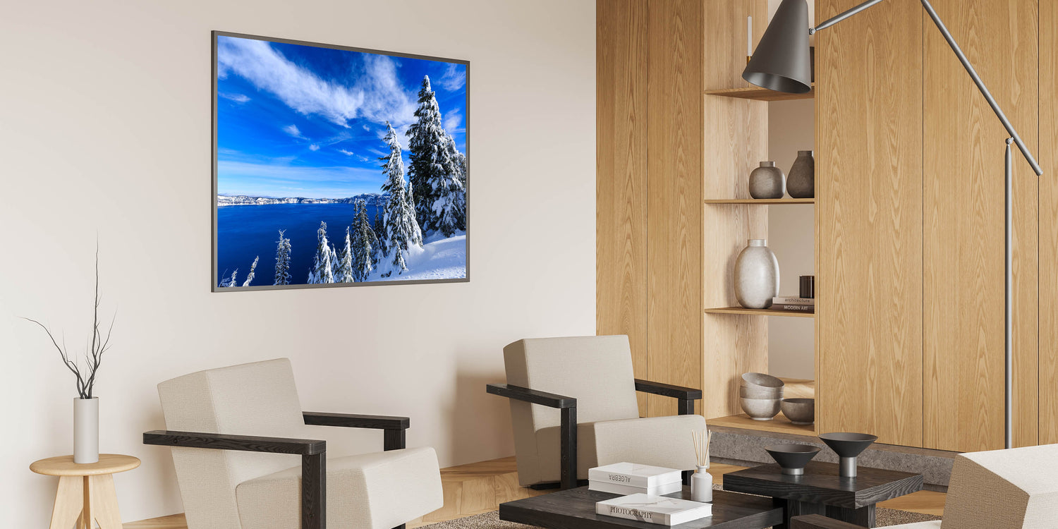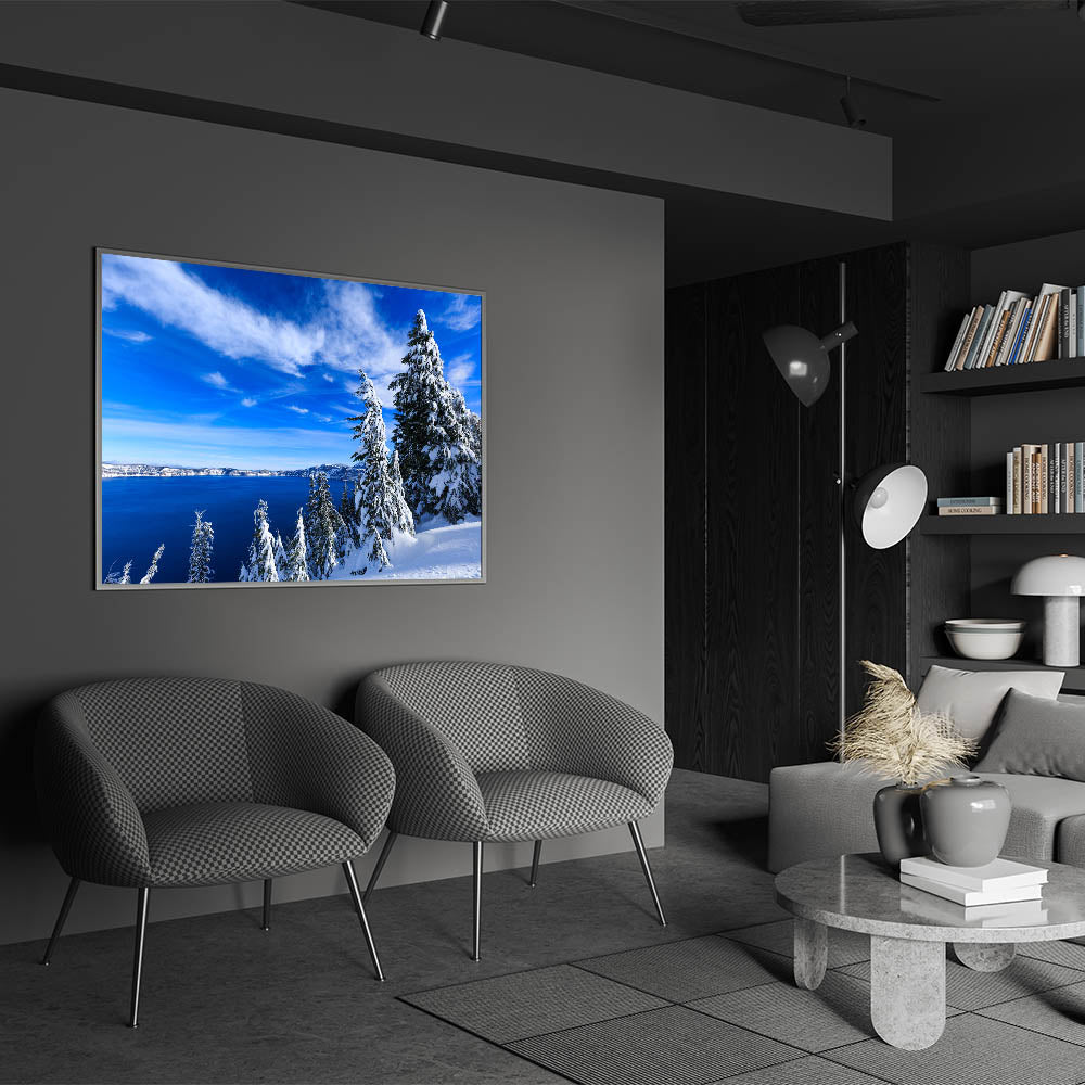 Perfect for nature lovers and winter enthusiasts, this print brings the quiet beauty of Crater Lake in winter to any setting. Enjoy the tranquility of snow-draped trees and pristine blue waters, adding a refreshing touch of the outdoors to your home.