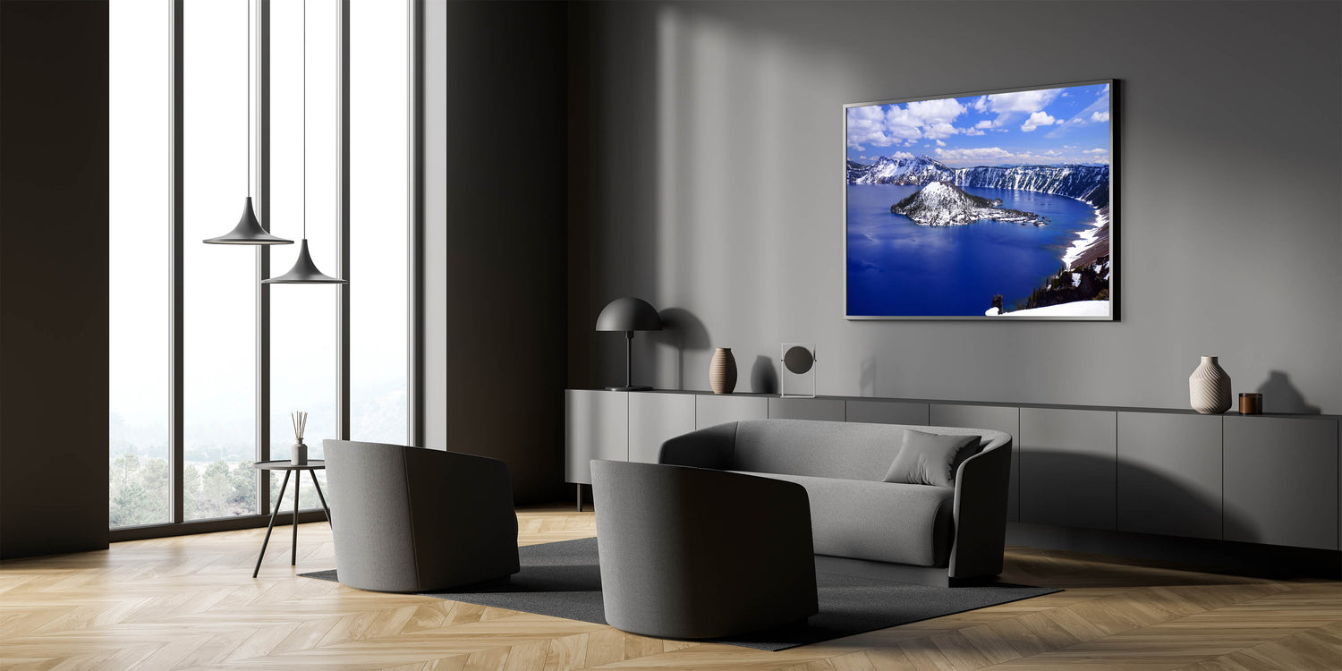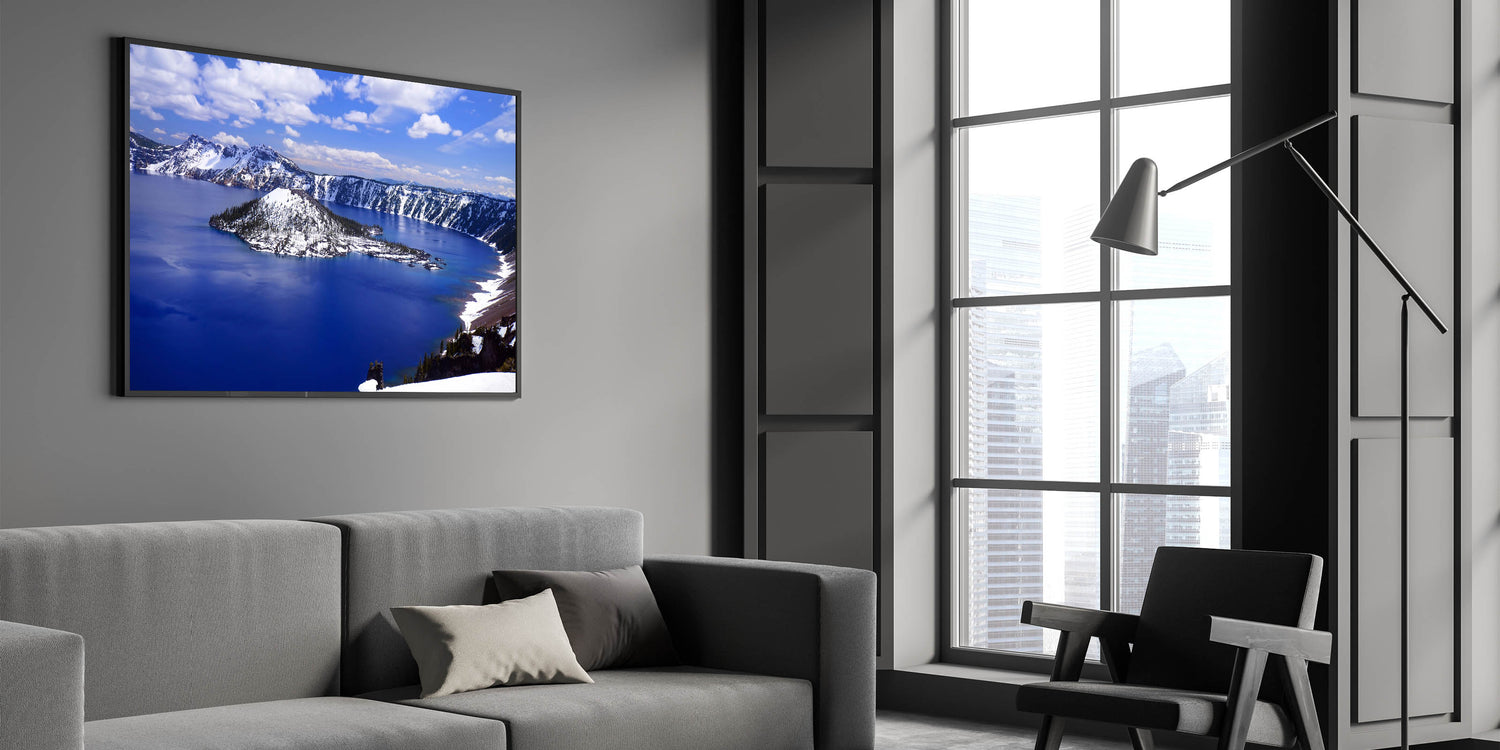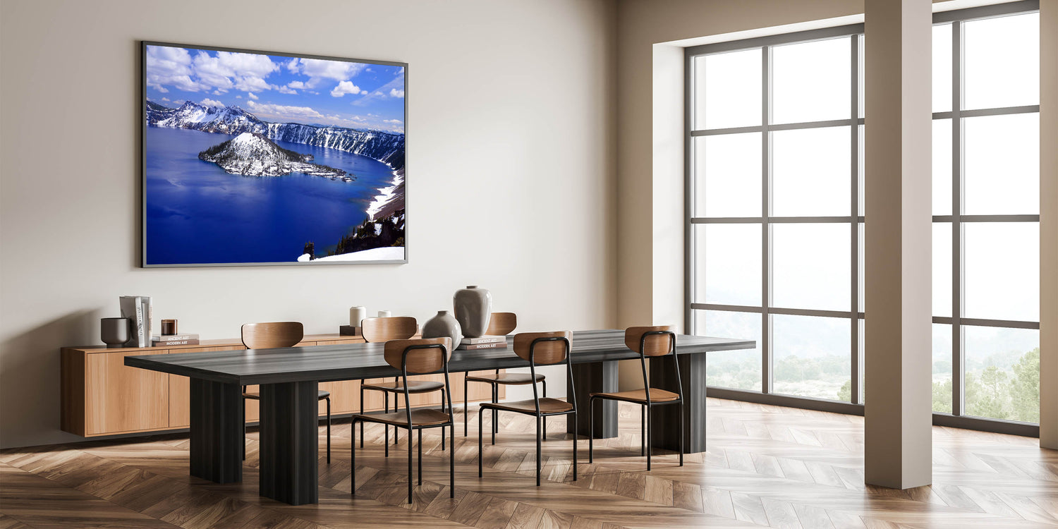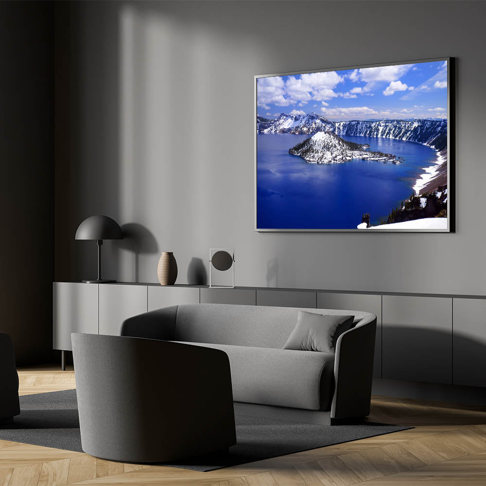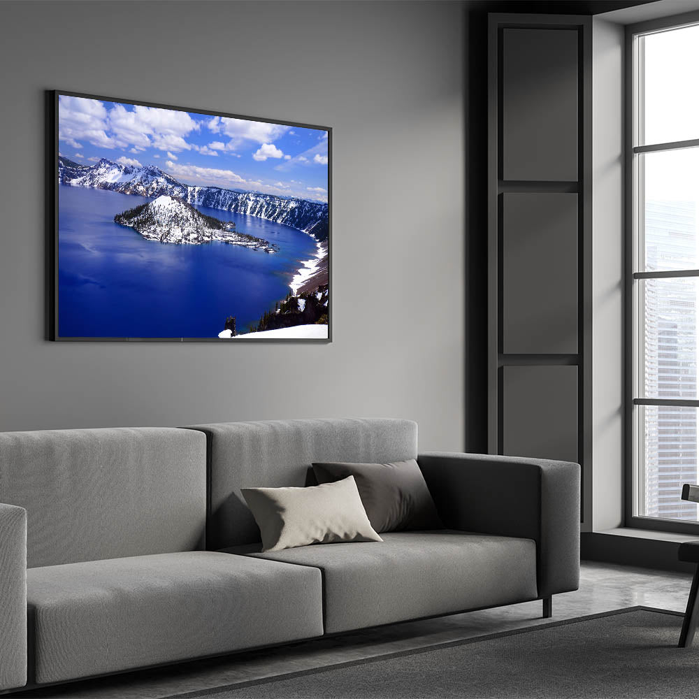 Transform your space with this stunning wall art capturing the serene beauty of Crater Lake National Park, featuring the iconic Wizard Island. Known for its mesmerizing deep blue waters and snow-capped landscape, Crater Lake offers an unparalleled view that brings tranquility and grandeur into any room.