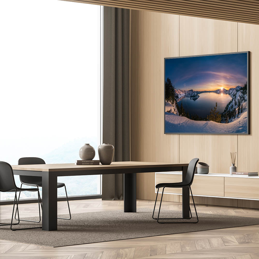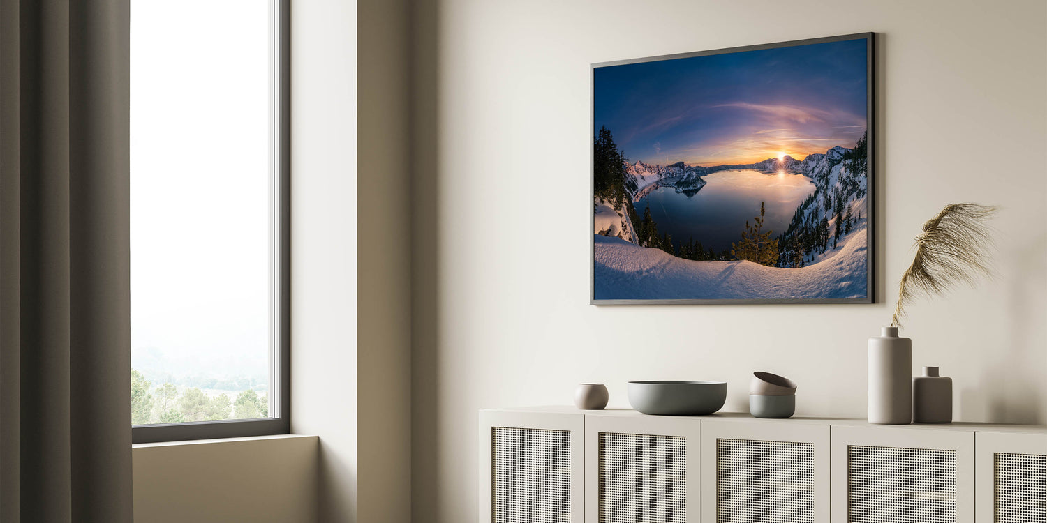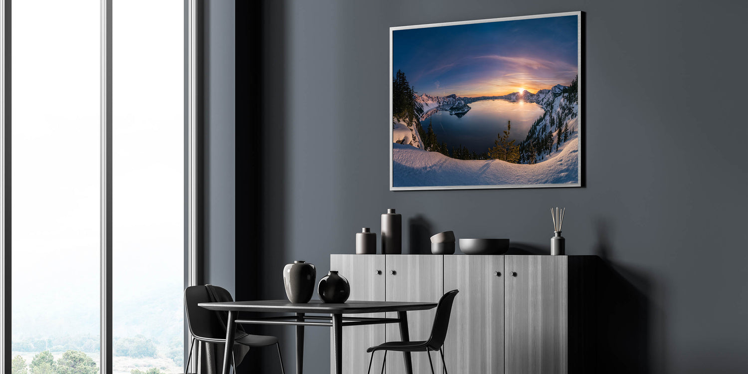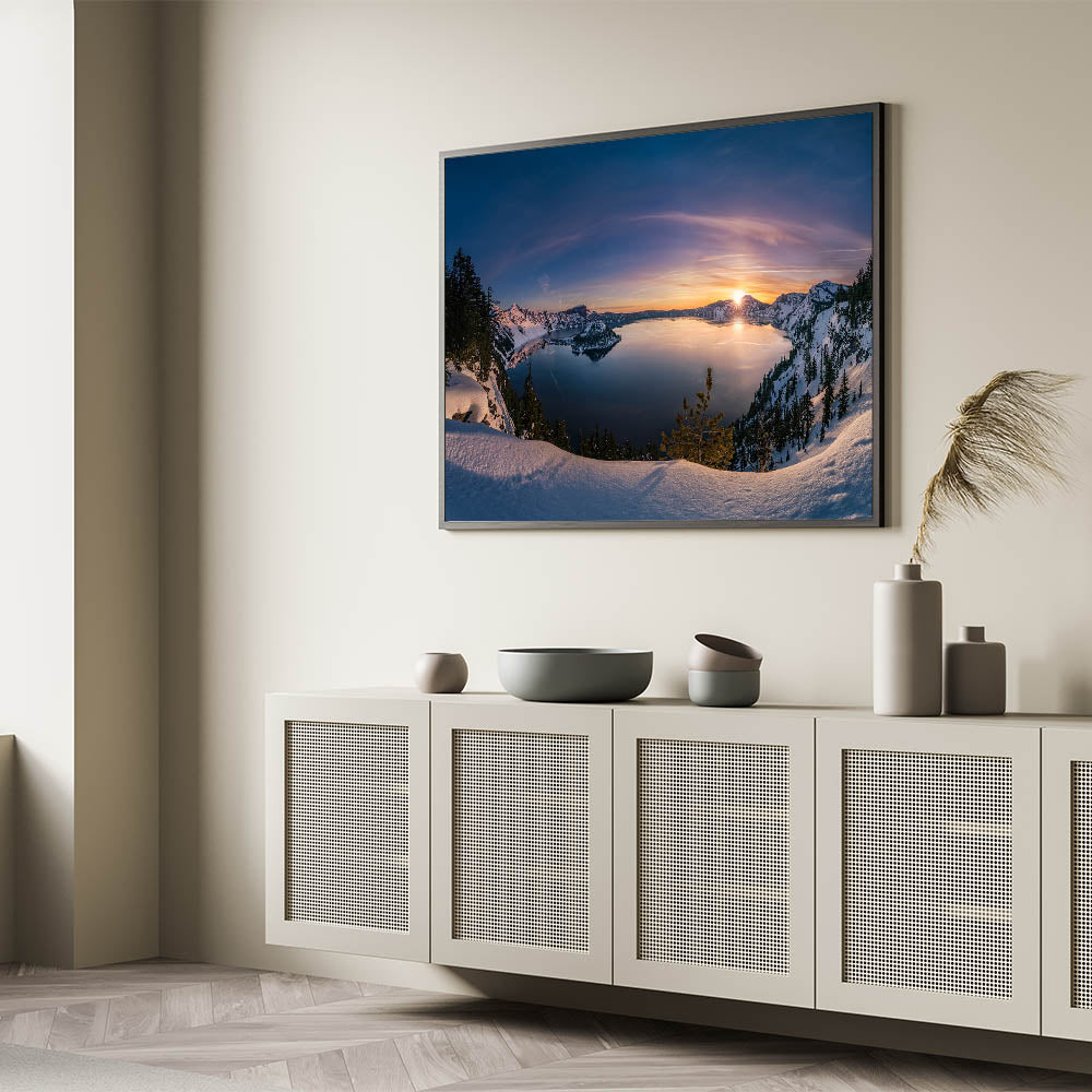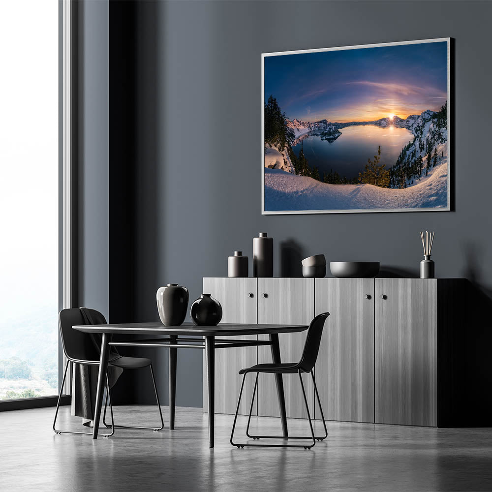 This winter sunrise view of Crater Lake is an ideal focal point for any room, offering a window into Oregon’s natural beauty. Enjoy the calming effect of this wintery landscape and the quiet grandeur of Crater Lake National Park every day.