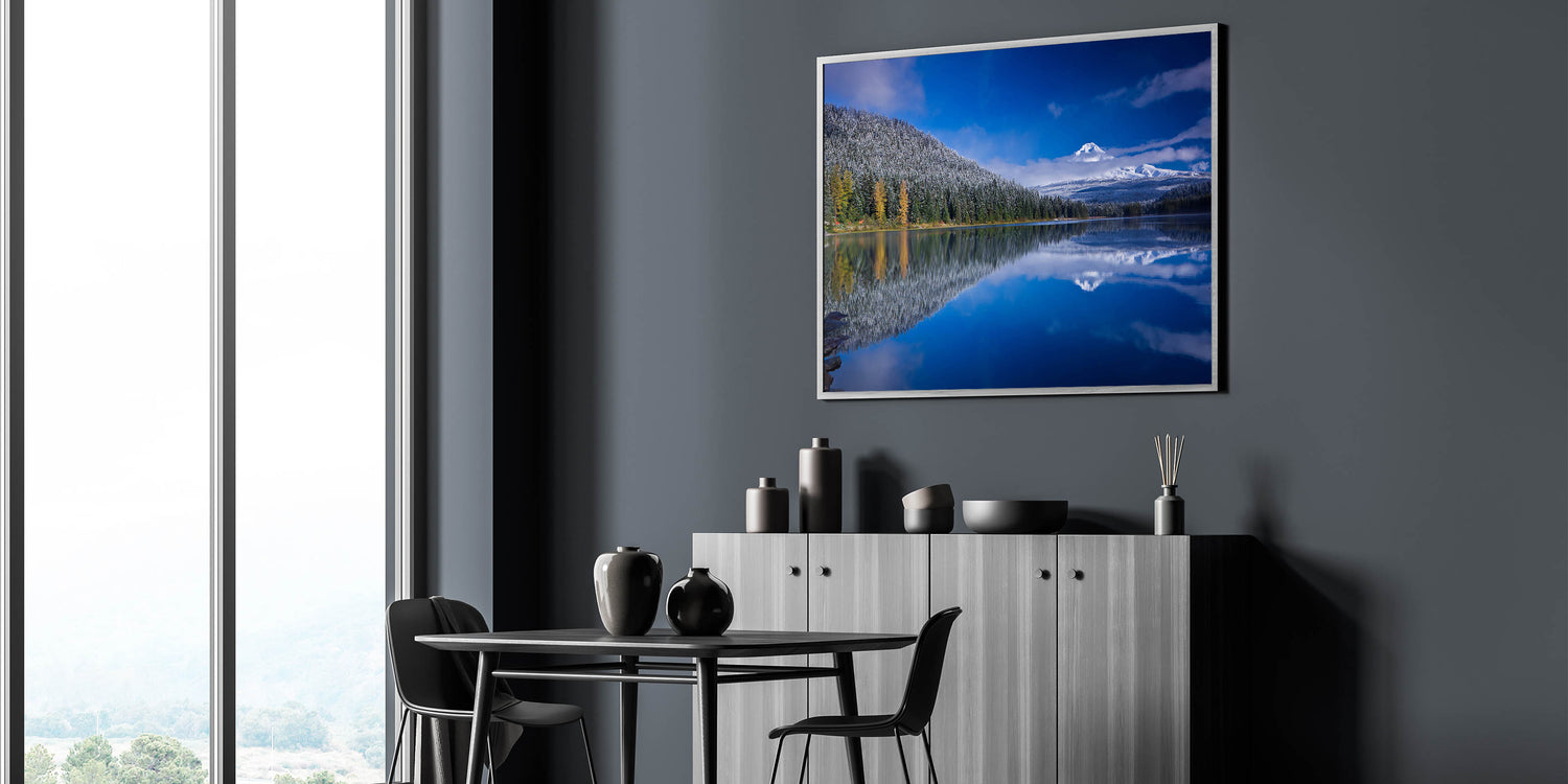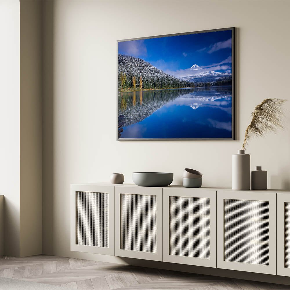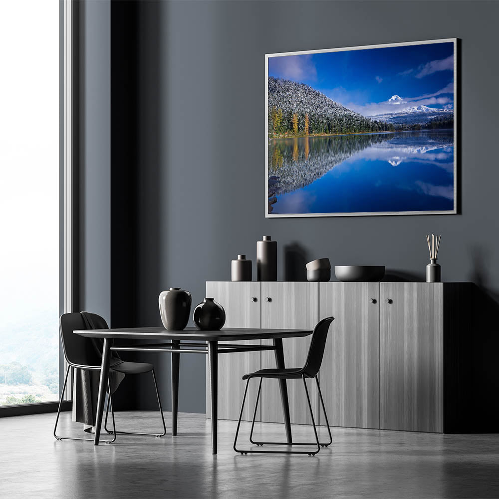 Immerse yourself in the tranquil beauty of Oregon’s Mount Hood with this stunning wall art, showcasing a snow-dusted forest and a clear, reflective lake. Perfect for nature enthusiasts and those who love serene landscapes, this piece brings the calm of winter into your space.