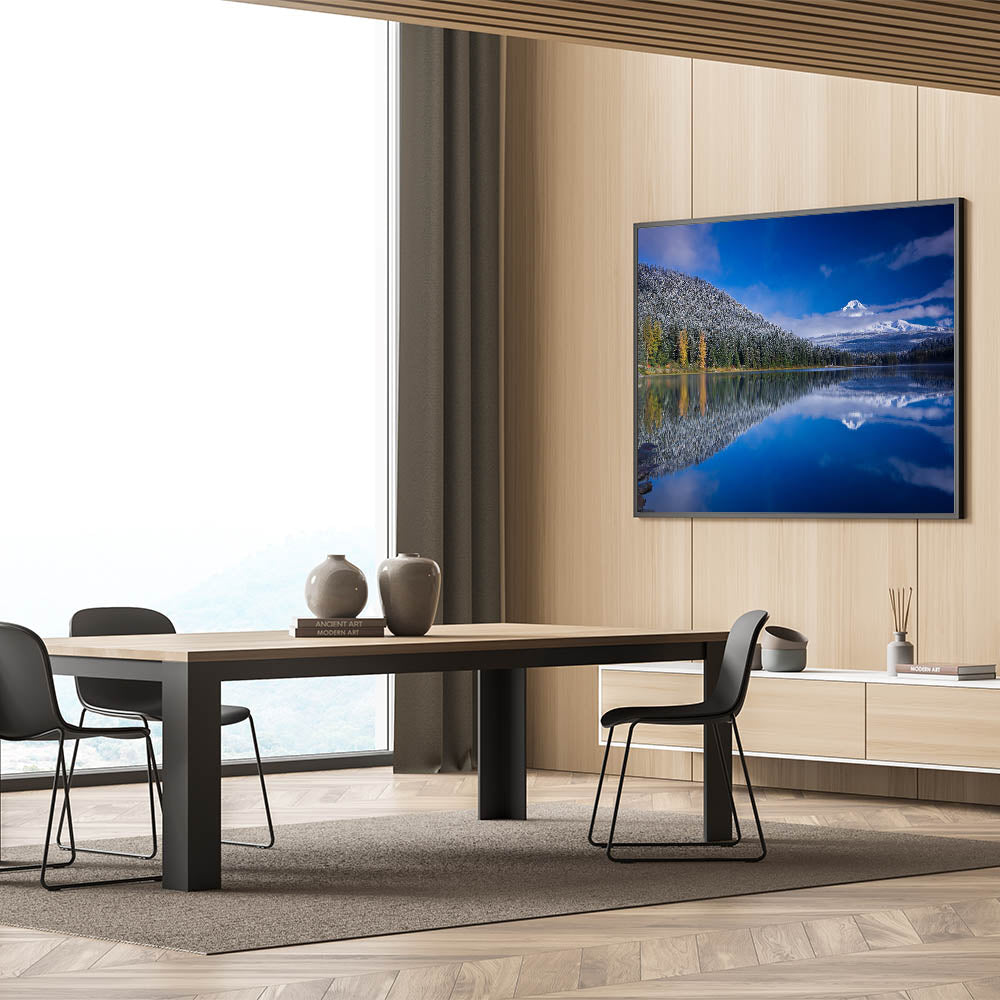 - High-Quality Print: Captures the intricate details of the snow-covered trees and mirrored lake for a truly captivating display