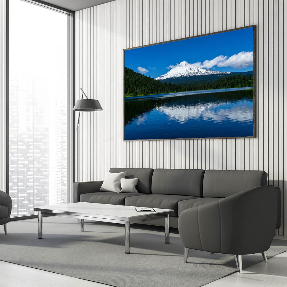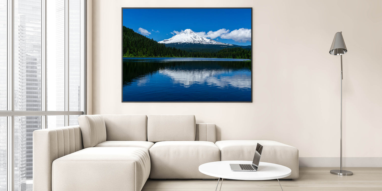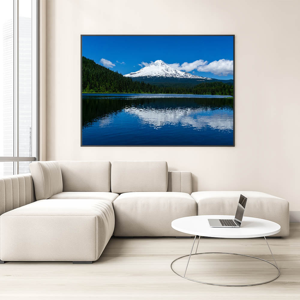 Enhance your decor with the serene reflection of Mount Hood and enjoy the timeless elegance this artwork brings to your space.