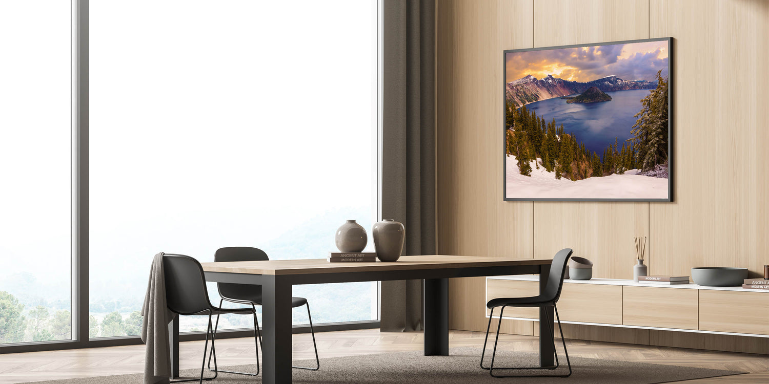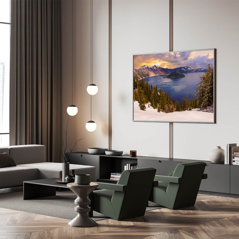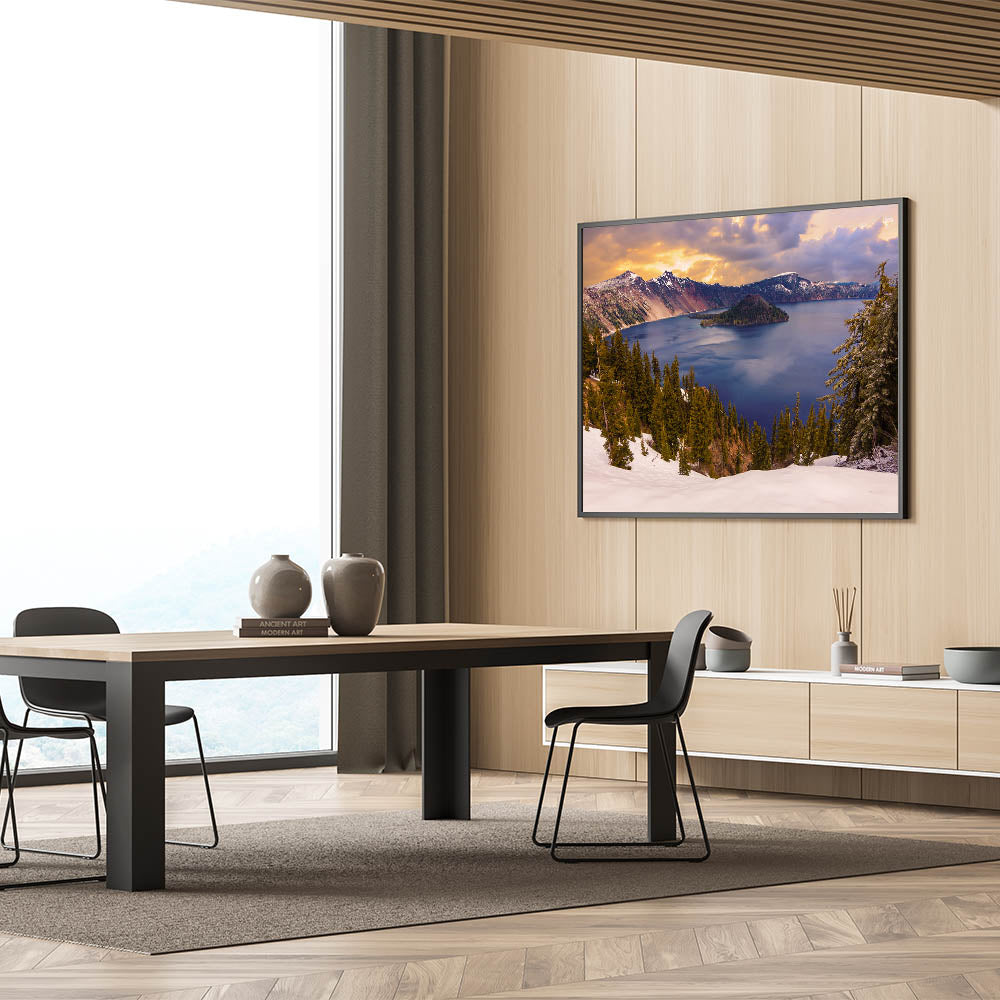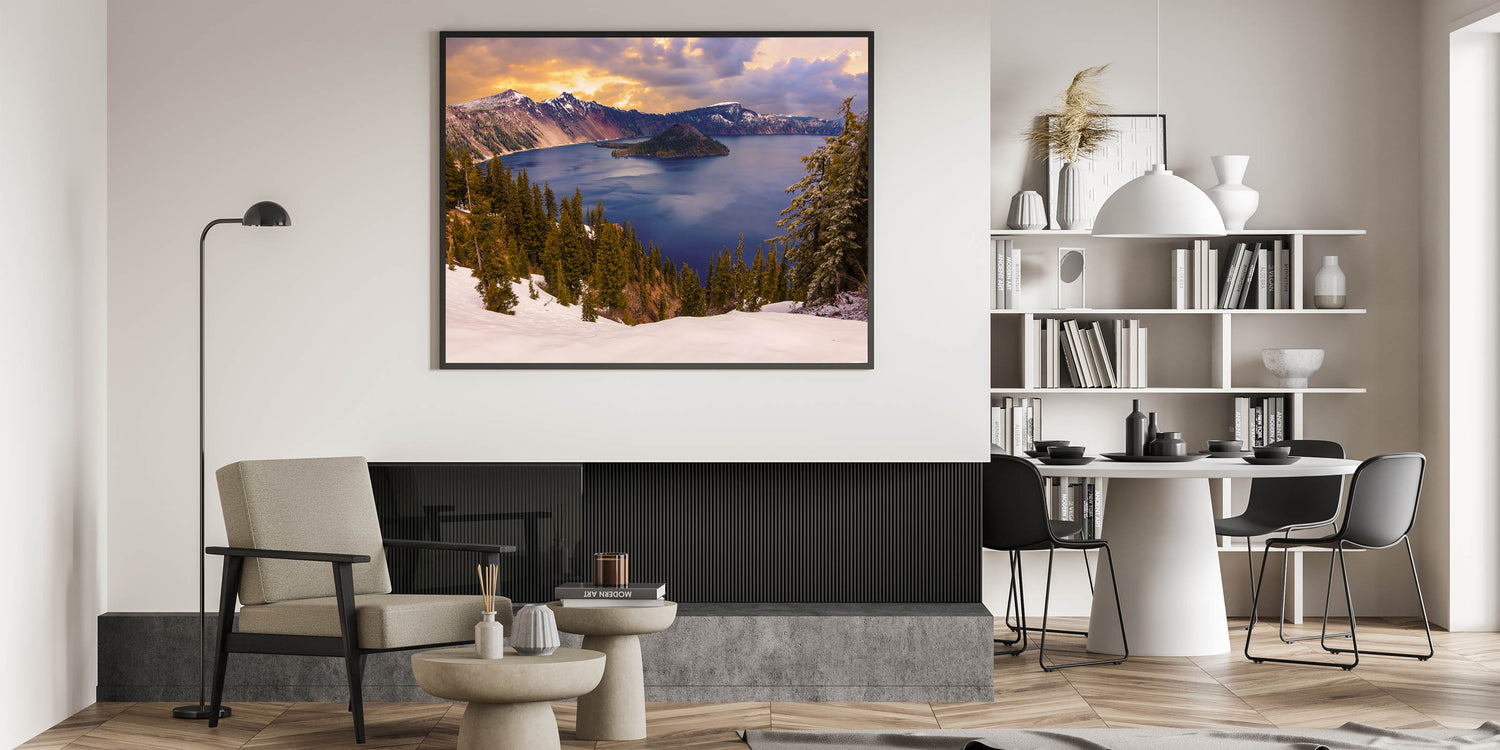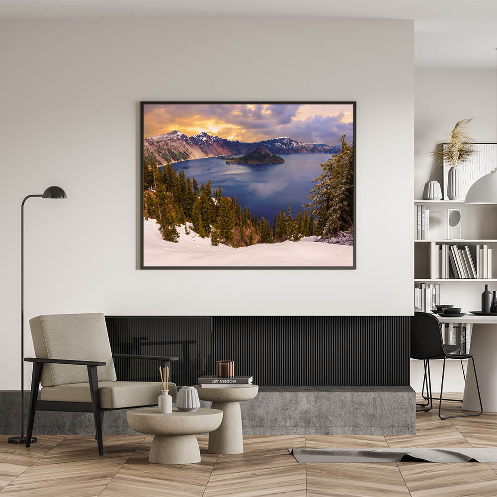 Ideal for nature enthusiasts and art lovers, this framed print brings the scenic views of Crater Lake into your space. Elevate your interior with the timeless beauty of Wizard Island at sunset.