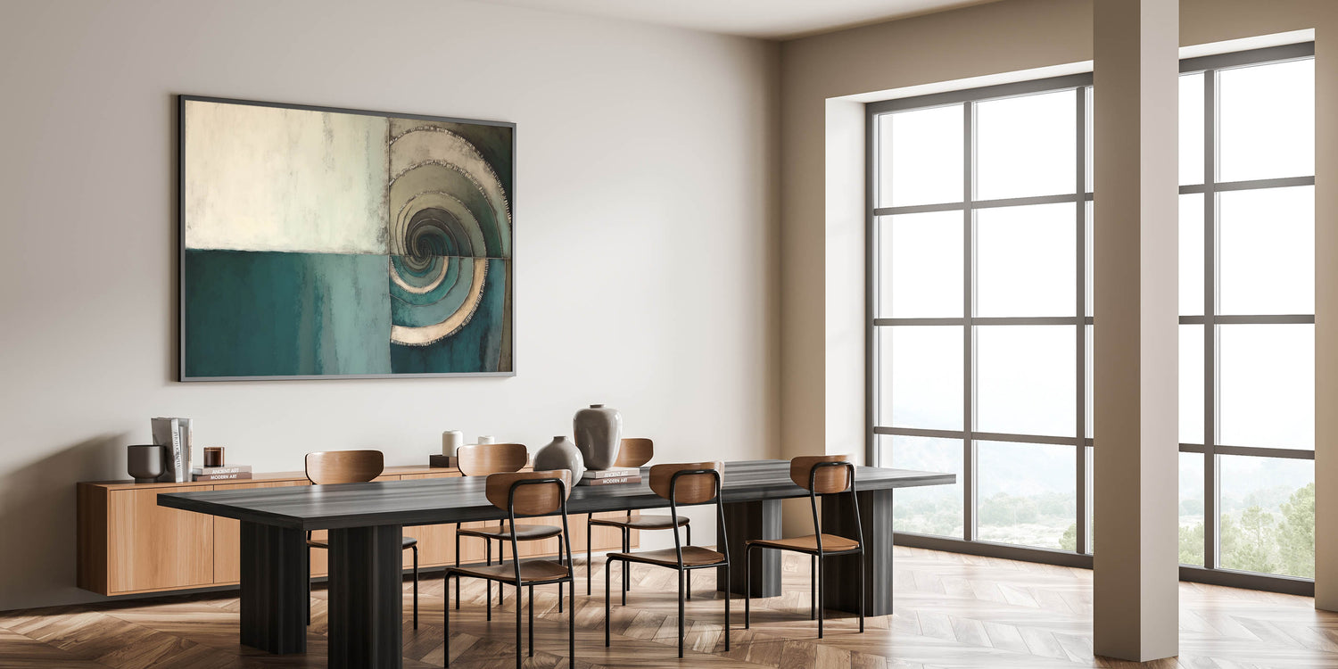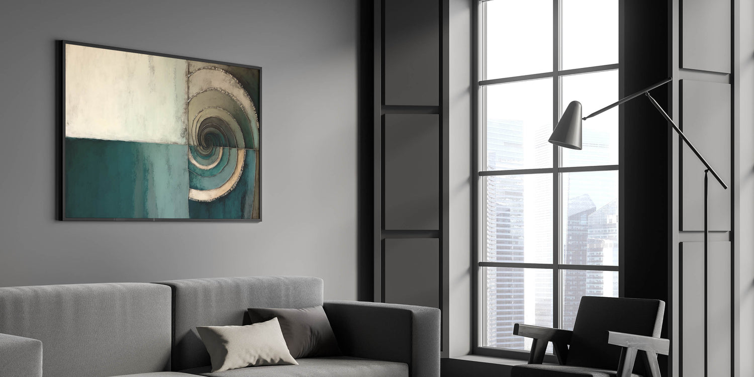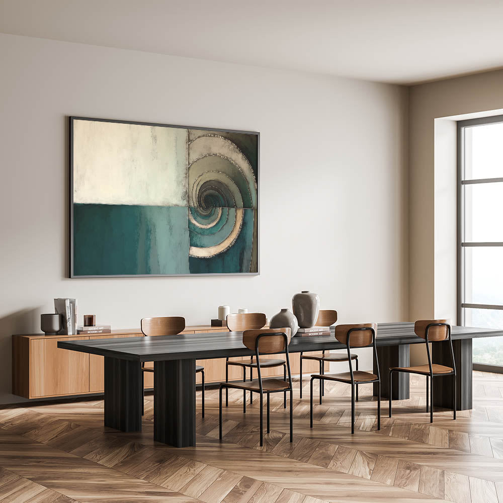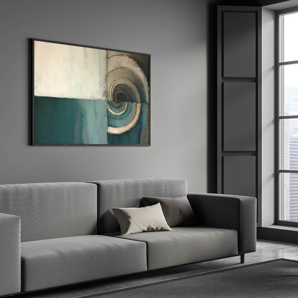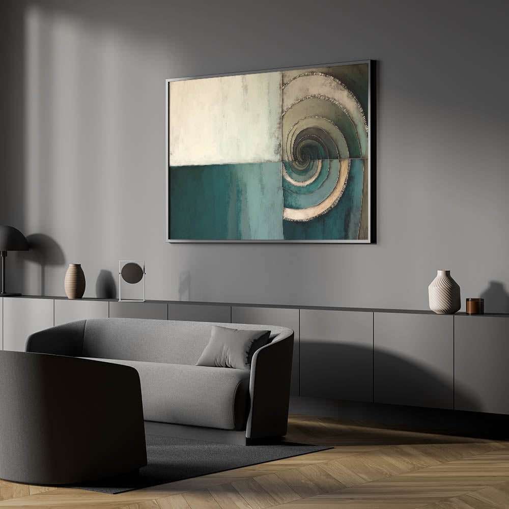 Add a touch of modern sophistication to your décor with this layered spiral abstract art. The piece showcases a captivating spiral motif with intricate textures, set against a soothing blend of deep teal, soft beige, and muted gray tones. The geometric divisions and layered composition bring depth and visual interest, making this artwork an ideal focal point for contemporary interiors.
