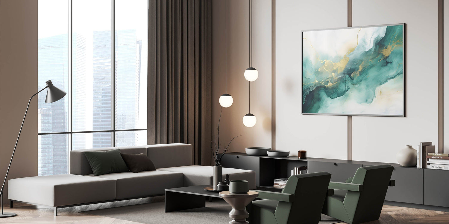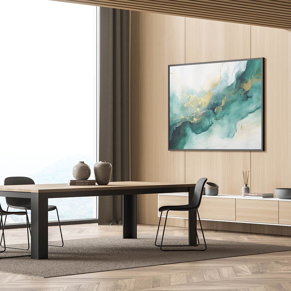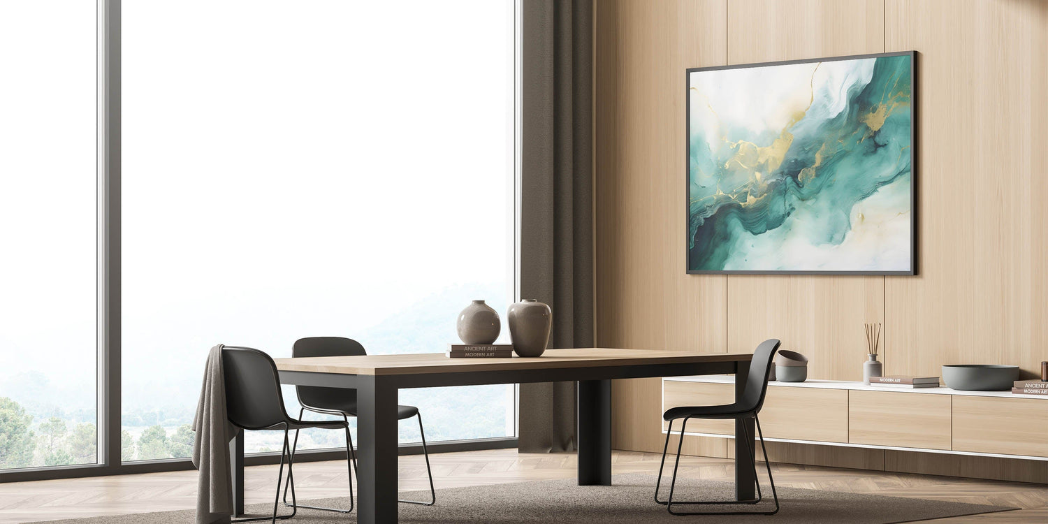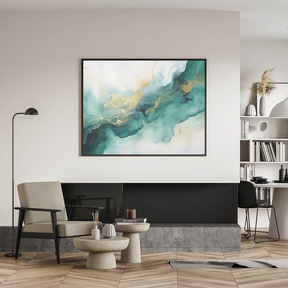 Add a touch of elegance and tranquility to your space with this modern fluid art print. Featuring a harmonious blend of deep forest green, teal, soft beige, and shimmering gold, this artwork flows like natural marble, creating a luxurious and calming atmosphere. The fluid movement and delicate gold highlights make it a perfect addition to contemporary interiors.