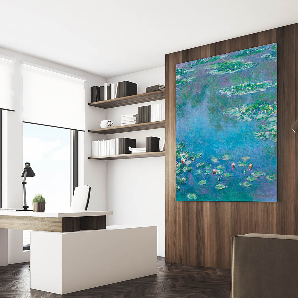 Immerse yourself in the tranquility of Claude Monet's Water Lilies, one of the most celebrated masterpieces of the Impressionist movement. This artwork beautifully captures the reflective surface of a serene pond, dotted with vibrant pink lilies and surrounded by lush greenery. Monet’s signature brushstrokes and use of light and color create a calming, dreamlike effect, making this piece an exquisite addition to any space.