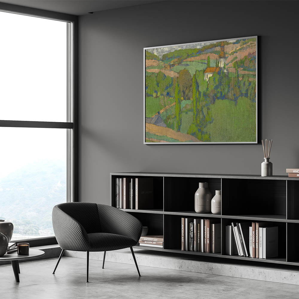 Add a touch of tranquility to your space with this serene Expressionist countryside landscape wall art. Depicting a peaceful village surrounded by lush green fields and rolling hills, this painting blends vibrant blues and greens with earthy tones to create a harmonious and soothing visual experience. Its intricate brushwork and emotive color palette embody the timeless charm of Expressionist art.
