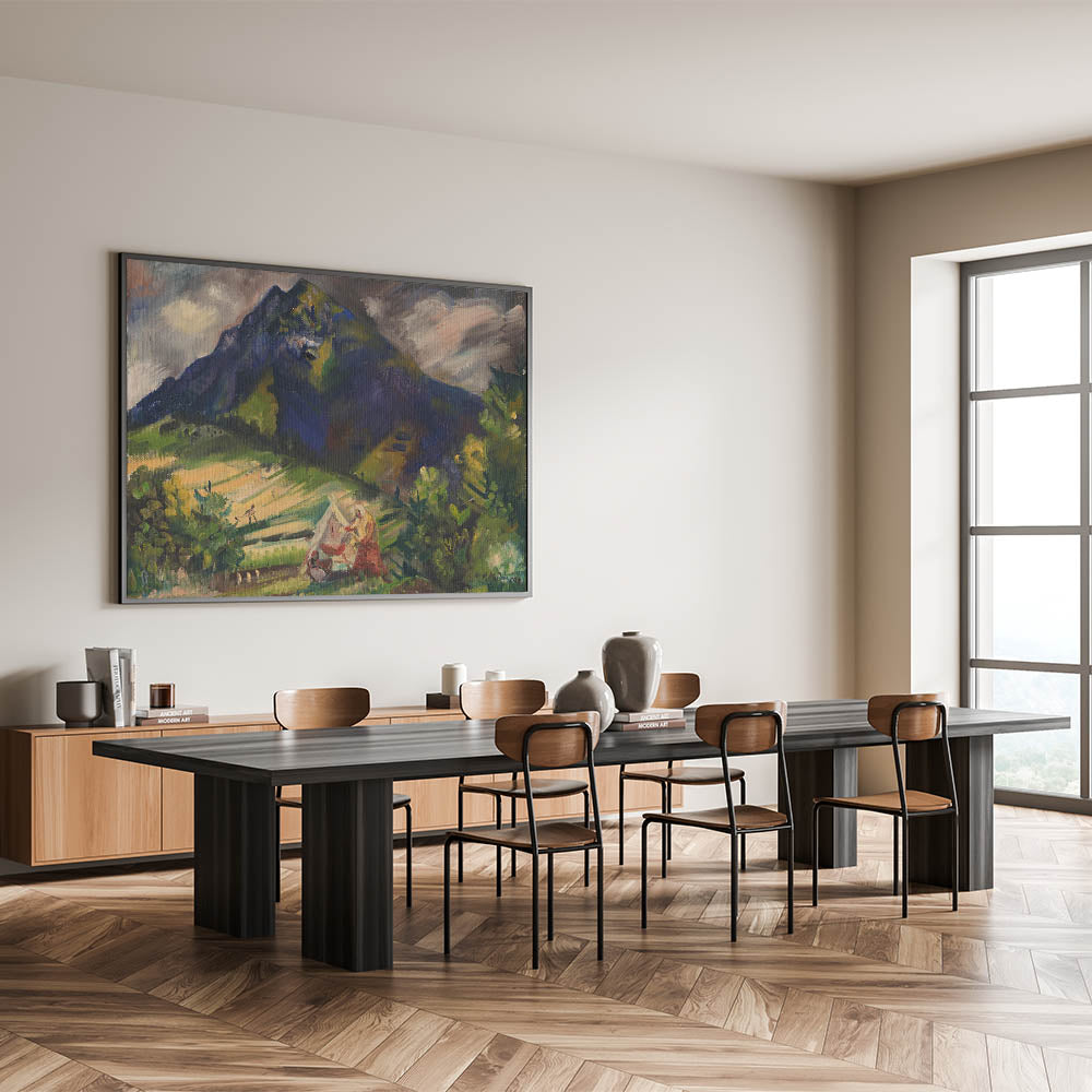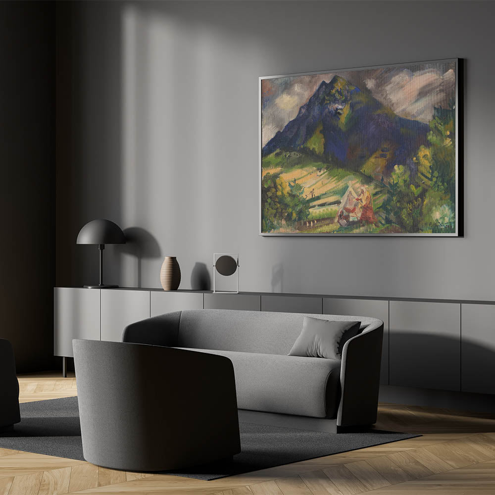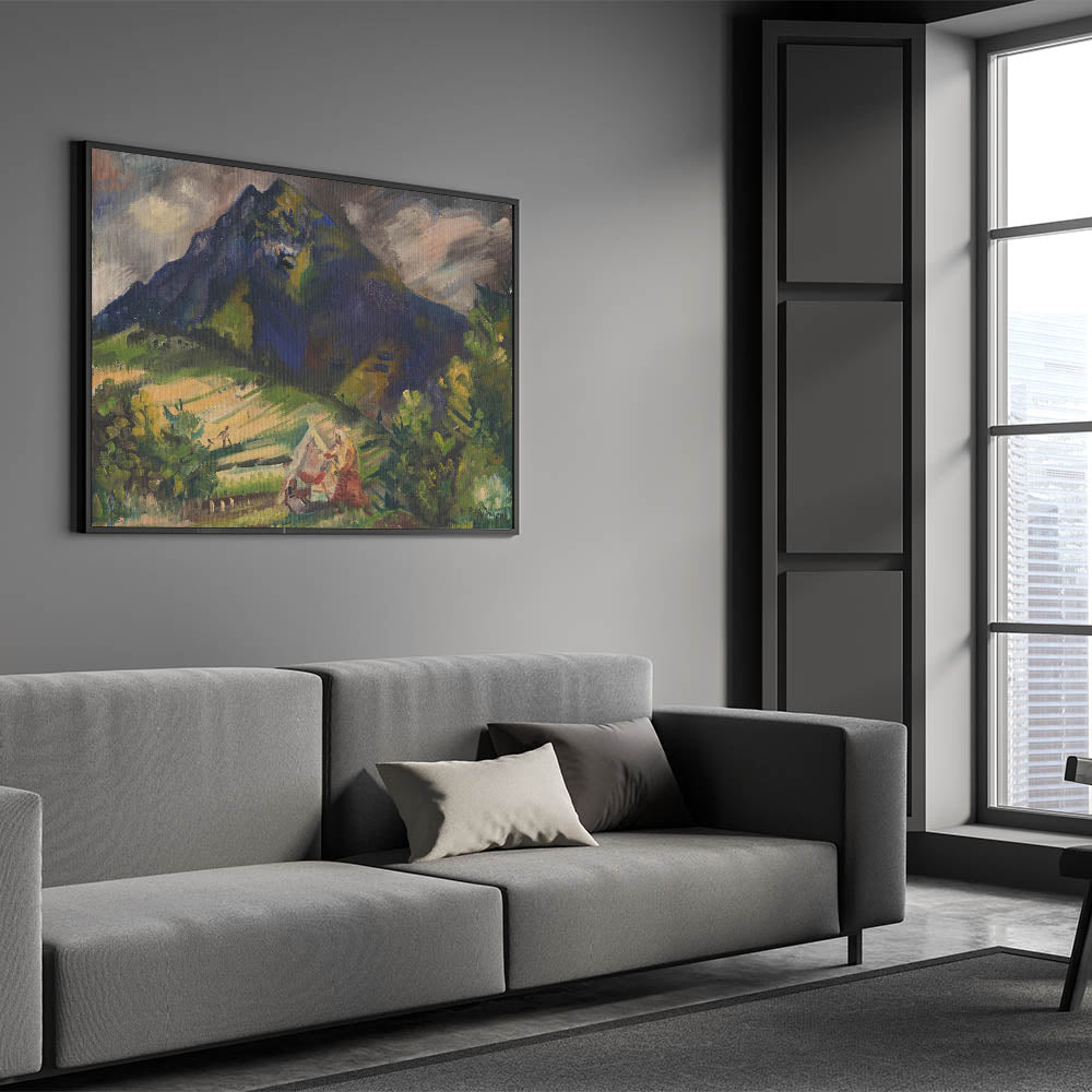 Immerse yourself in the majesty of nature with Arnold Peter Weisz-Kubínčan’s "Choc." This Expressionist masterpiece portrays a towering mountain beneath a moody sky, surrounded by vibrant fields and lush greenery. The interplay of rich blues, deep greens, and golden yellows captures the energy and serenity of the natural world.