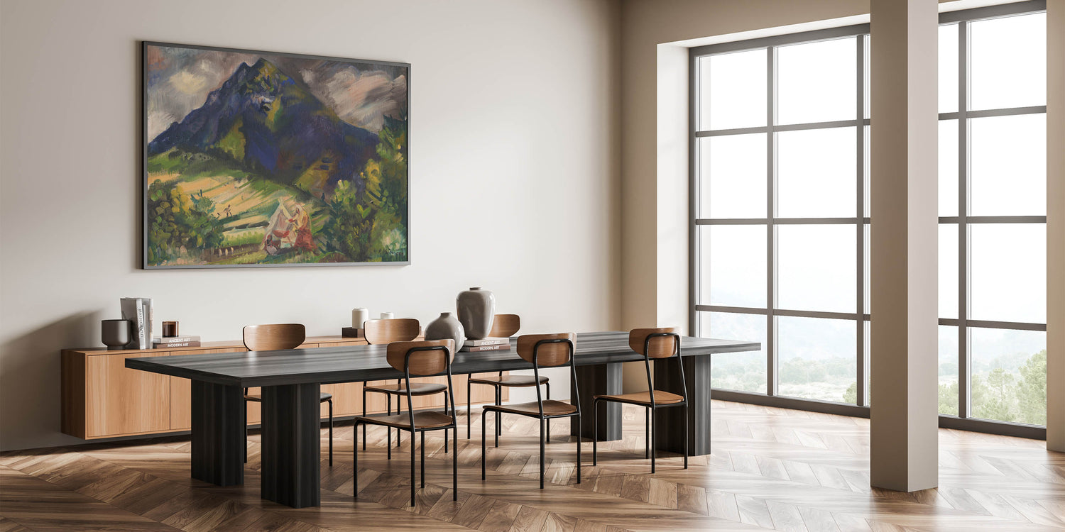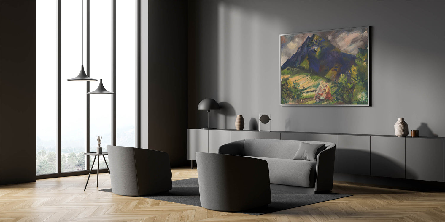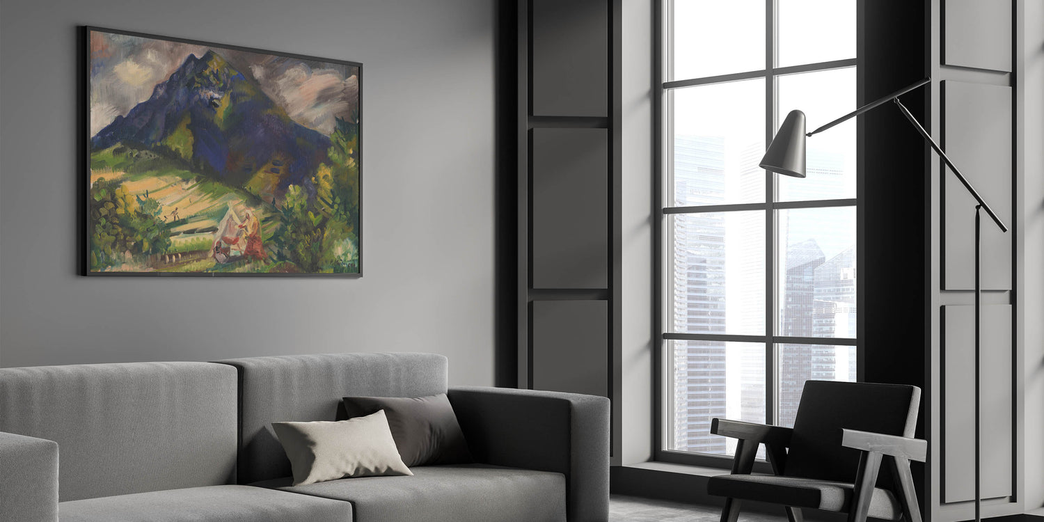 Immerse yourself in the majesty of nature with Arnold Peter Weisz-Kubínčan’s "Choc." This Expressionist masterpiece portrays a towering mountain beneath a moody sky, surrounded by vibrant fields and lush greenery. The interplay of rich blues, deep greens, and golden yellows captures the energy and serenity of the natural world.