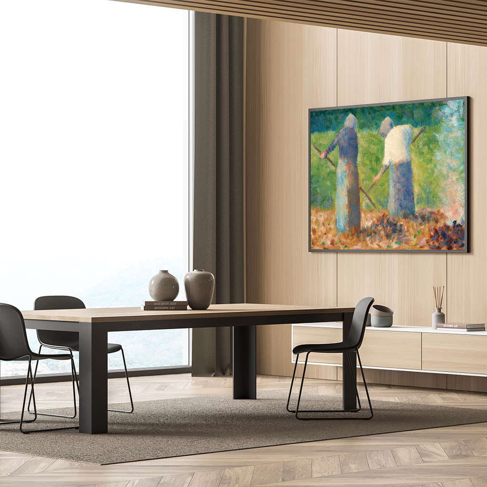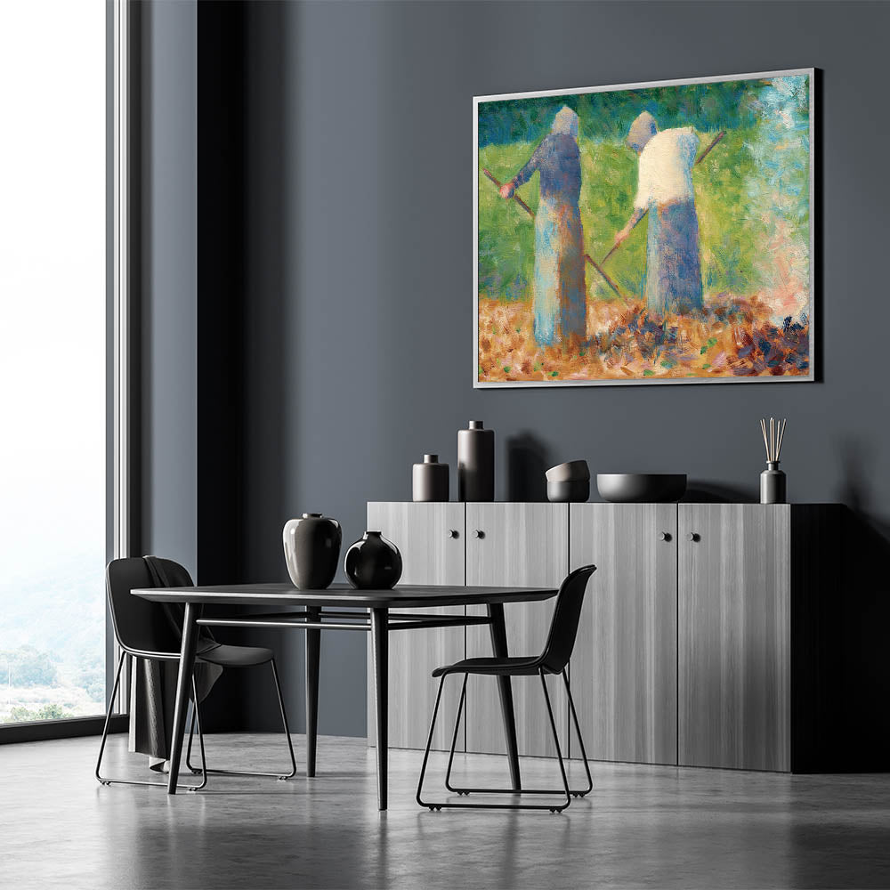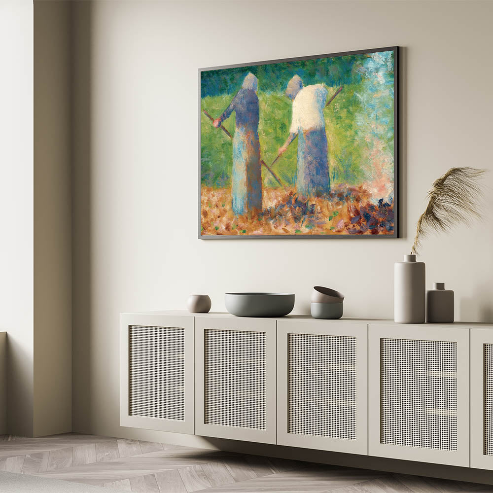 Embrace the charm of rural Impressionism with this serene wall art, inspired by Georges Seurat's portrayal of haymakers in the countryside. This artwork captures two figures in soft, pastel tones against a lush green landscape, evoking a peaceful, timeless moment in nature. The subtle, layered brushstrokes bring a sense of depth and movement, making this piece a captivating addition to any home.