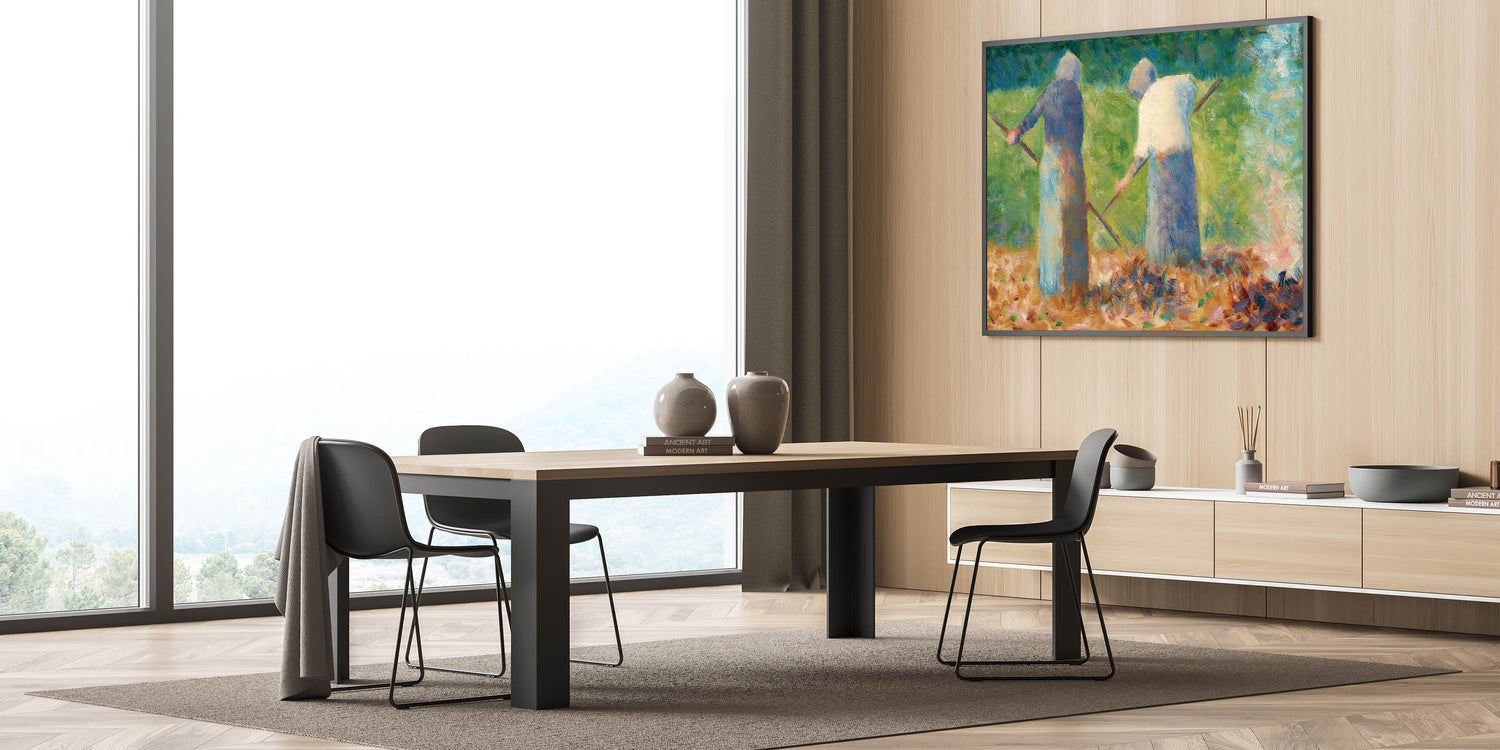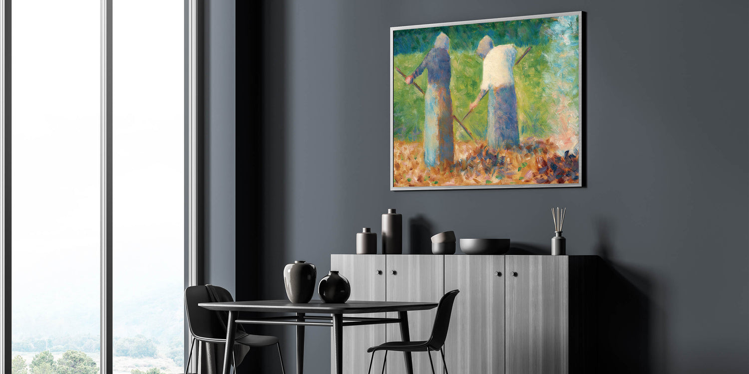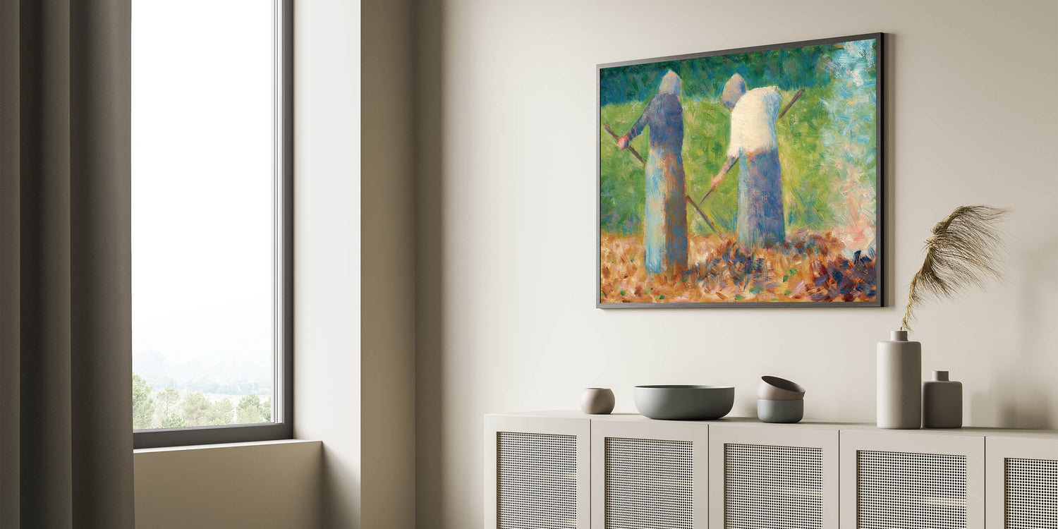 Embrace the charm of rural Impressionism with this serene wall art, inspired by Georges Seurat's portrayal of haymakers in the countryside. This artwork captures two figures in soft, pastel tones against a lush green landscape, evoking a peaceful, timeless moment in nature. The subtle, layered brushstrokes bring a sense of depth and movement, making this piece a captivating addition to any home.