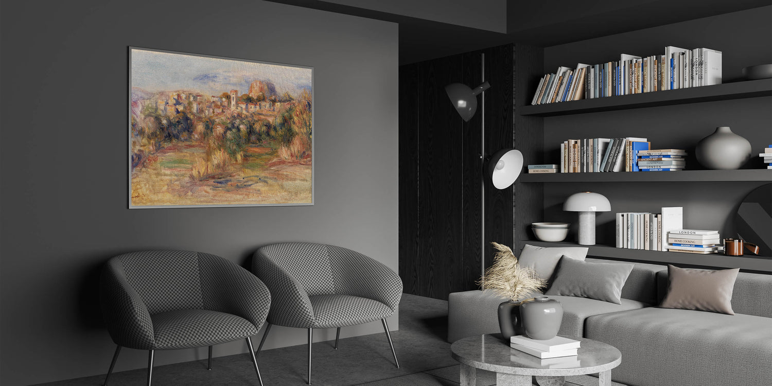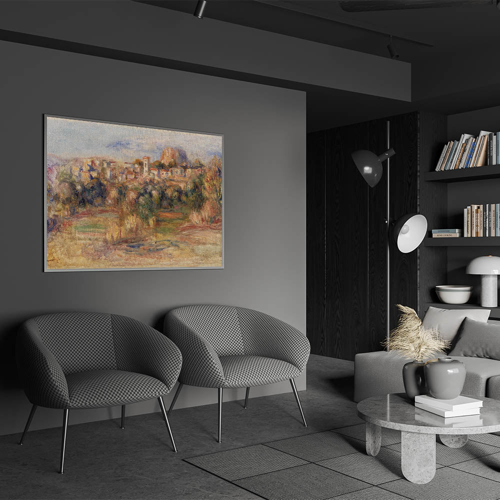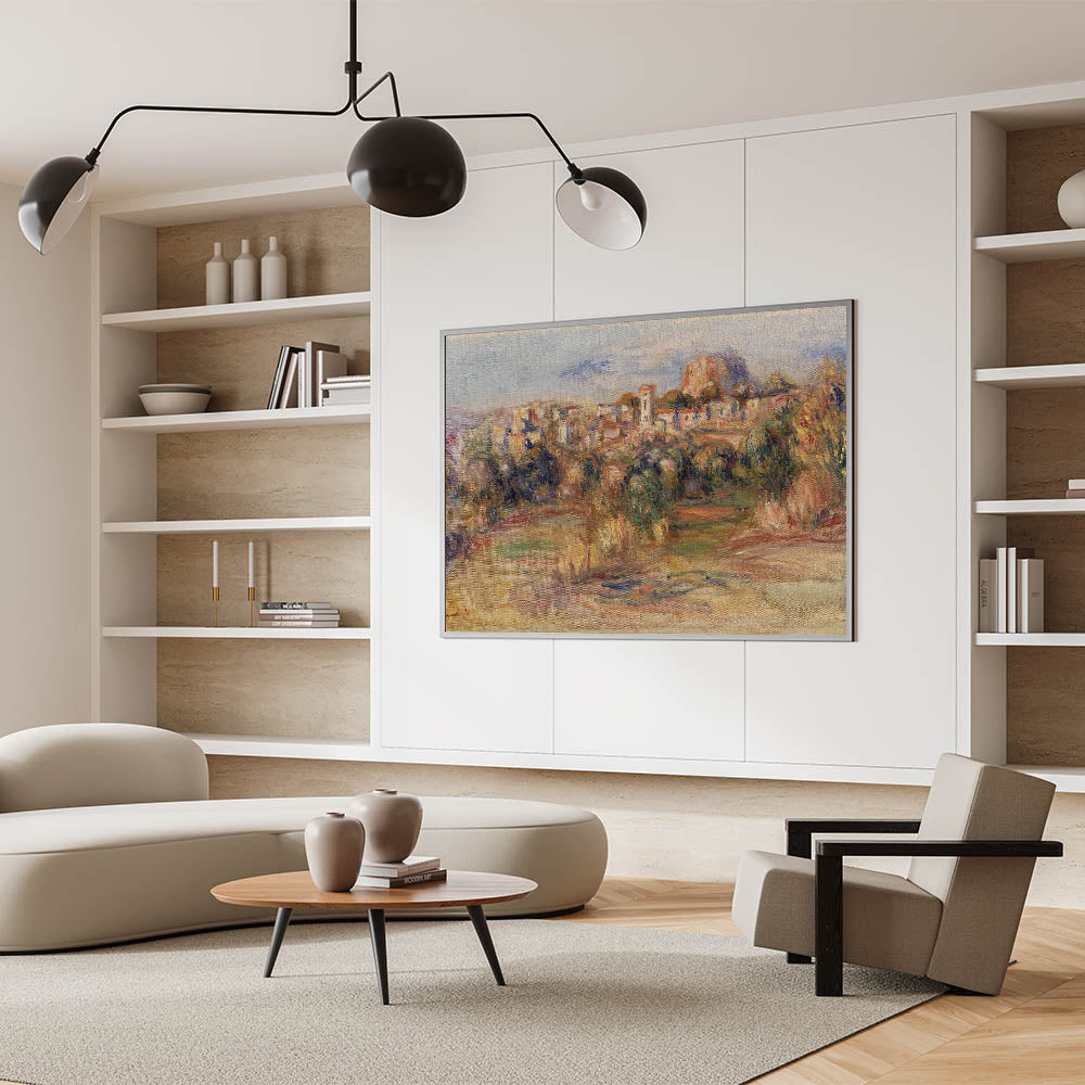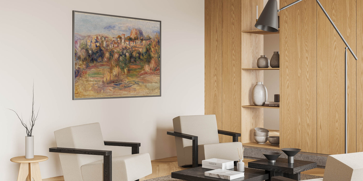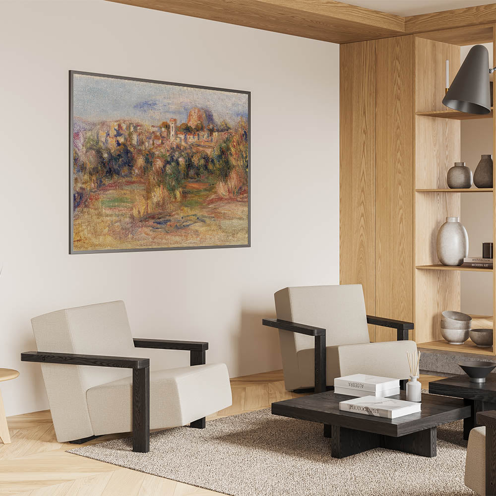 Invite the warm, rustic beauty of the French countryside into your home with Pierre-Auguste Renoir’s "Landscape, La Gaude." This Impressionist painting captures a peaceful rural village with soft, earthy tones and gentle brushstrokes, embodying Renoir’s unique ability to convey tranquility and charm. The scene’s muted colors and flowing textures transport viewers to a serene, sunlit landscape, making it an ideal choice for those who appreciate Impressionist landscapes and the allure of French pastoral scenes.