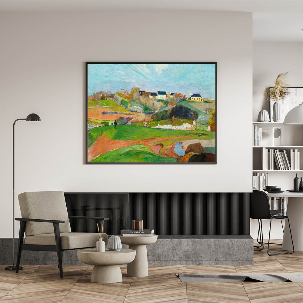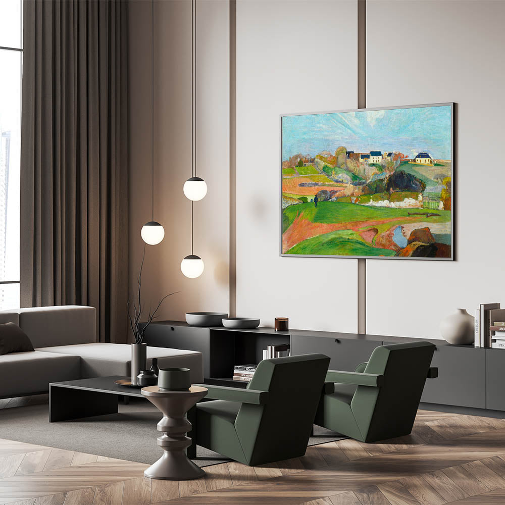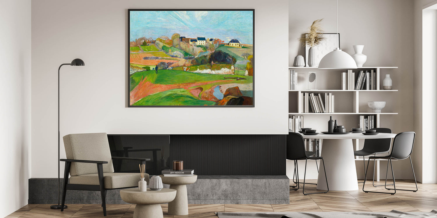 Introduce the vibrant energy of the French countryside to your decor with Paul Gauguin’s "Landscape at Le Pouldu." This Impressionist painting captures a rural scene in bold colors and defined shapes, showcasing Gauguin’s unique approach to form and palette. The bright greens, blues, and earthy reds bring the landscape to life, creating a dynamic, almost abstract view of the natural world. This artwork is ideal for art lovers who appreciate the striking, expressive style that Gauguin is celebrated for.
